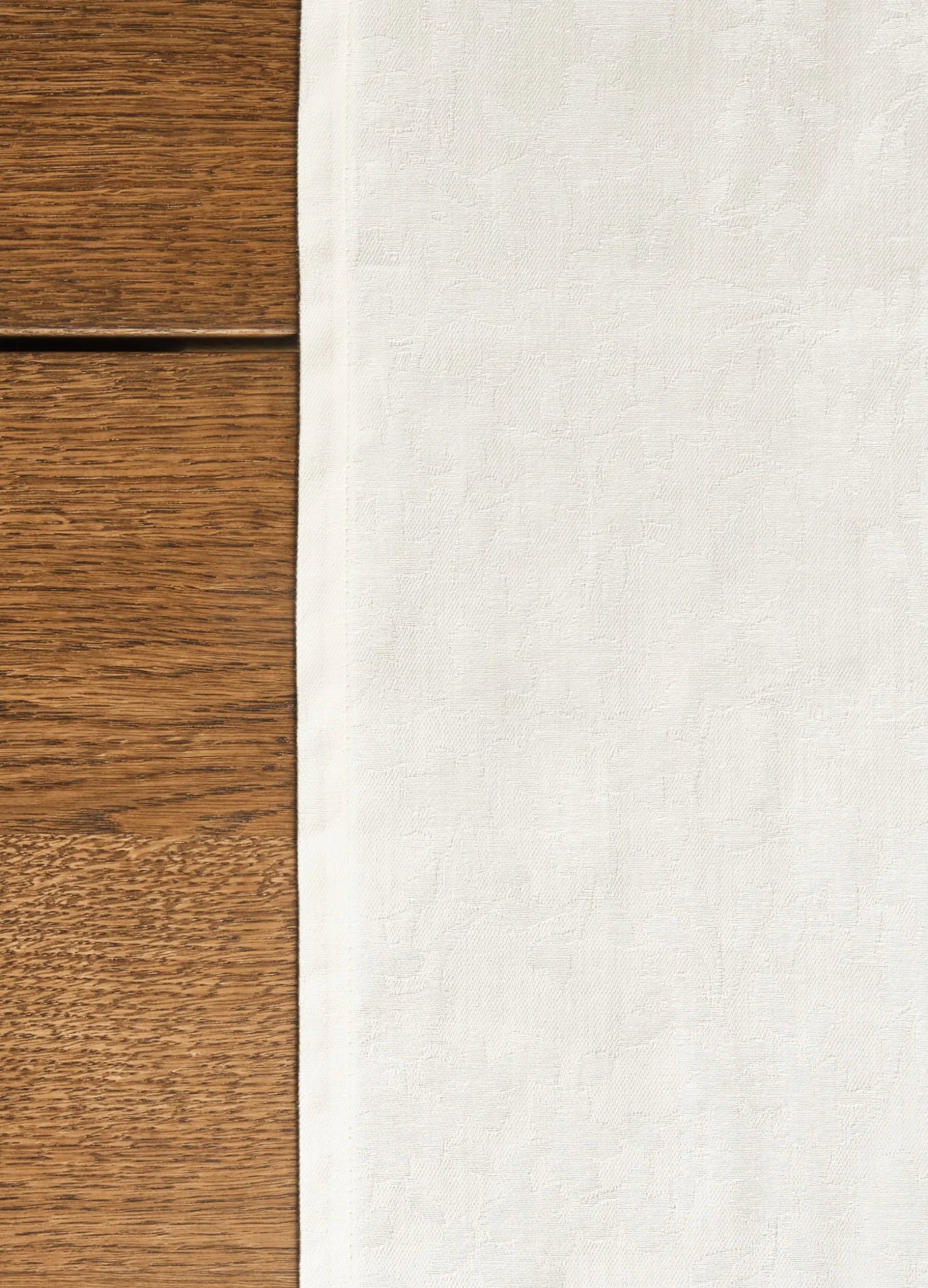 Runner elegante in puro cotone bianco avorio attraversato all-over da un motivo floreale tono su tono realizzato con lavorazione jacquard.