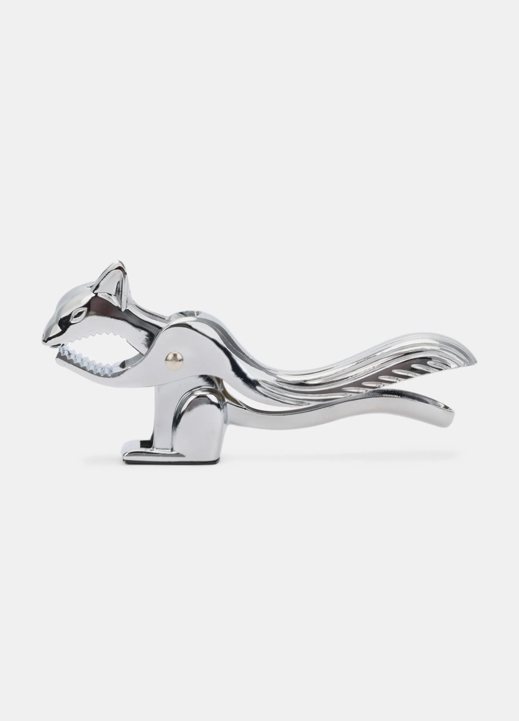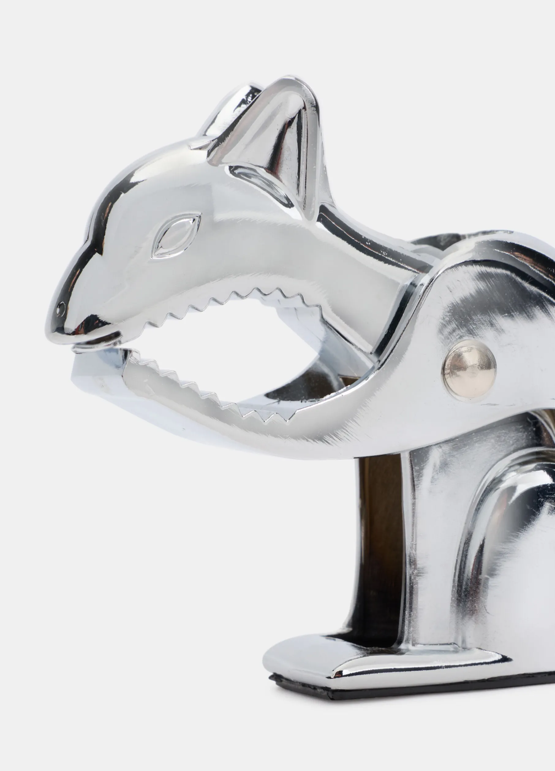 Schiaccianoci manuale in zinco con finitura lucida grigio argento, modellato per ricordare la forma fluida e sinuosa di uno scoiattolo. Dimensioni: 7,8 x 17,5 x 4,2 cm.
