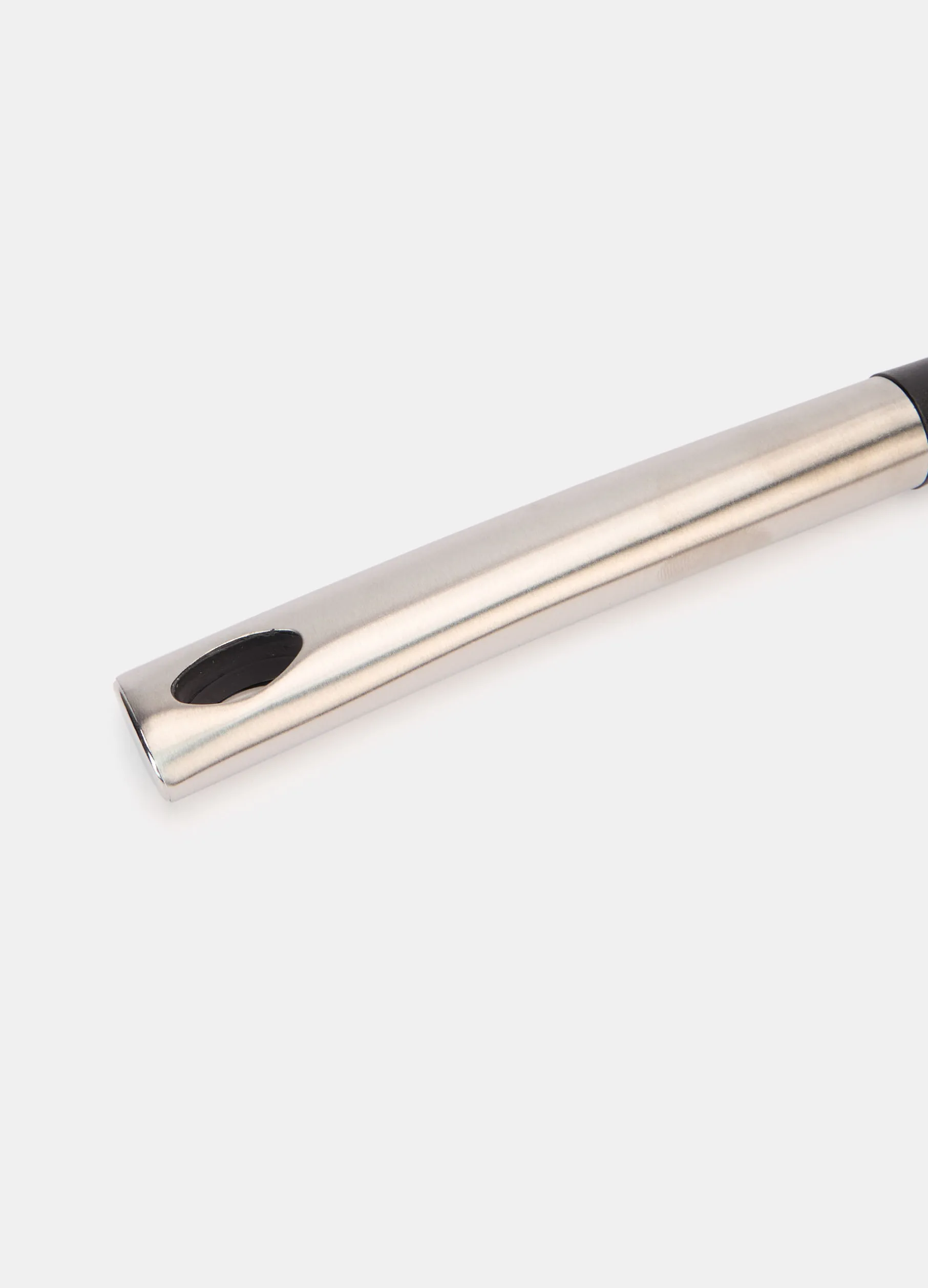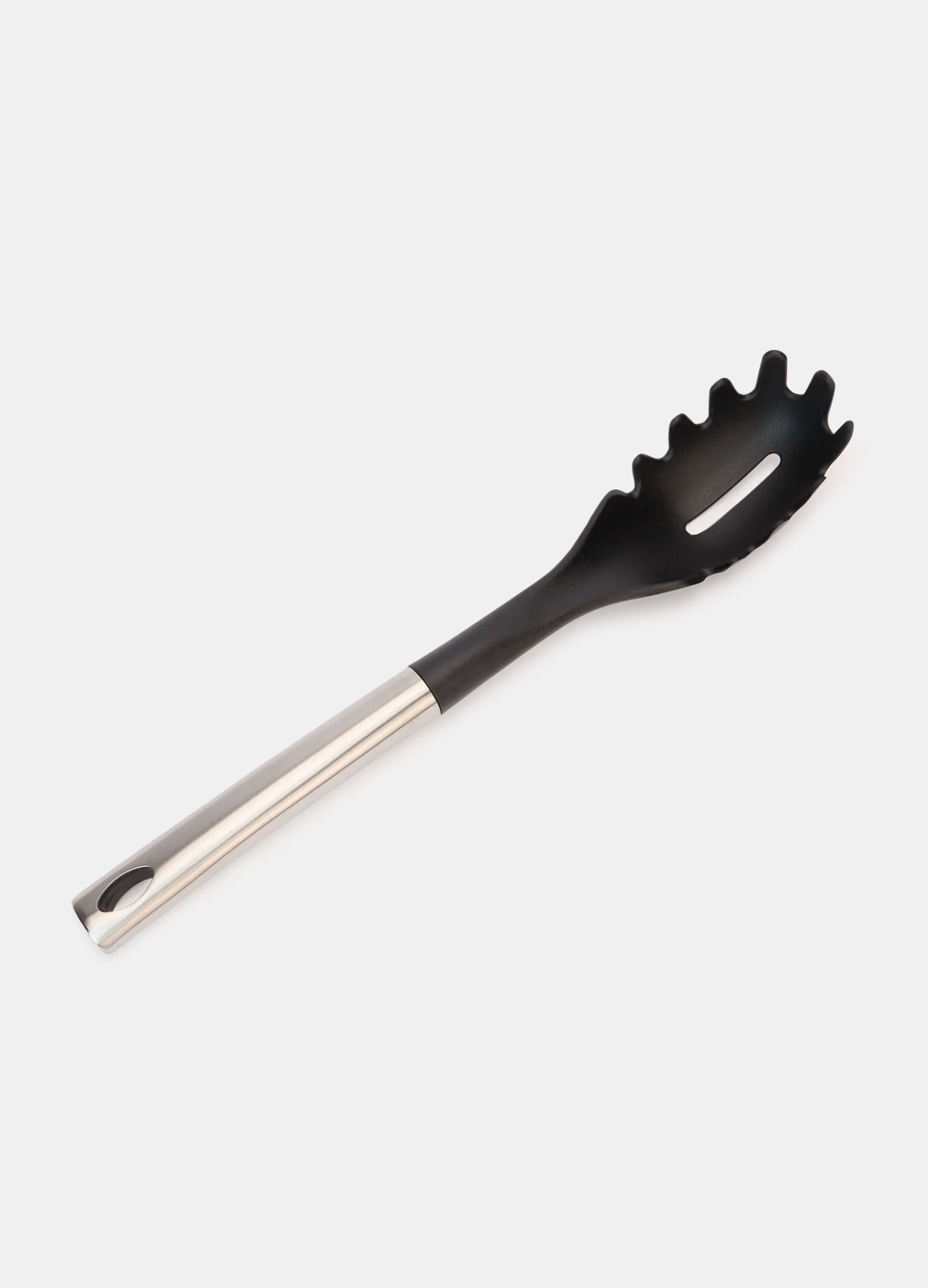 Pratico mestolo servispaghetti, con il caratteristico bordo dentellato, realizzato in poliammide nera, versatile e resistente. Con manico in metallo satinato e foro per appenderlo.
