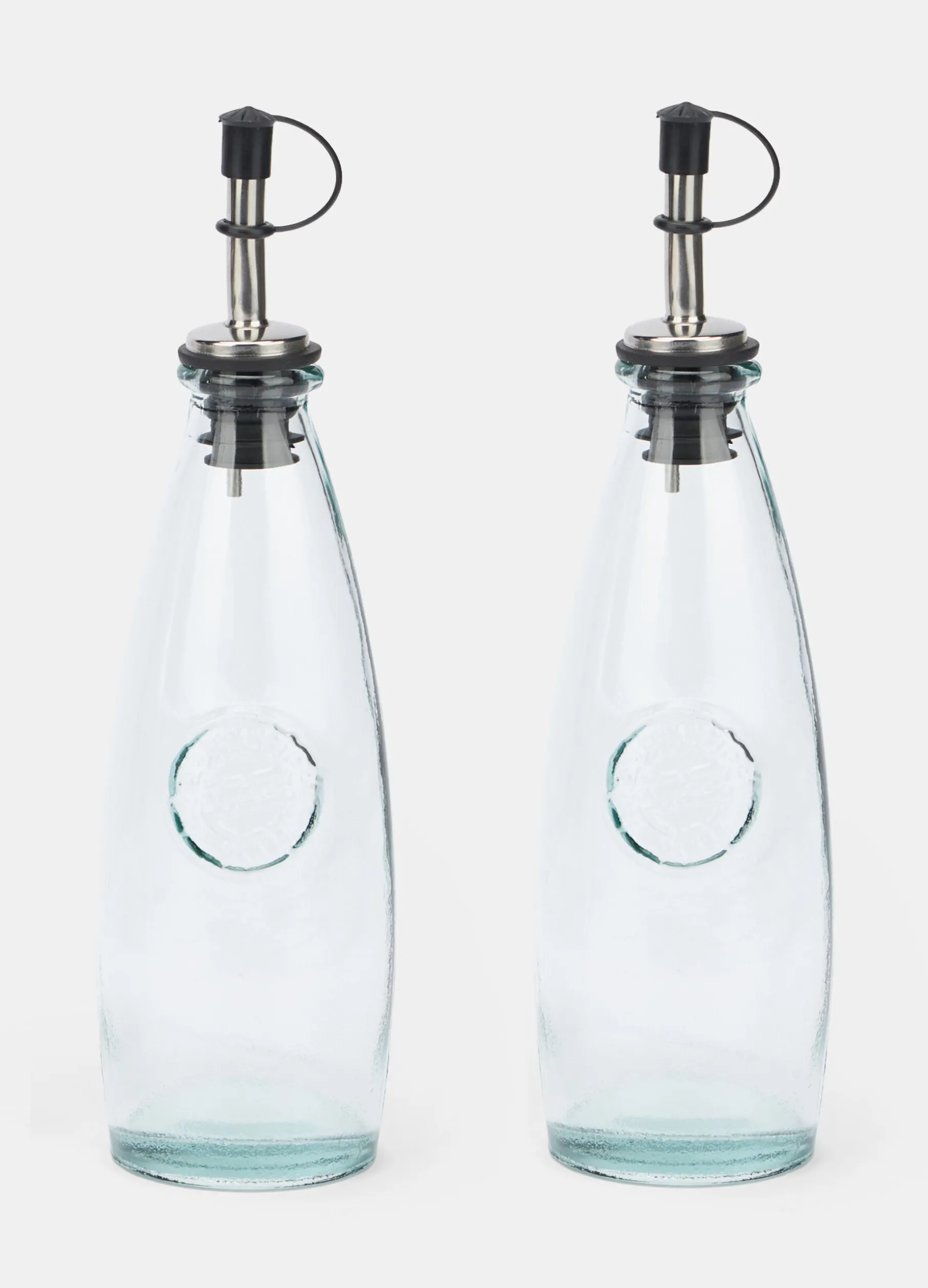 Set 2 oliere in vetro riciclato con dosatore. Made in Spagna.