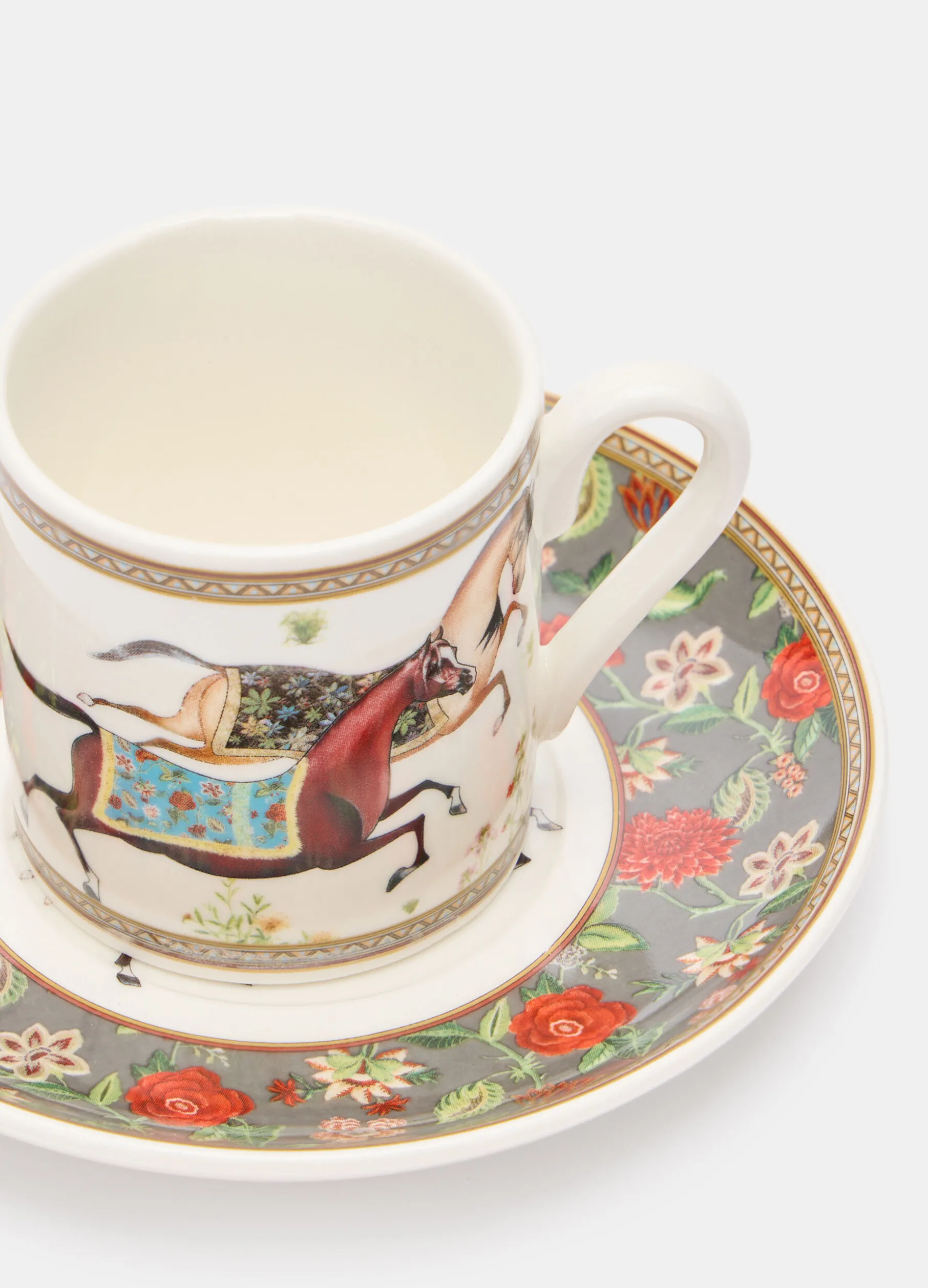 Set con due tazzine da caffè in ceramica complete di piattino e presentate in una confezione di carta dedicata e riccamente decorata. La stampa combina motivi floreali con illustrazioni equestri vintage. Altezza: 6 cm, capacità: 100 mL.