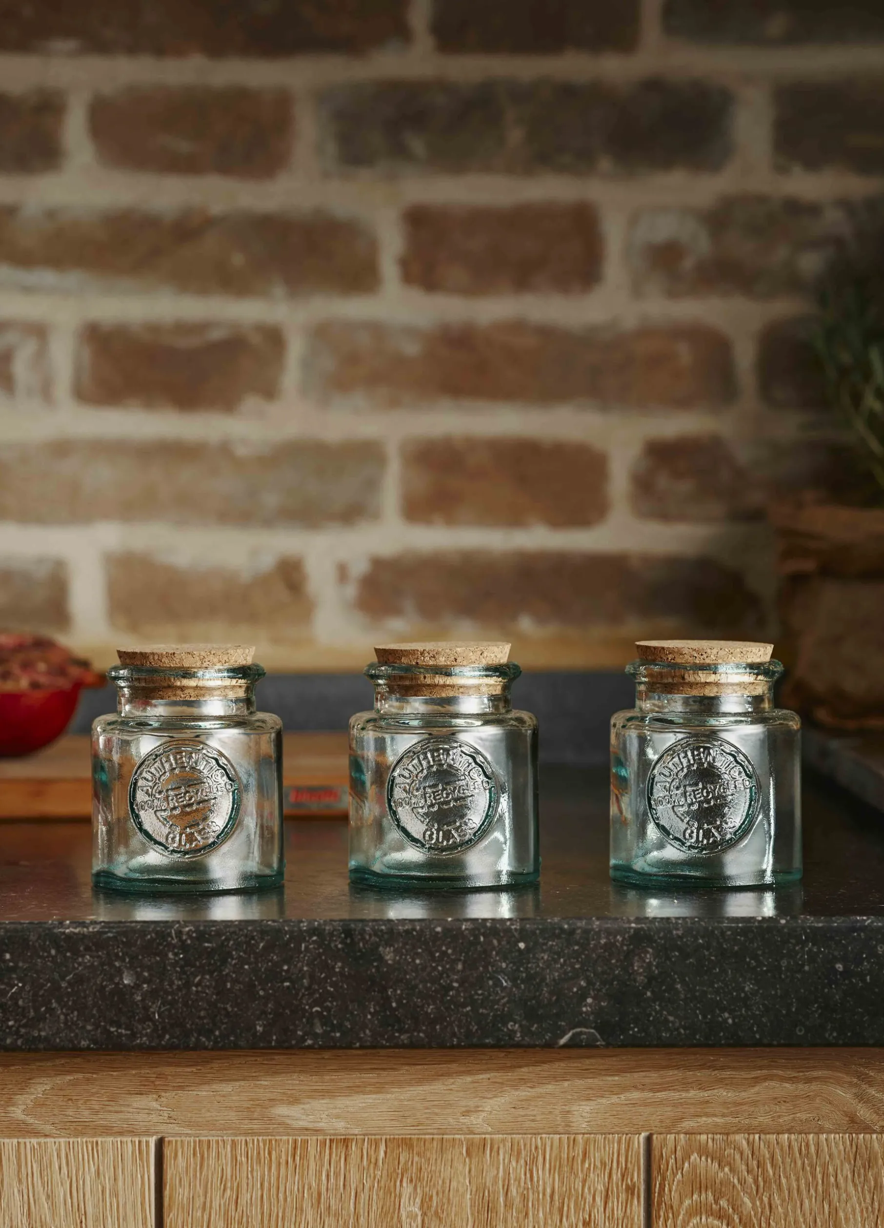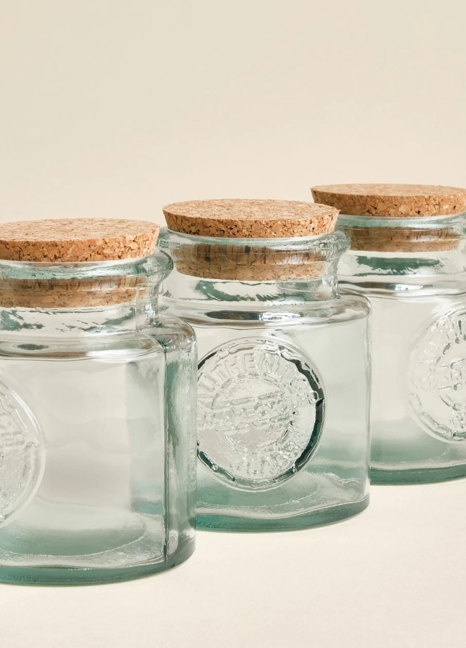 Set 3 barattoli in vetro riciclato con tappo in sughero. Made in Spagna. Capacità 250cc.