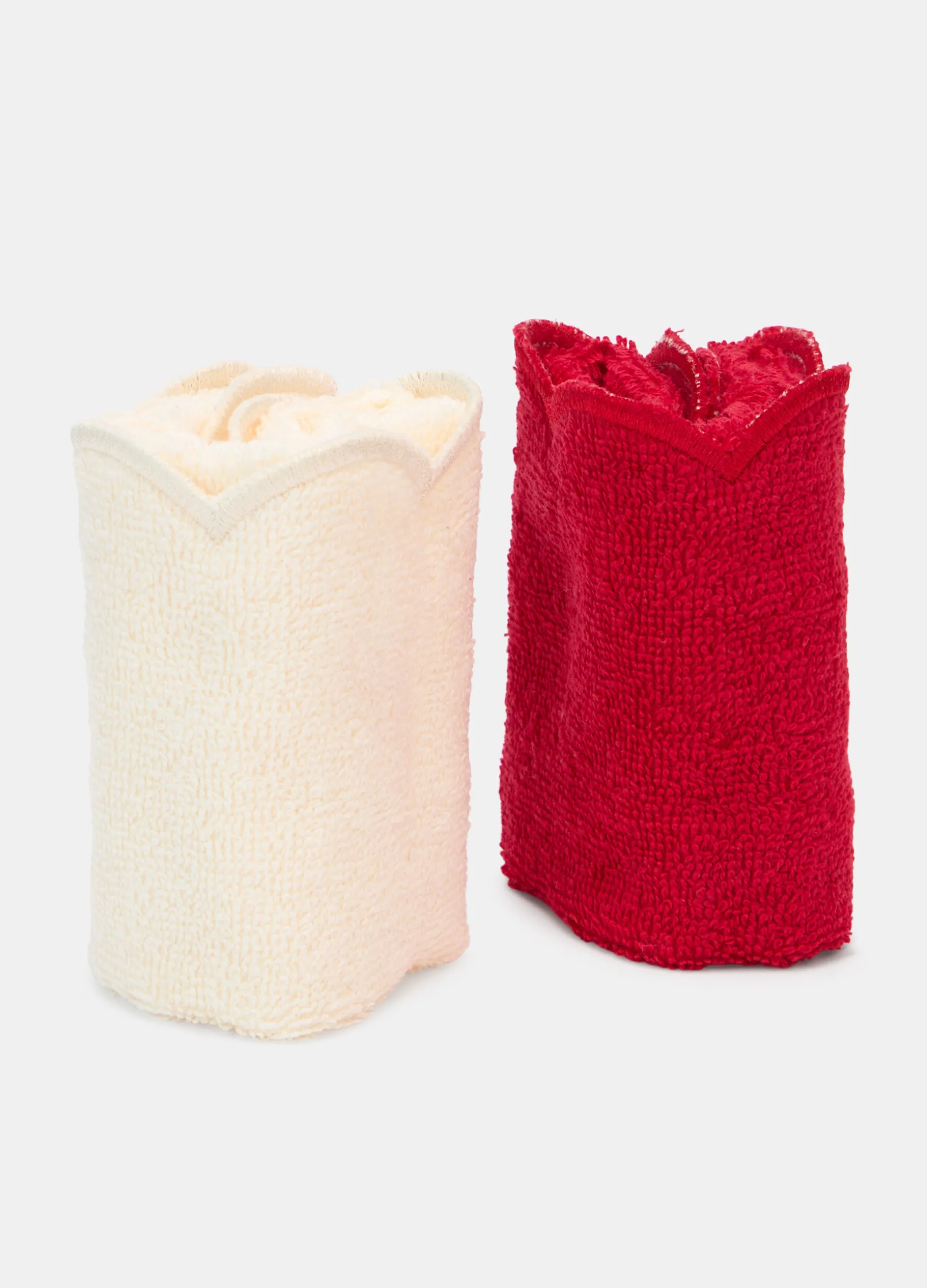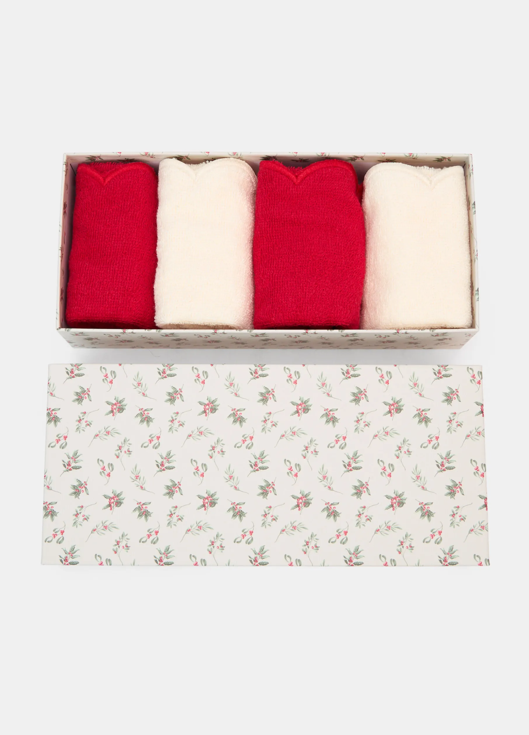Confezione regalo in cartone rigido con motivo natalizio, contenente un set da 4 salviette quadrate in spugna di cotone nei toni del rosso e del bianco avorio, ideali da presentare agli ospiti nel periodo delle feste. Dimensioni: 30 x 30 cm.