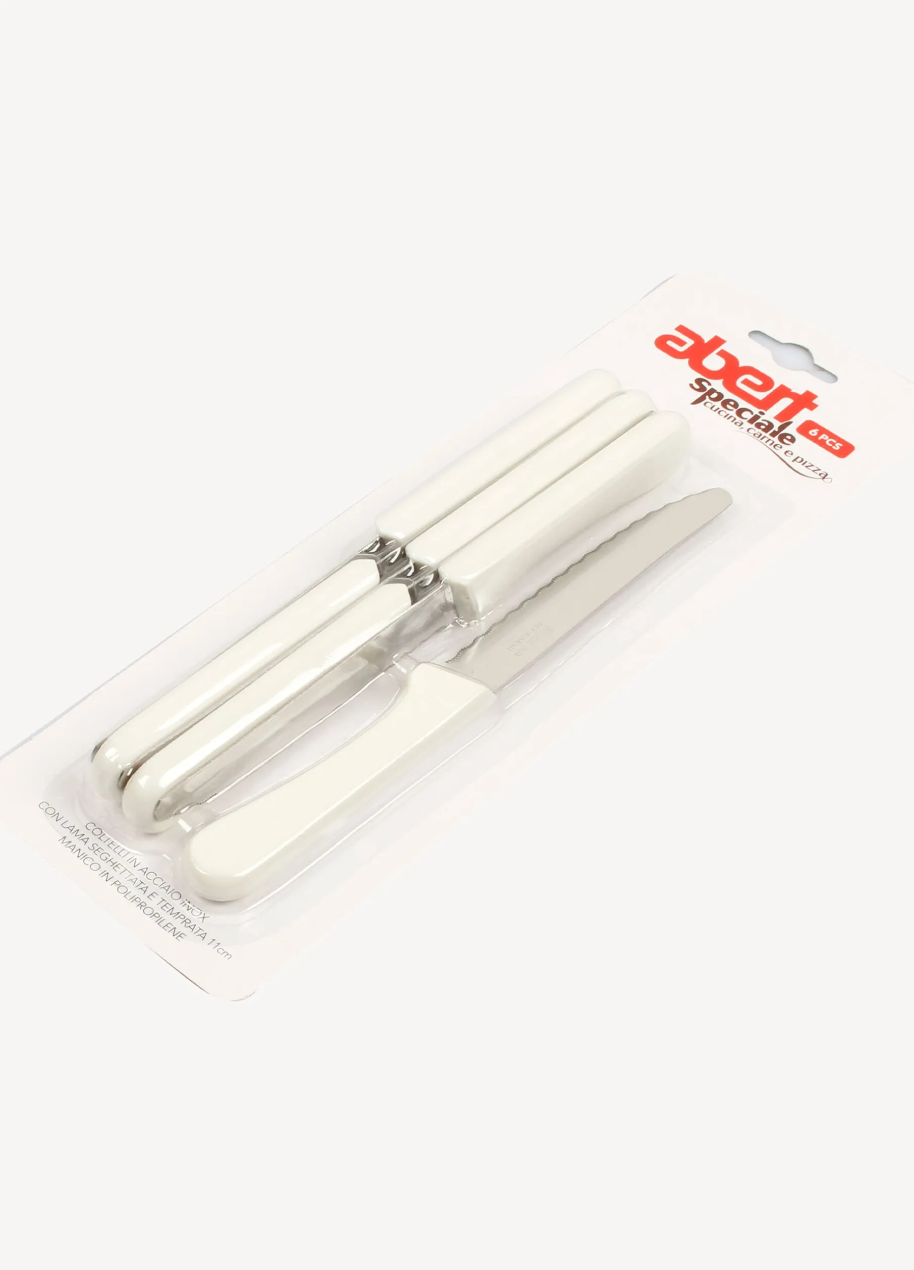 Set 6 coltelli in acciaio con manico bianco. Dimensioni confezione 21×2,2×10 cm.