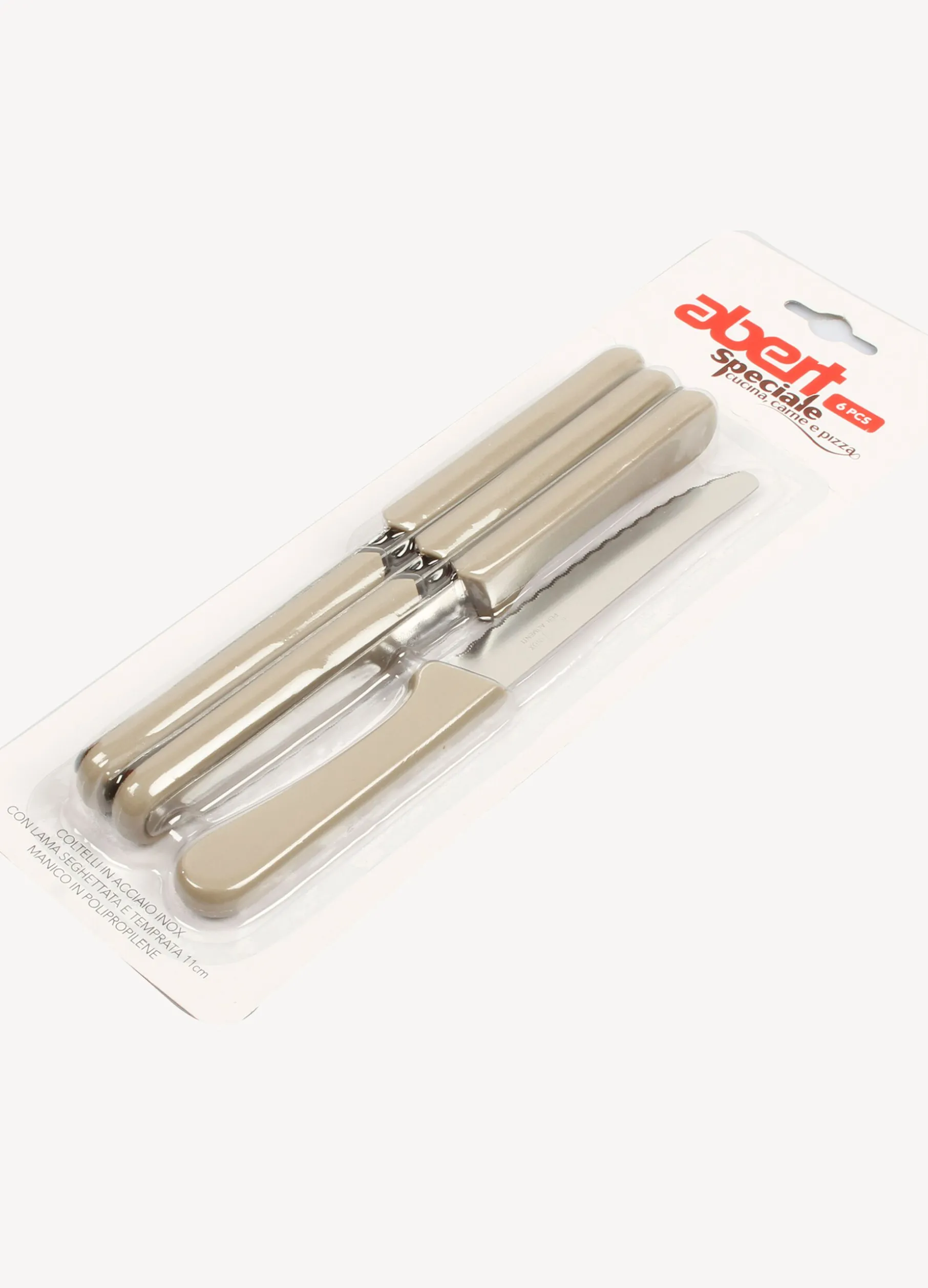 Set 6 coltelli in acciaio con manico tortora. Dimensioni confezione 21×2,2×10 cm.