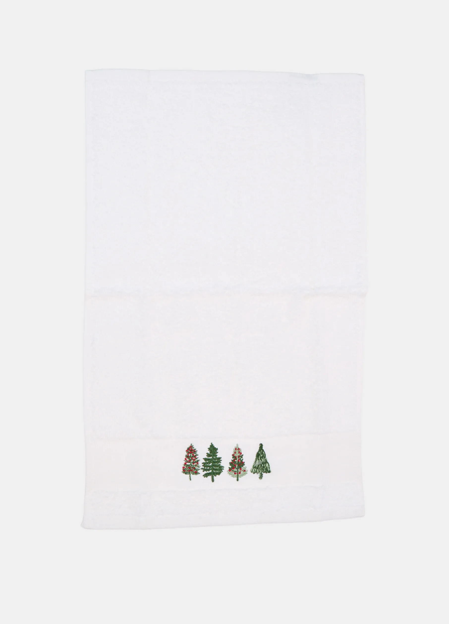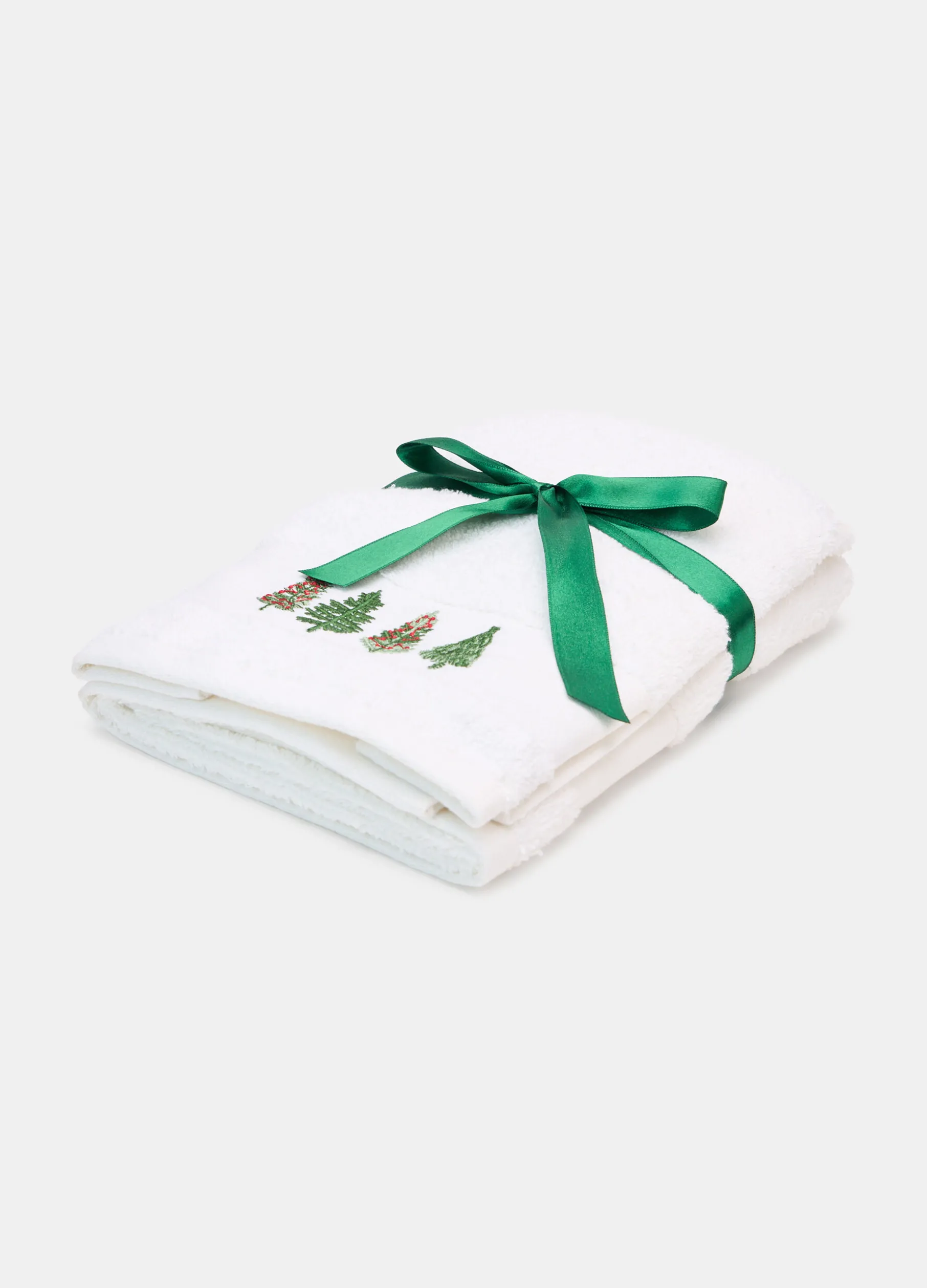 Set con asciugamani bianchi in due misure diverse, realizzati in spugna di puro cotone, morbida e delicata sulla pelle e arricchita dal ricamo a contrasto con abeti addobbati a festa. Dimensioni: 90 x 50 cm.