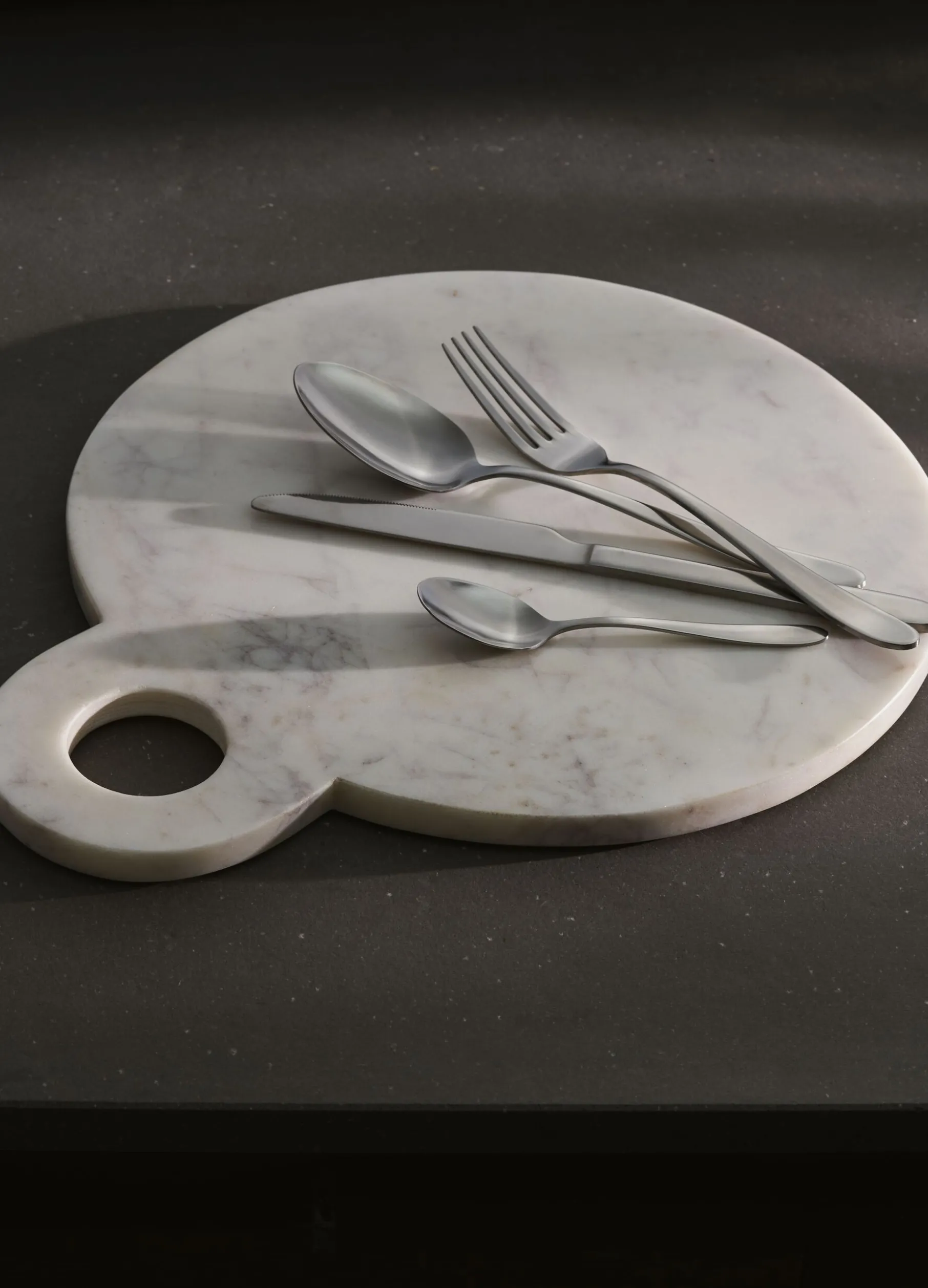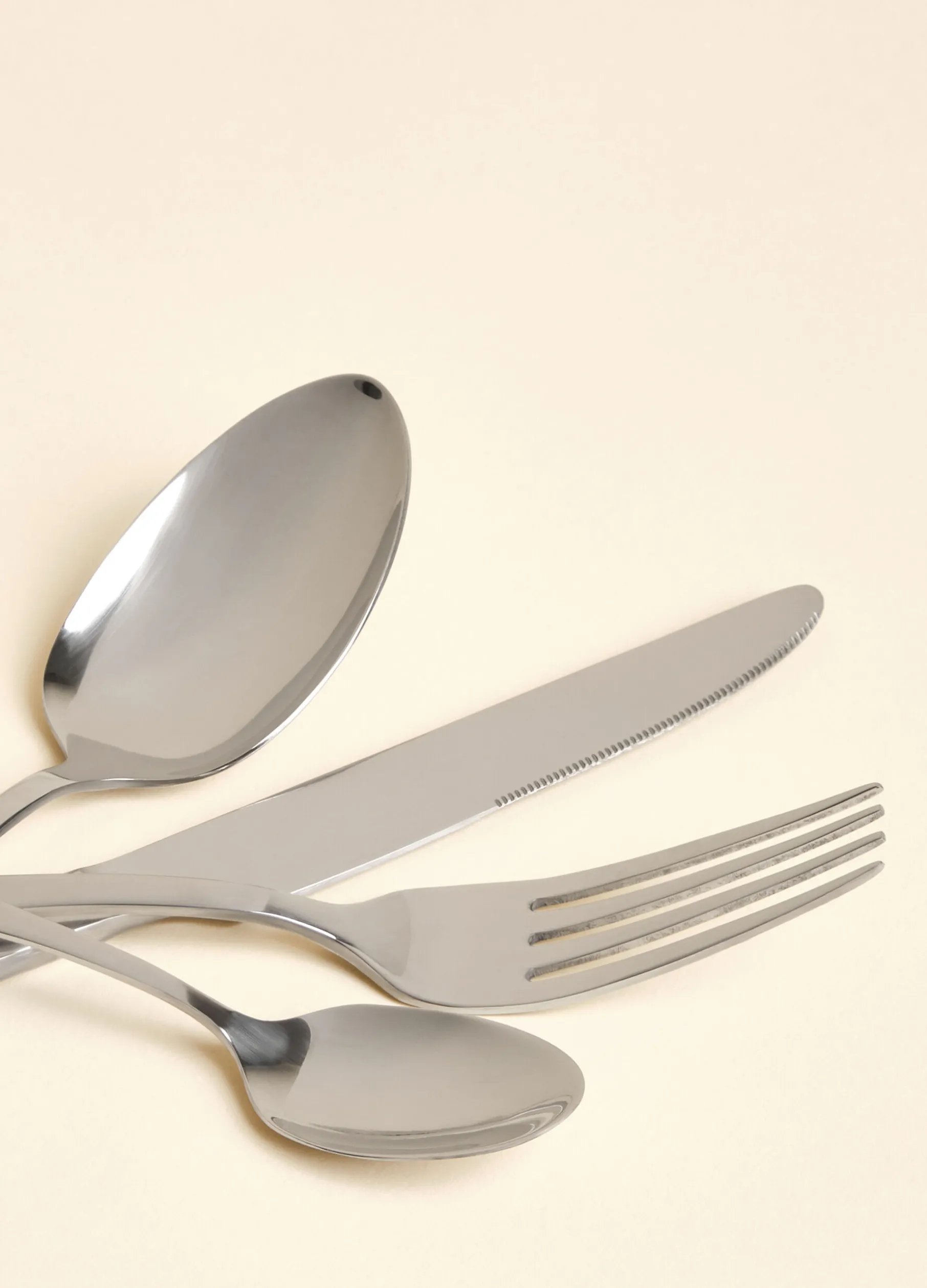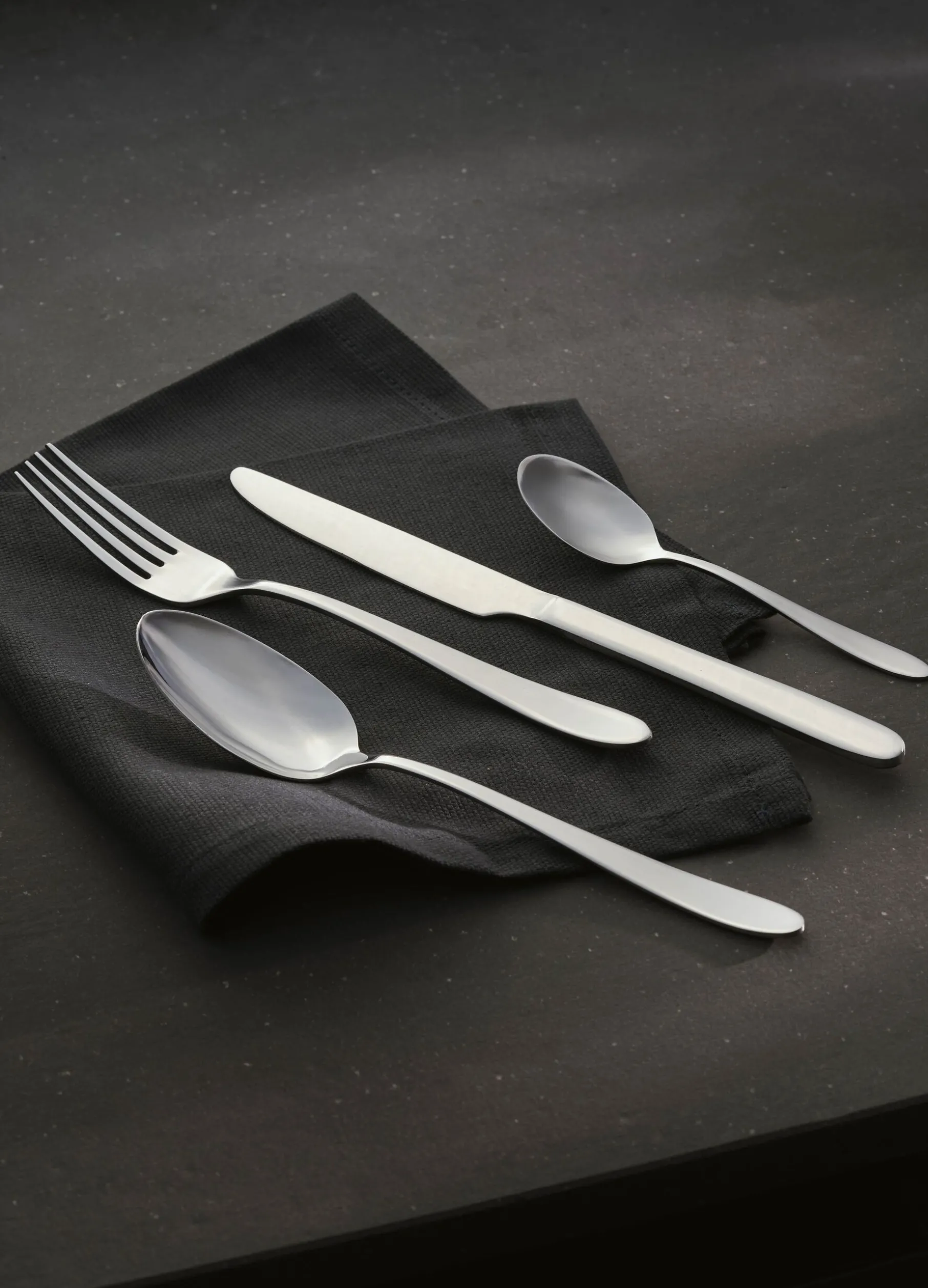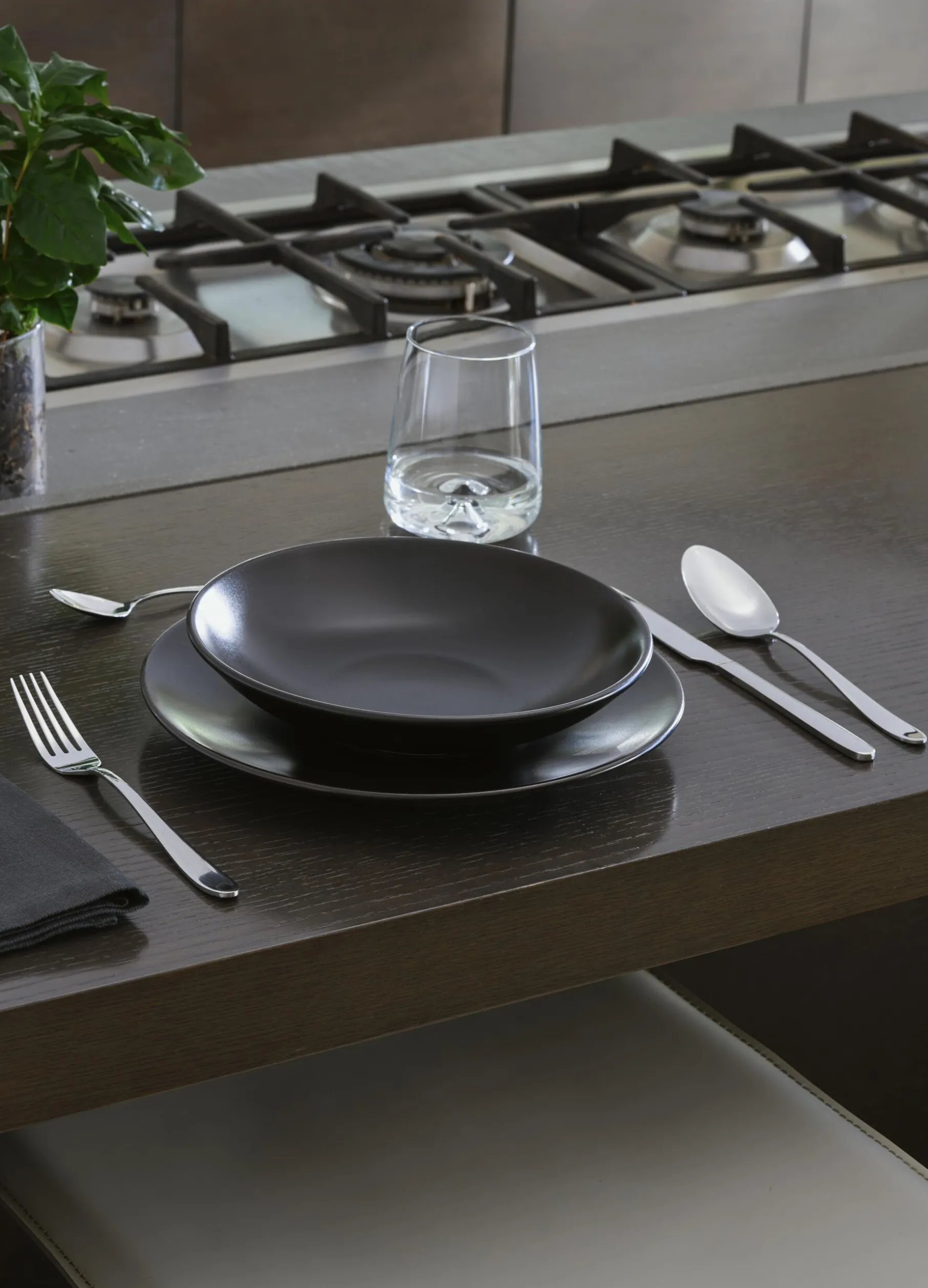Set posate composto da 16 pezzi, tra cui forchetta, coltello, cucchiaio e cucchiaino. Realizzate in acciaio con finitura grigio medio e lucida, versatile e adatta a ogni stile di arredamento.