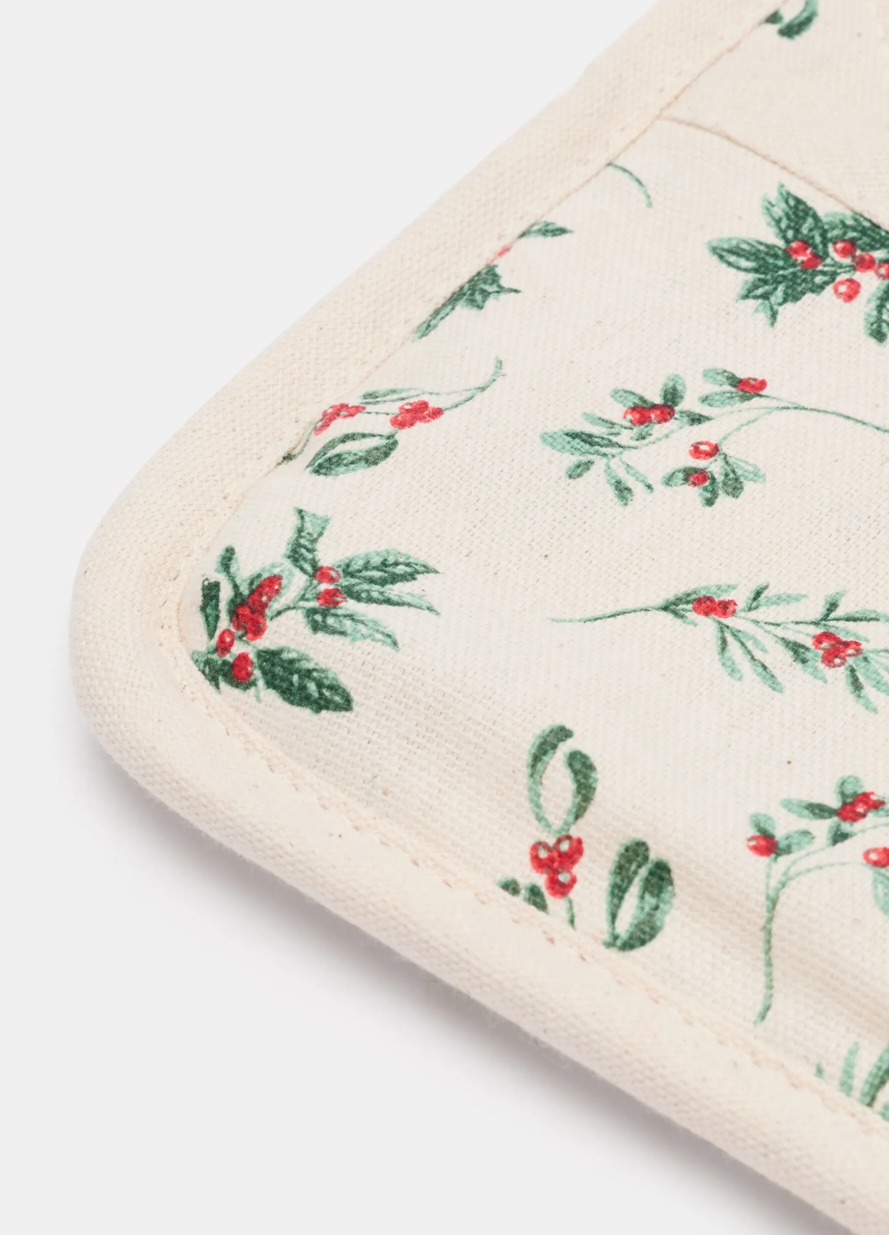 Allegro set da cucina composto da presina e strofinaccio in puro cotone bianco avorio, arricchito dalla decorazione stampata con rami di vischio e agrifoglio, che richiama l’atmosfera delle feste. Completato dallo stampo in metallo per biscotti a forma di omino di pan di zenzero. Dimensioni presina: 20 x 20 cm.