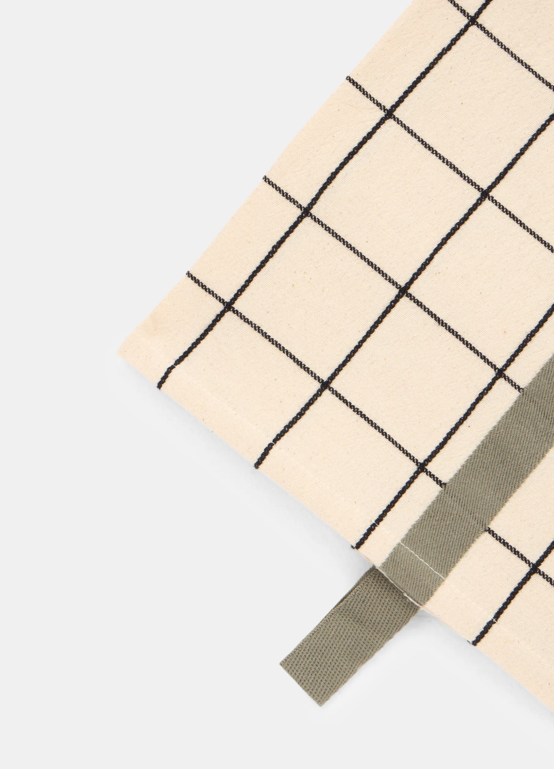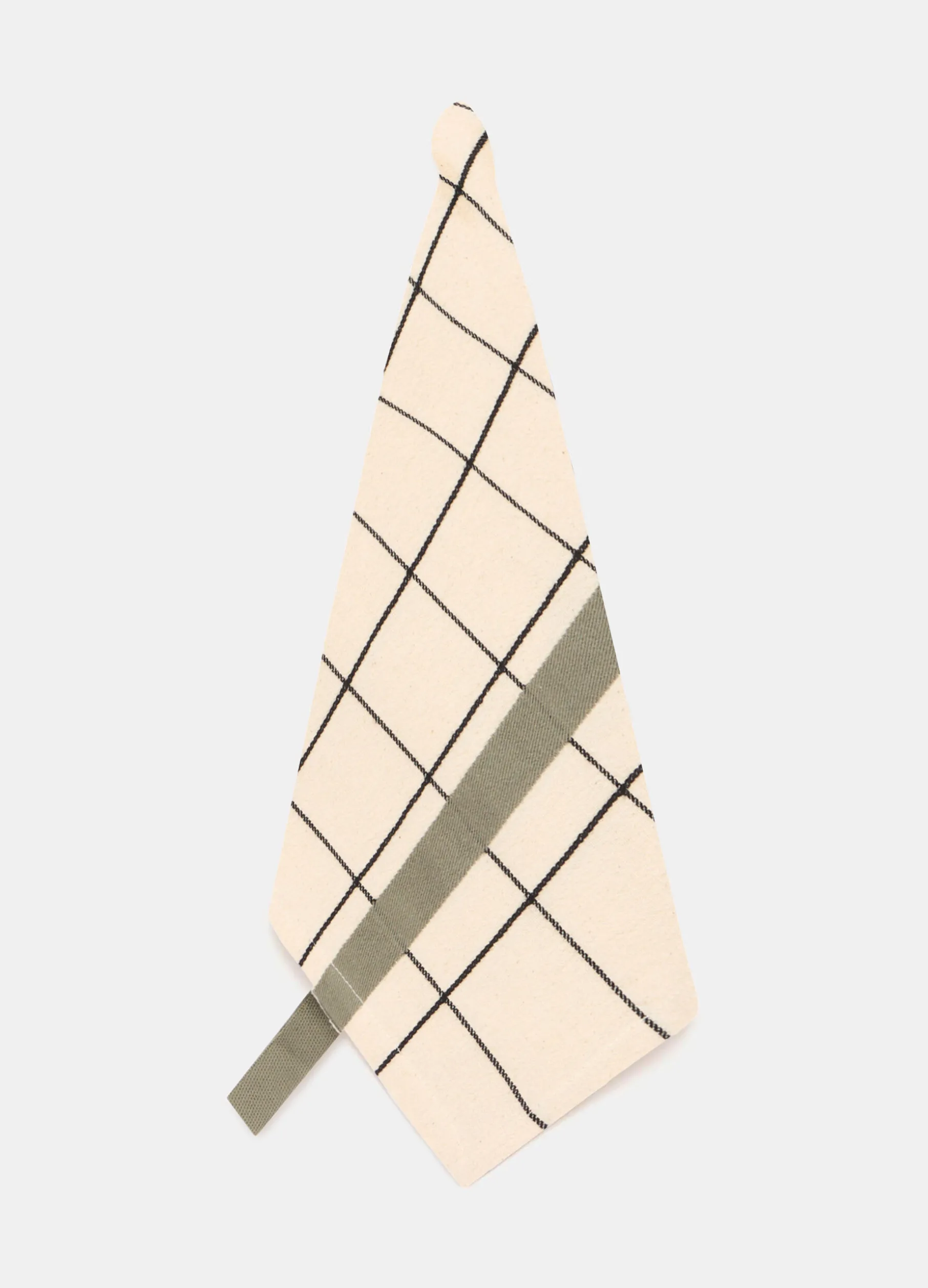 Strofinaccio da cucina in puro cotone lavato bianco avorio, un materiale leggero e funzionale arricchito dalla colorazione elegante. Attraversato da un motivo a quadri a contrasto e completato da un nastro verde chiaro applicato per appenderlo più facilmente. Dimensioni: 70 x 50 cm.