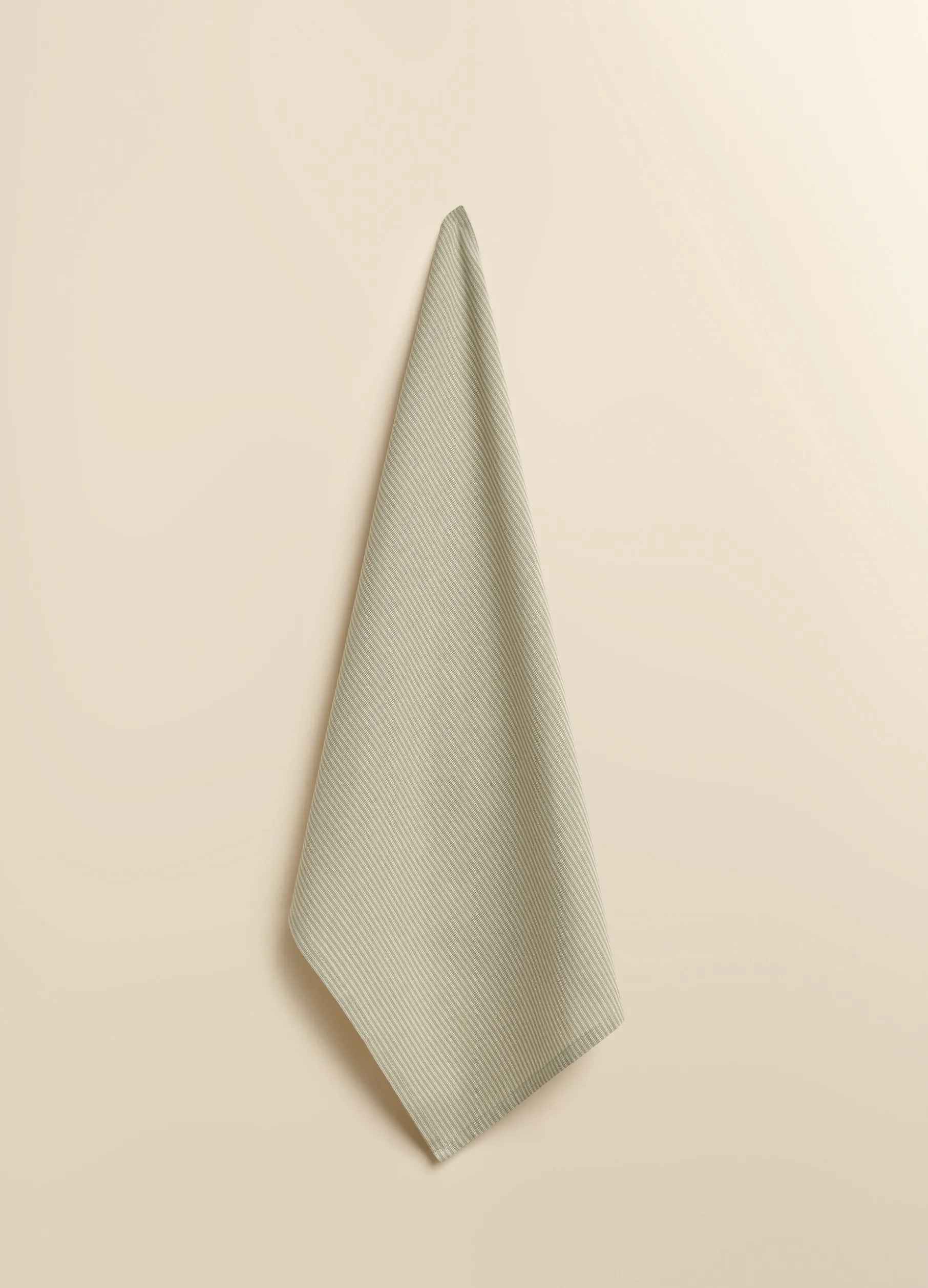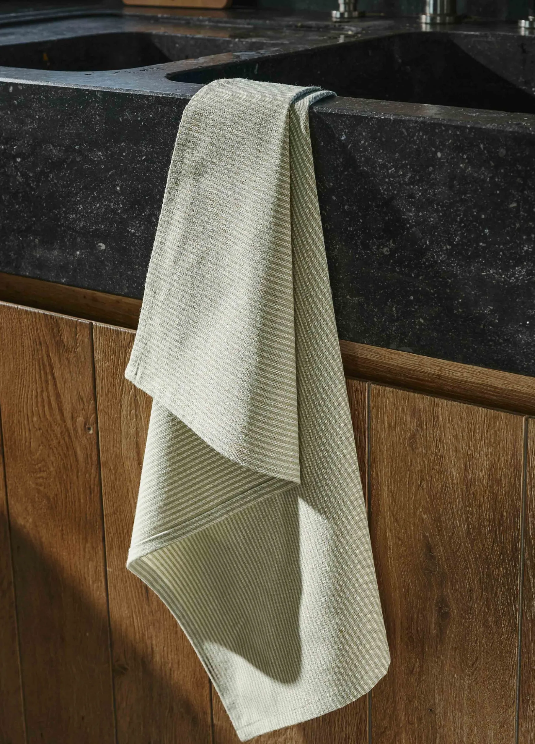 Strofinaccio da cucina di forma rettangolare in puro cotone biologico, un materiale resistente e assorbente. Arricchito da un motivo a righe sottili nei toni del bianco e del verde chiaro. Dimensioni: 70 x 50 cm.