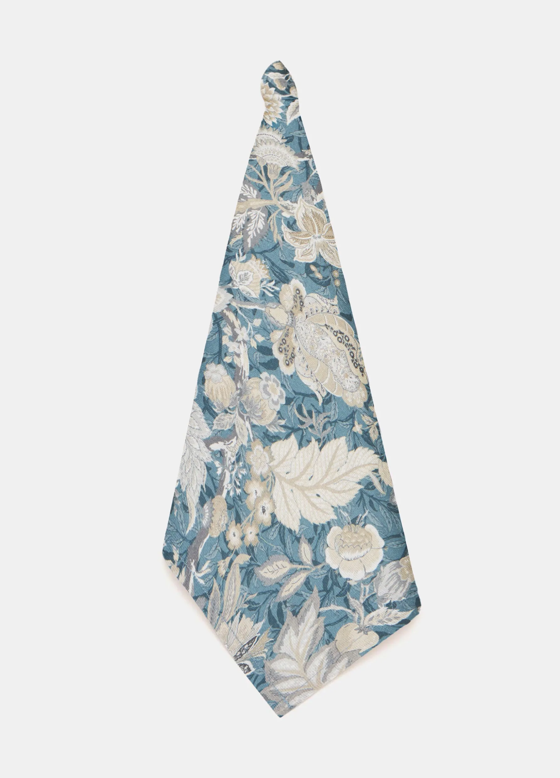 Strofinaccio rettangolare da cucina in puro cotone, morbido e assorbente. Il motivo floreale bianco avorio su sfondo azzurro, realizzato con stampa digitale, ricorda il broccato degli arazzi classici. Dimensioni: 70 x 50 cm.