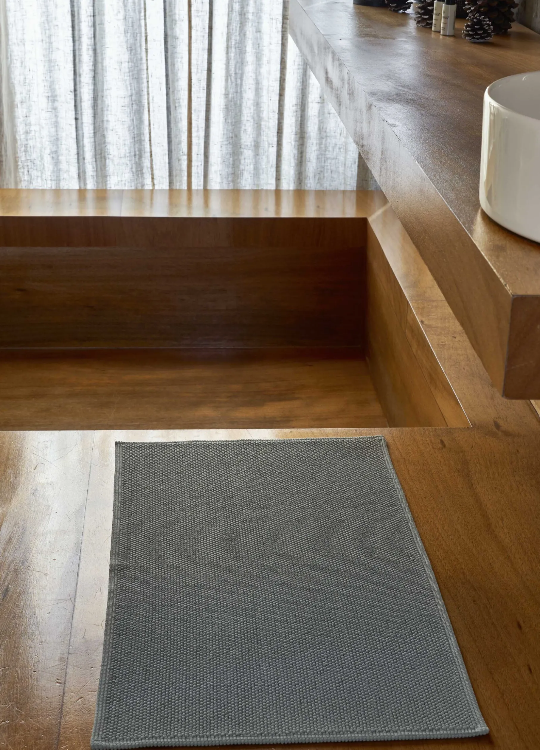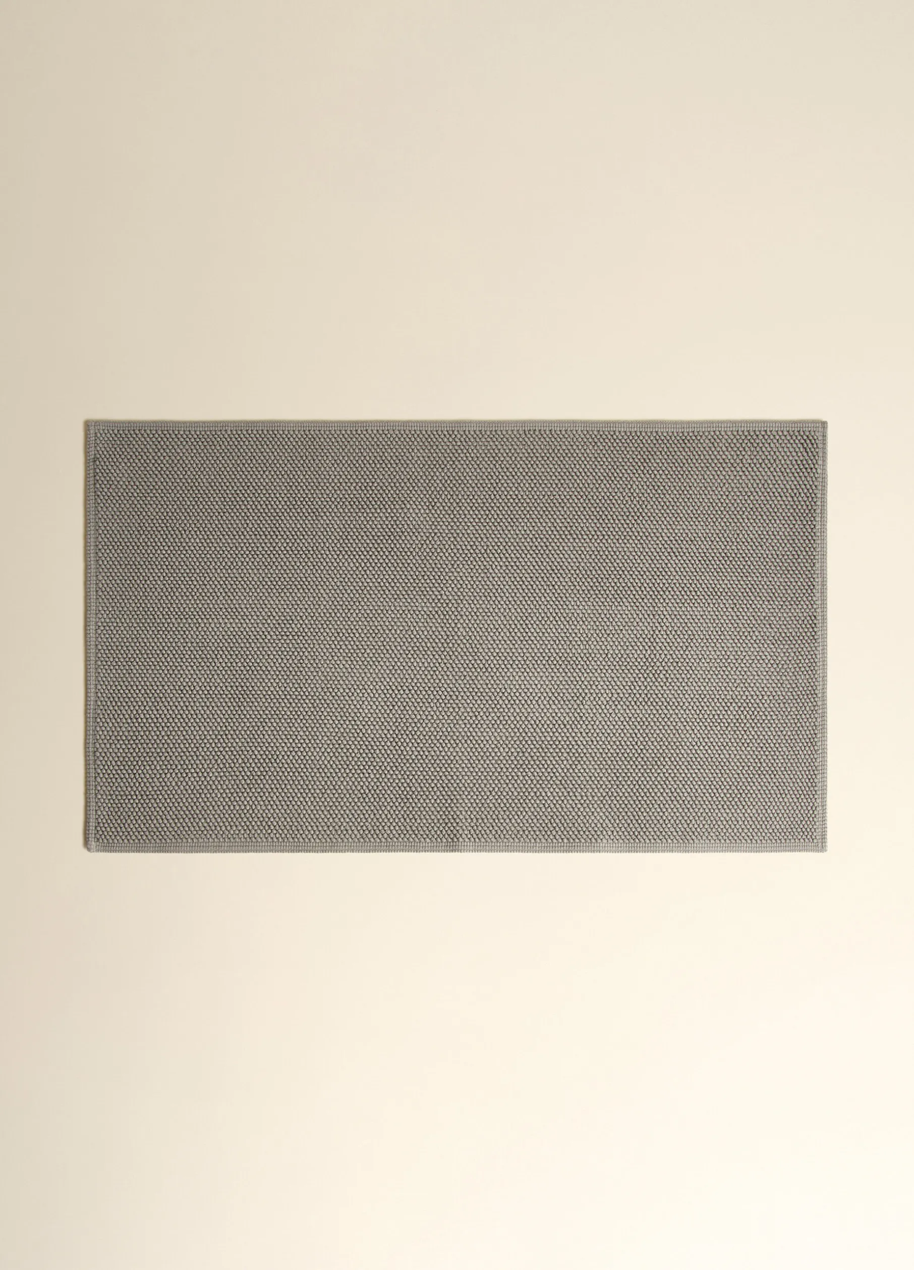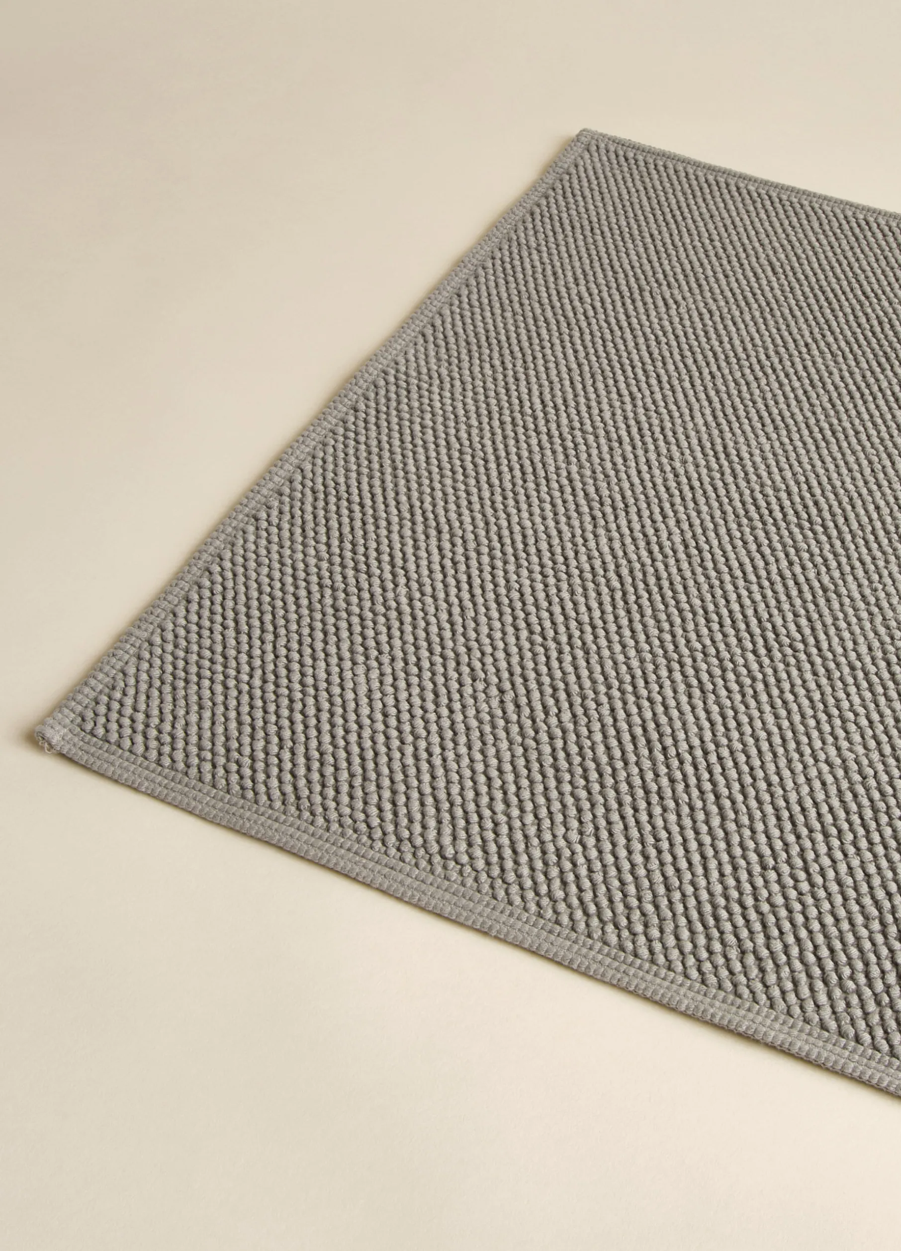 Tappetino rettangolare per il bagno realizzato in tessuto di cotone grigio chiaro e arricchito da una lavorazione tridimensionale all-over. Dimensioni: 80 x 48 cm.