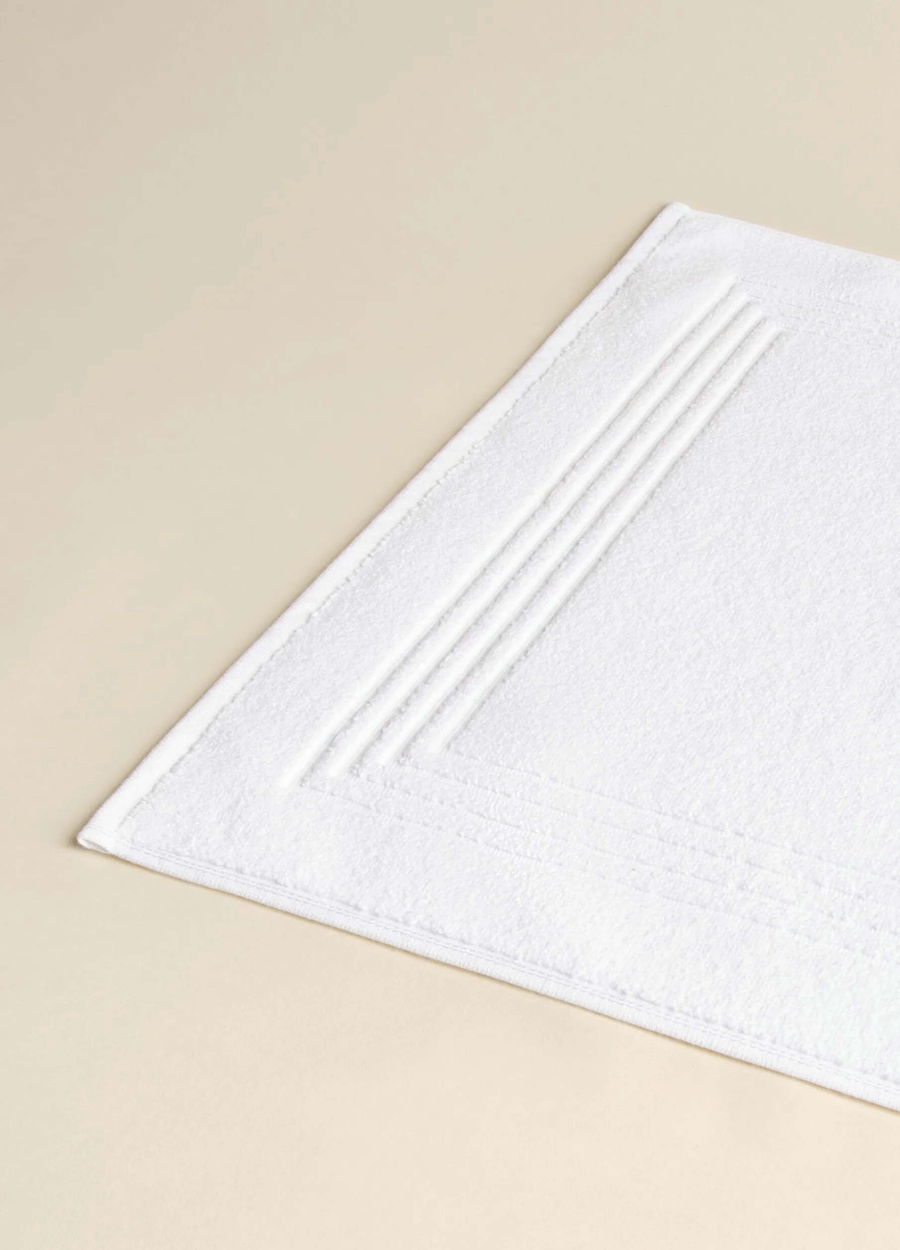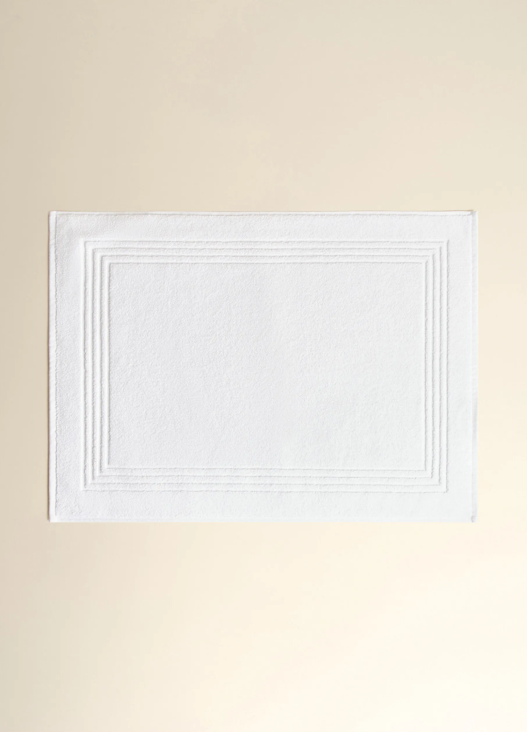 Tappetino rettangolare per il bagno realizzato in spugna di puro cotone bianco candido, dalla trama soffice e leggera, segnato da una lavorazione in rilievo lungo i bordi. Dimensioni: 70 x 50 cm.