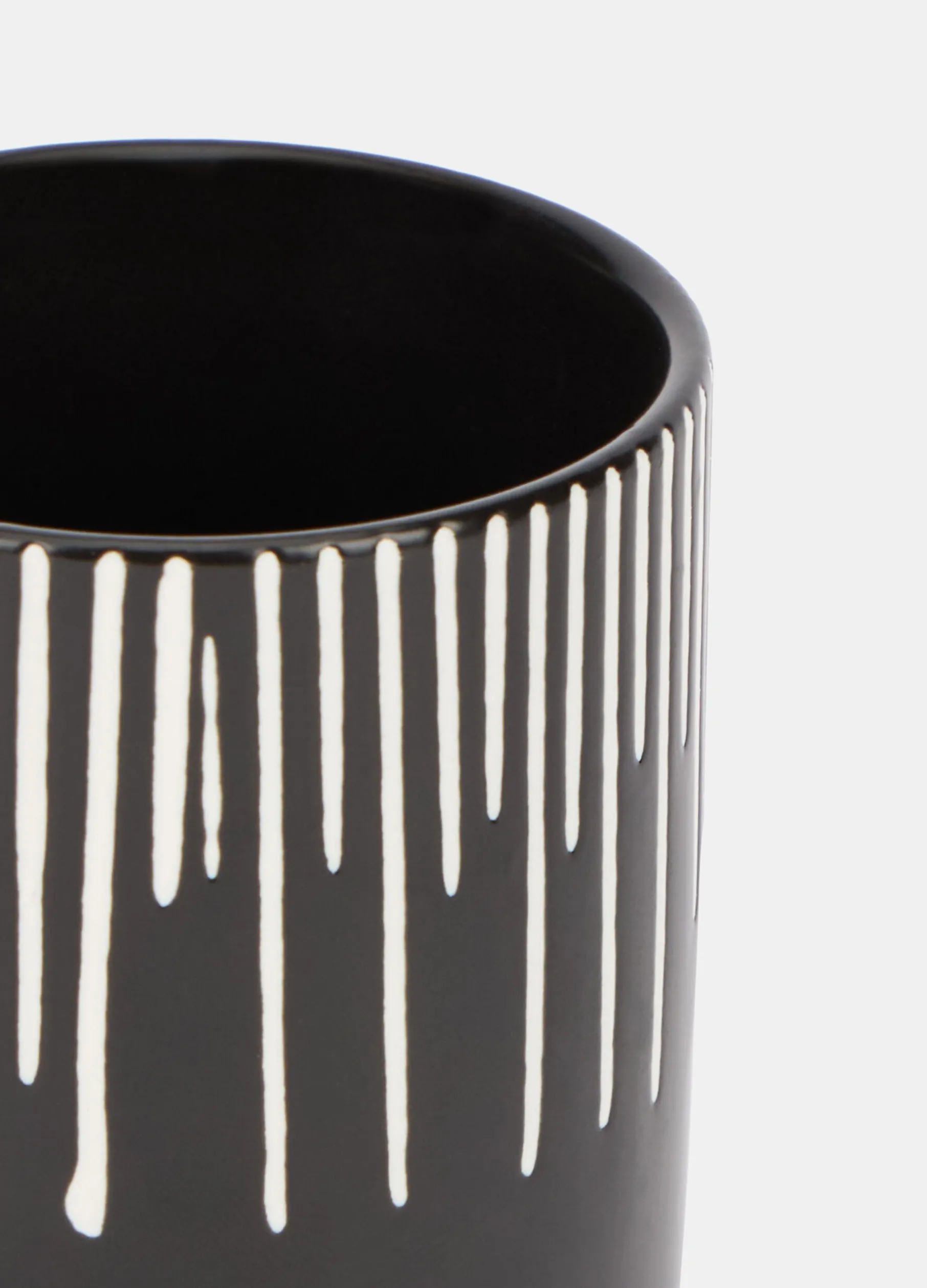 Tazza da tè di medie dimensioni, ispirata alle ceramiche orientali. Realizzata in ceramica nera opaca, è arricchita da incisioni verticali in colore a contrasto. Diametro: 6,2 cm; altezza: 7 cm.