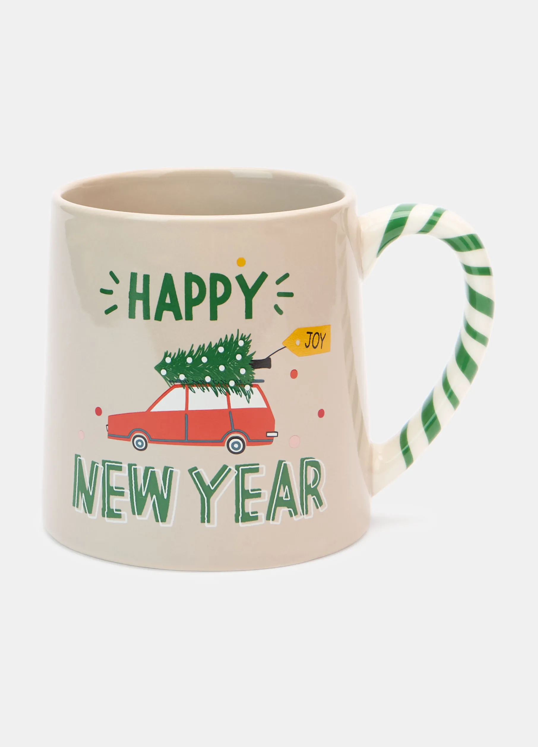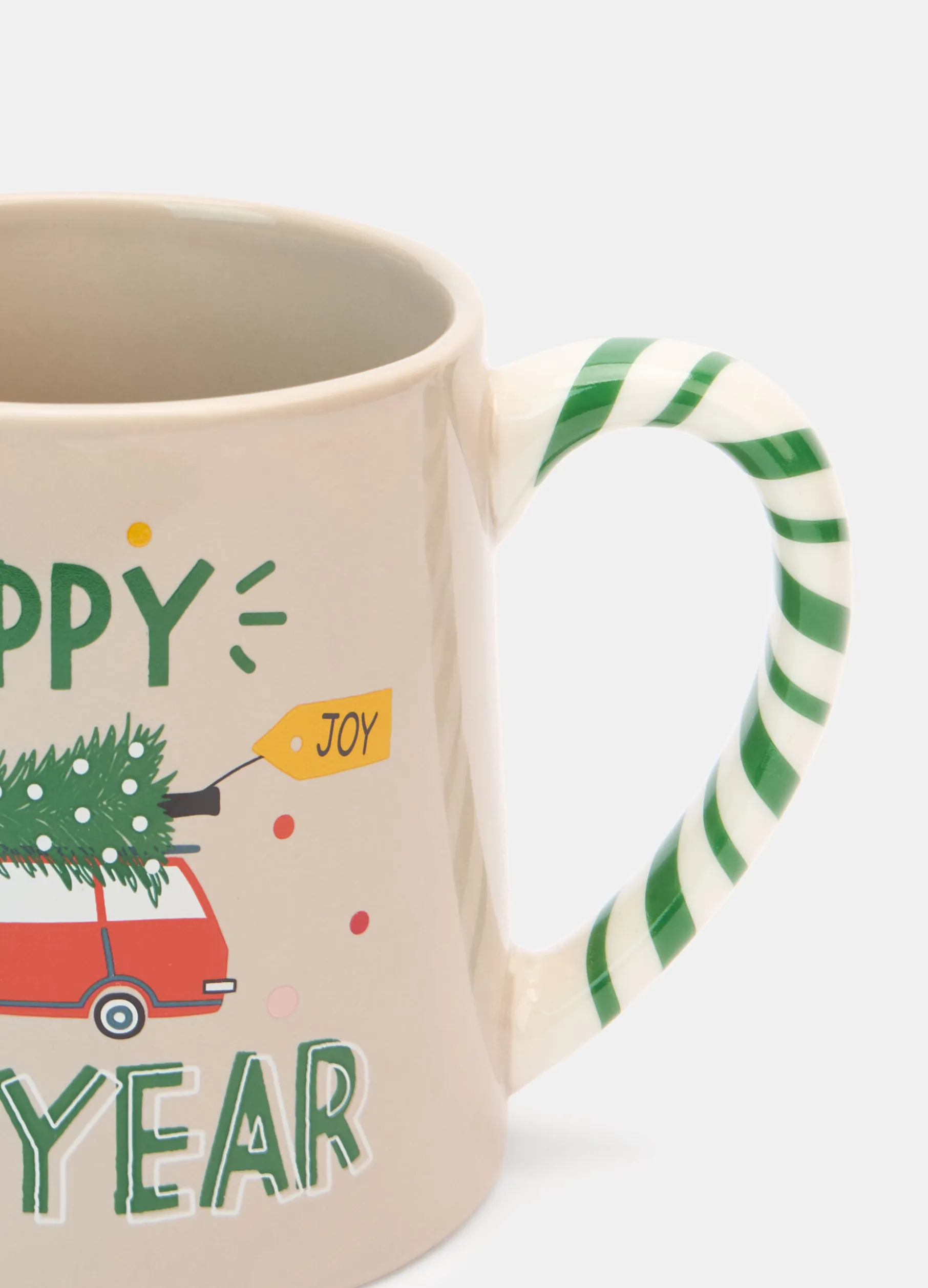 Tazza alta e capiente in ceramica beige chiaro, perfetta per sorseggiare tè, tisane o una bella cioccolata calda, completa di manico rotondo a strisce verdi e bianche, che richiama i tipici bastoncini di zucchero, e di decorazione frontale ispirata alle feste. Altezza: 10 cm; capacità: 475 mL.