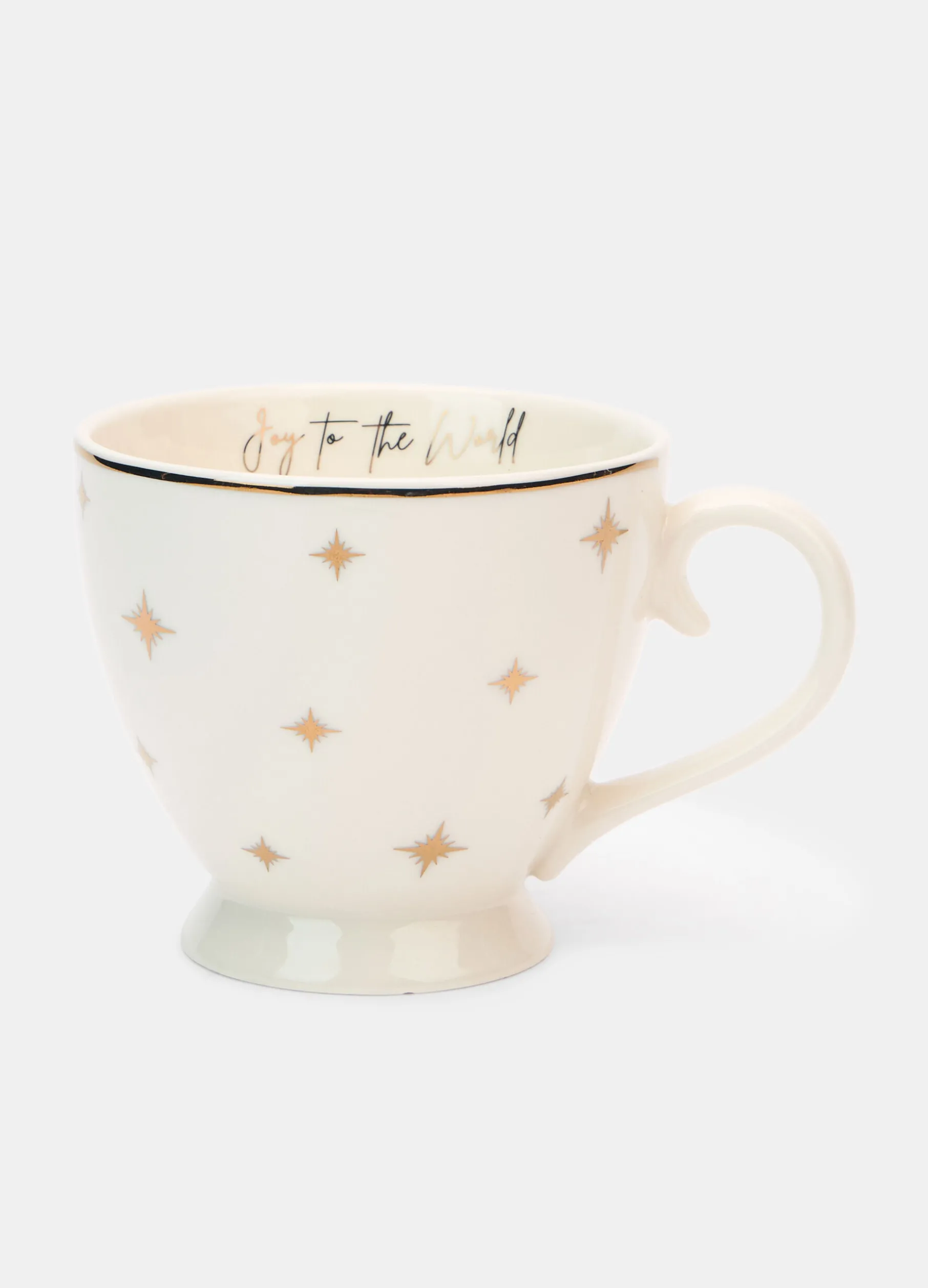 Ispirata alle tazzine da caffè, la tazza in ceramica bianco avorio è capiente ed elegante, ideale per tè, tisane e cioccolata calda. L’estero è decorato da un motivo di stelle dorate, mentre all’interno spicca il dettaglio della scritta benaugurale a contrasto. Altezza: 10 cm; capacità: 450 mL.