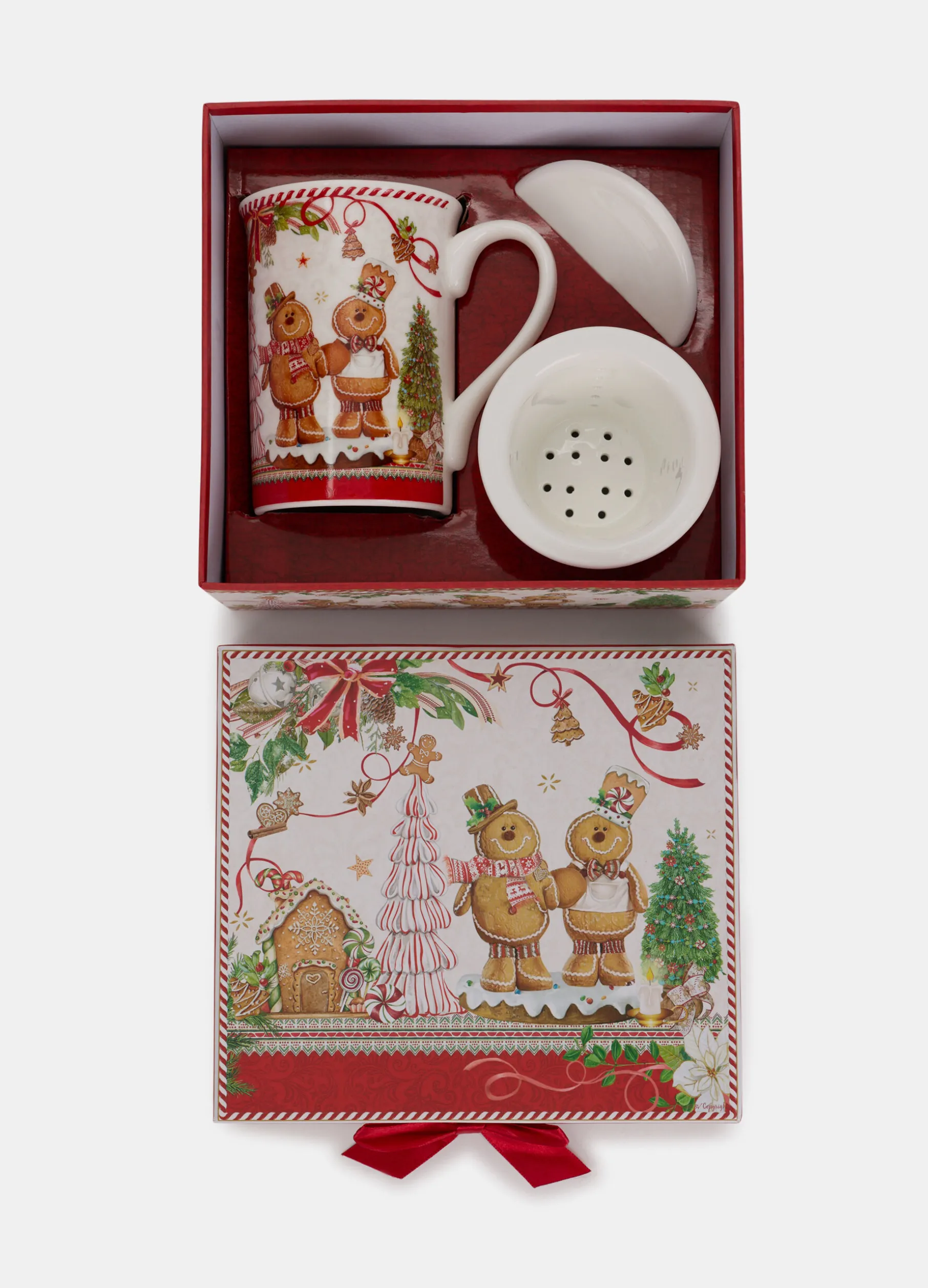 Confezione regalo, completa di scatola in cartone abbinata, contenente una tazza alta e capiente, ideale per tè e tisane, con colino e coperchio in porcellana. La decorazione con omini di pan di zenzero e ghirlande richiama un’atmosfera invernale e festiva. Altezza: 10 cm; capacità: 320 mL.