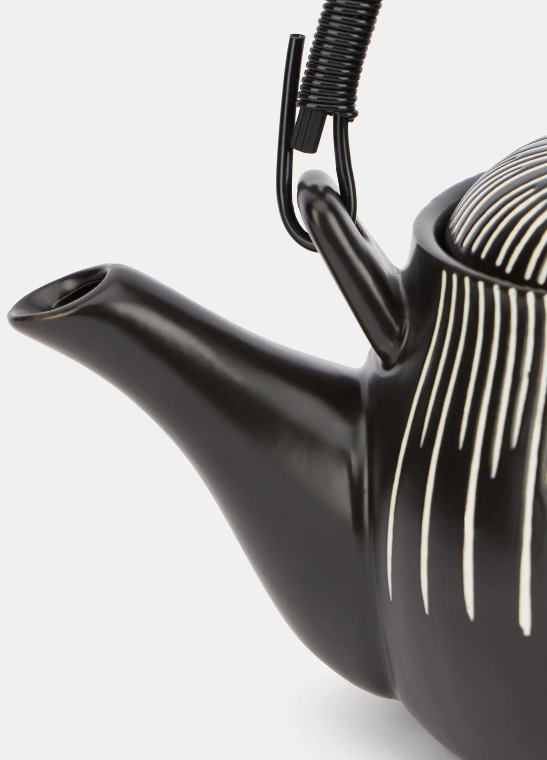 Teiera piccola di colore nero opaco, ispirata alle ceramiche orientali. Sulla parte superiore è inciso una decorazione bianca a contrasto. Il manico verticale è rivestito in filo metallico. Capacità: 520 mL.