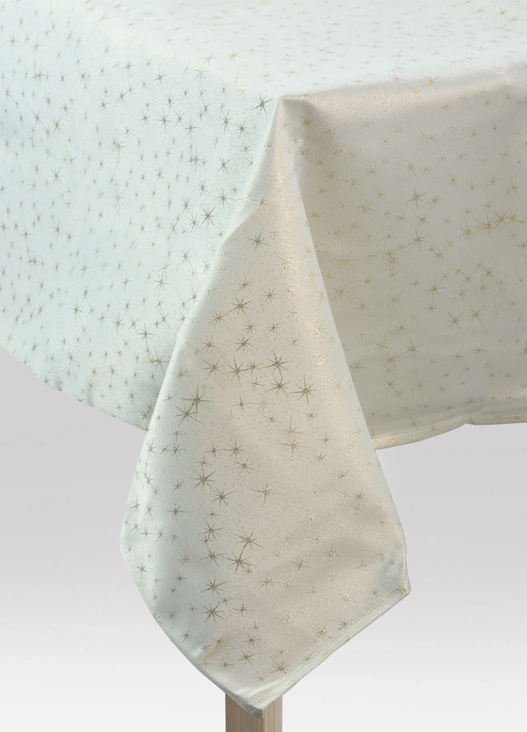 Tovaglia rettangolare da sei posti in tessuto bianco avorio, resistente all’acqua e alle macchie, punteggiata di stelle ricamate in filo dorato con effetto jacquard che evocano un’atmosfera festiva. Dimensioni: 180 x 140 cm.