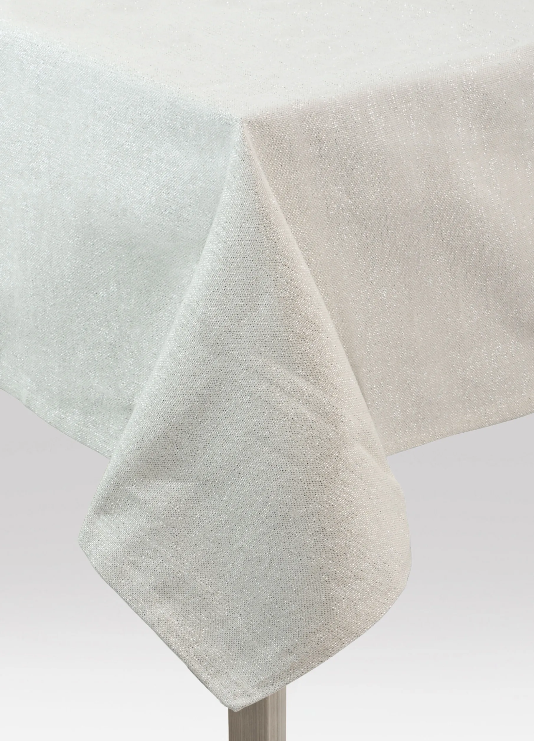 Tovaglia rettangolare per sei persone in misto cotone grigio chiarissimo, un tessuto delicato ed elegante arricchito dall’uso di fili metallici argentati lungo tutta la superficie, che accendono la tavola di allegria e magia. Dimensioni: 180 x 140 cm.