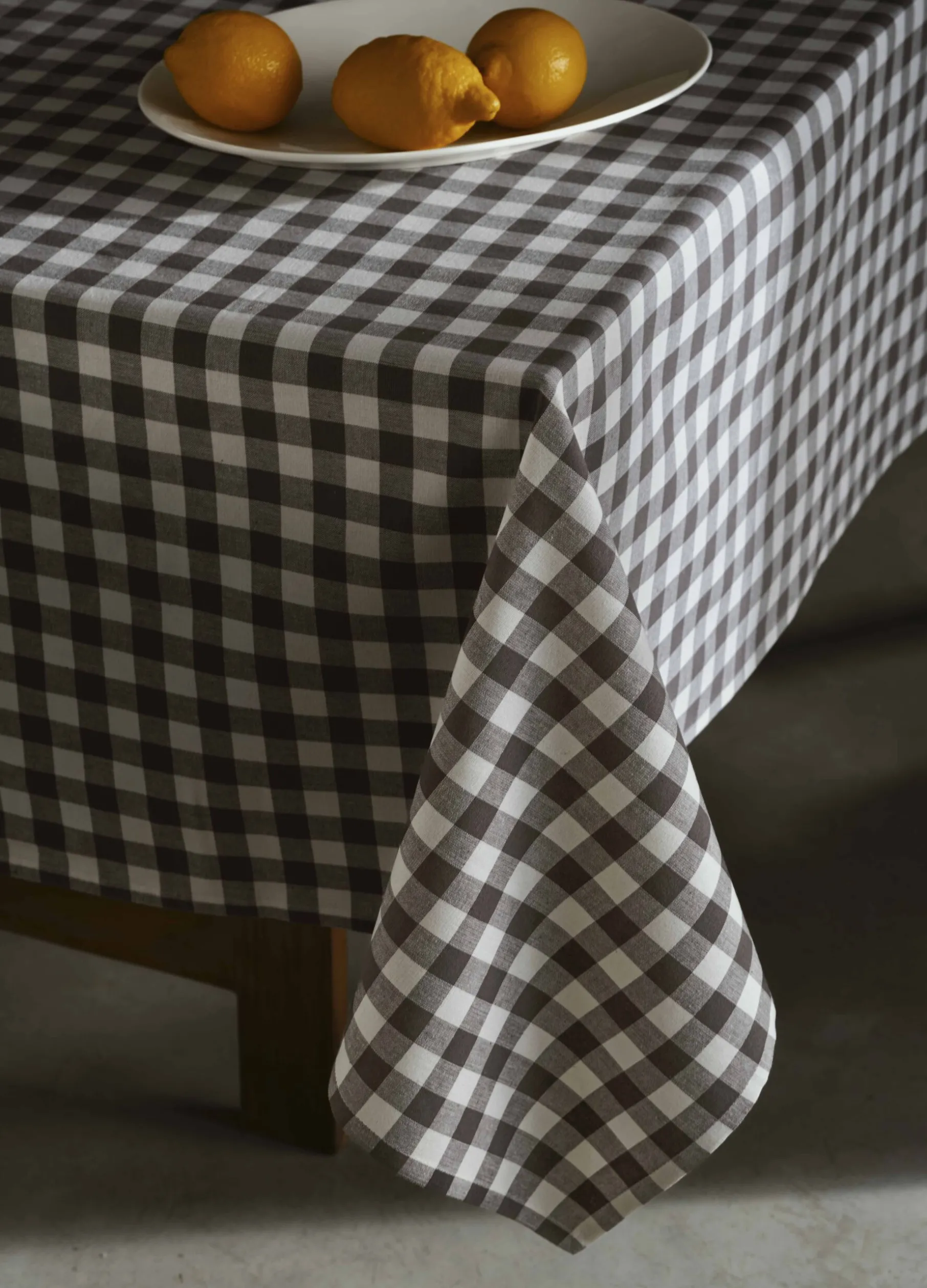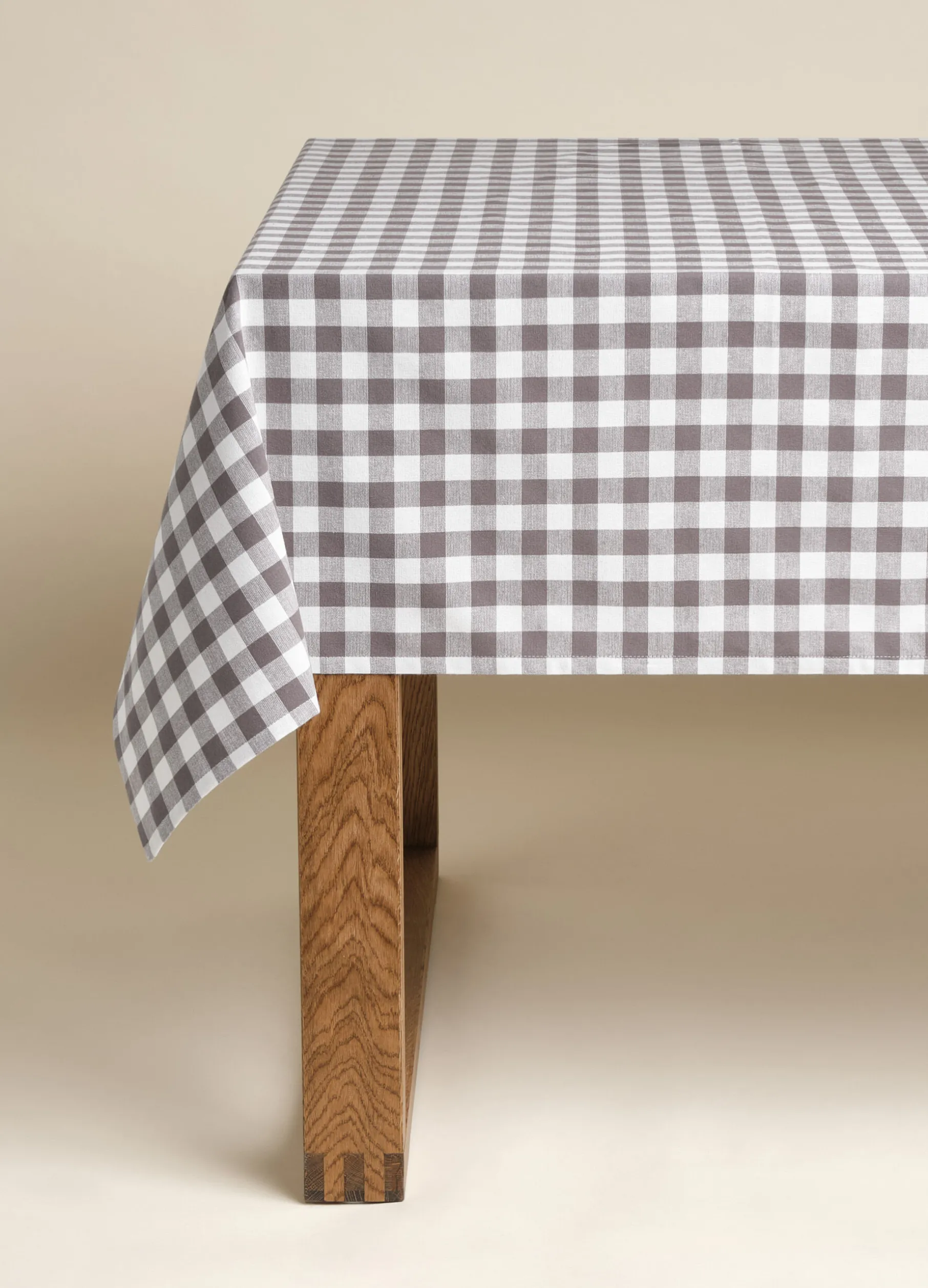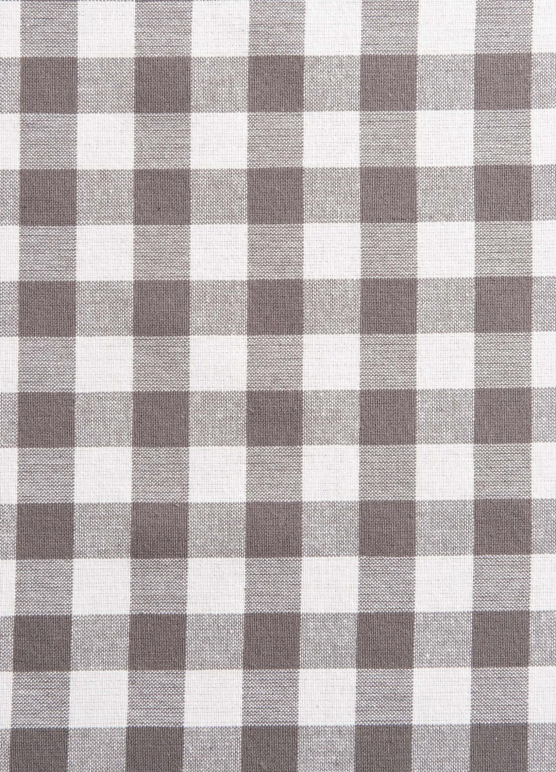 Tovaglia rettangolare in puro cotone per otto persone, resistente e leggero, arricchita da un classico motivo a quadretti bianco e grigio.