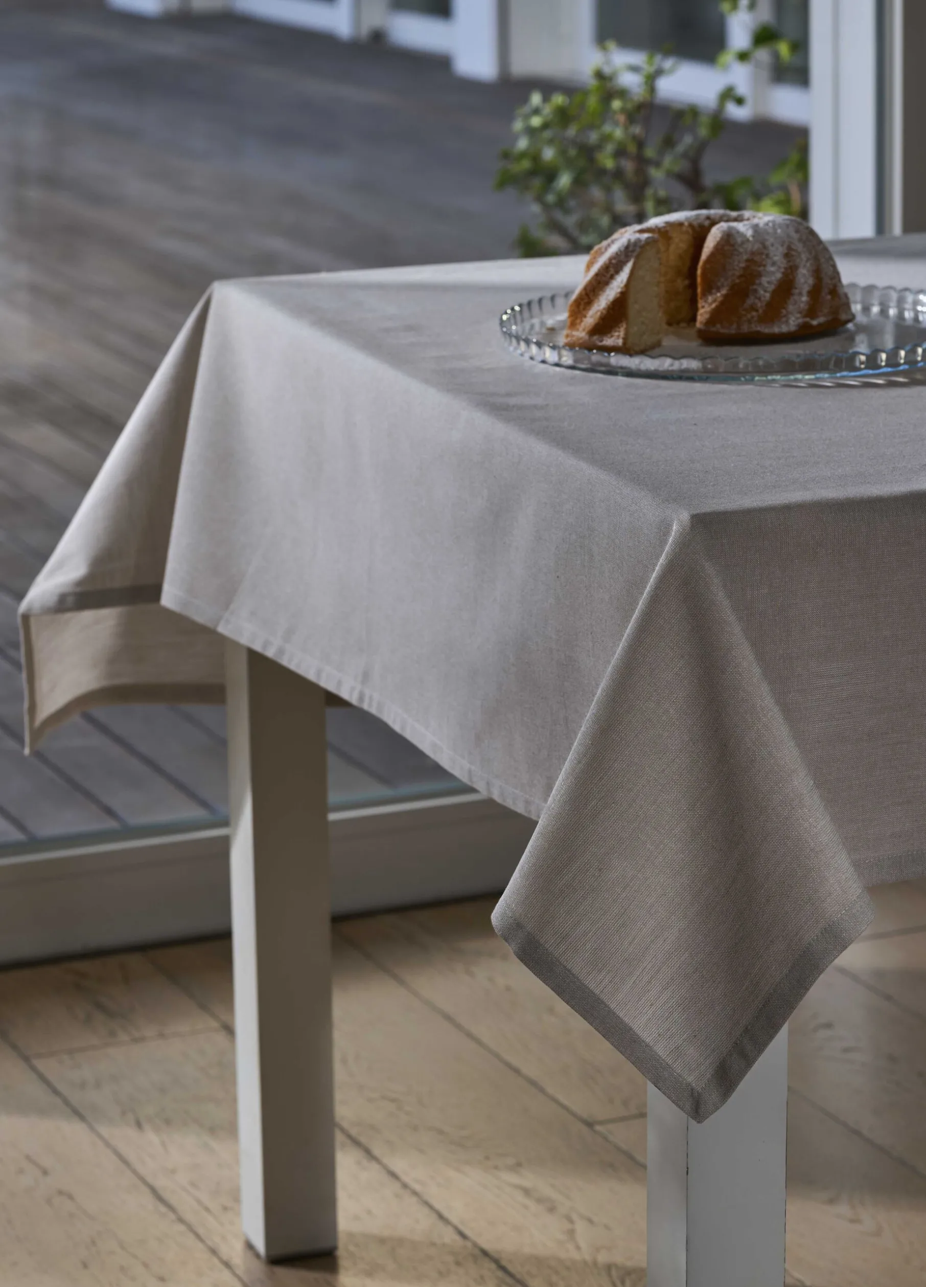Tovaglia rettangolare a otto posti in puro cotone, resistente e leggero, declinata in una colorazione beige mélange che crea movimento sul tessuto.