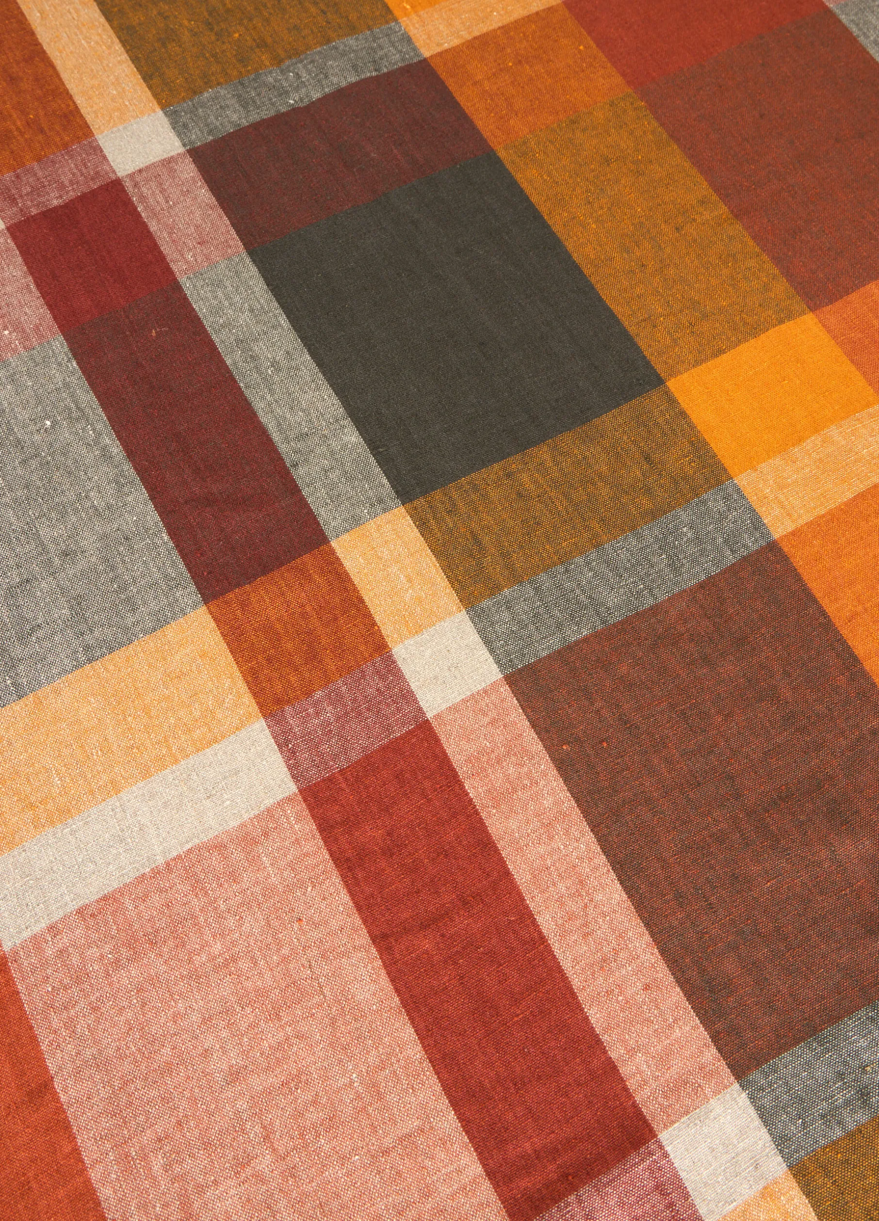 Tovaglia rettangolare a otto posti caratterizzata da un motivo a scacchi nei toni caldi del rosso e dell’arancione, che richiamano le accoglienti atmosfere autunnali. Il tessuto in puro lino è leggero e ricercato, con una particolare texture irregolare. Dimensioni: 240 x 150 cm.