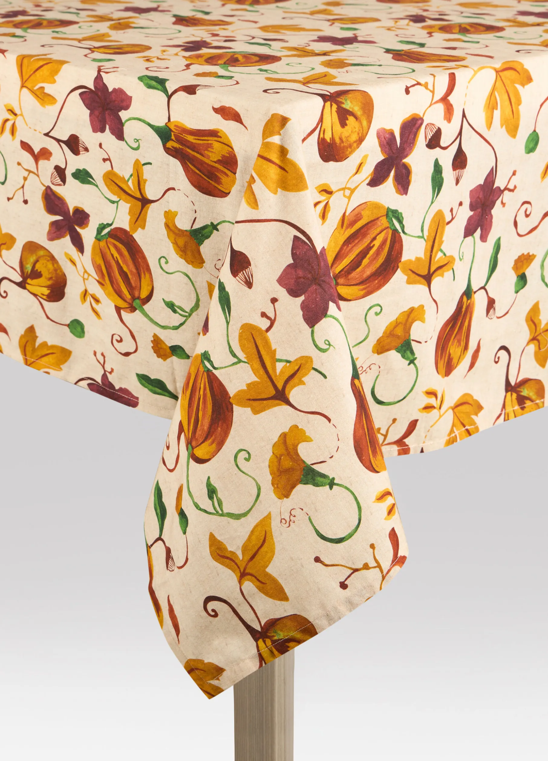 Tovaglia da cucina rotonda, ideale per massimo 8 persone, realizzata in puro cotone bianco e arricchita da un motivo autunnale realizzato con stampa digitale che riproduce gli ortaggi e i colori tipici di questa stagione. Diametro: 180 cm.