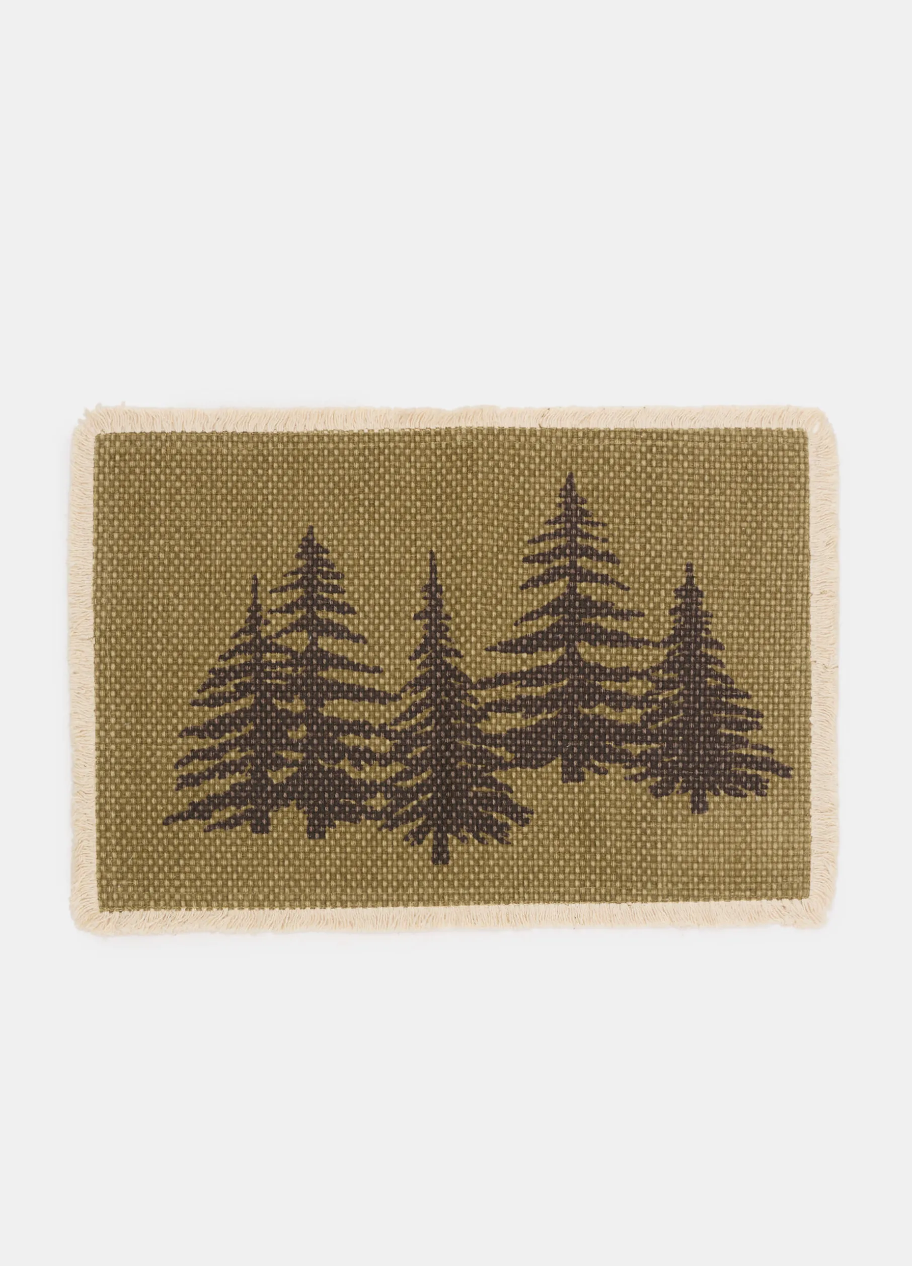 Tovaglietta da colazione rettangolare in morbido cotone intrecciato verde e beige: la trama evidente e la texture vaporosa del filato regalano un fascino boho-chic a questo accessorio, completato da frange su tutti i lati e dalla decorazione a contrasto con abeti. Dimensioni: 48 x 33 cm.