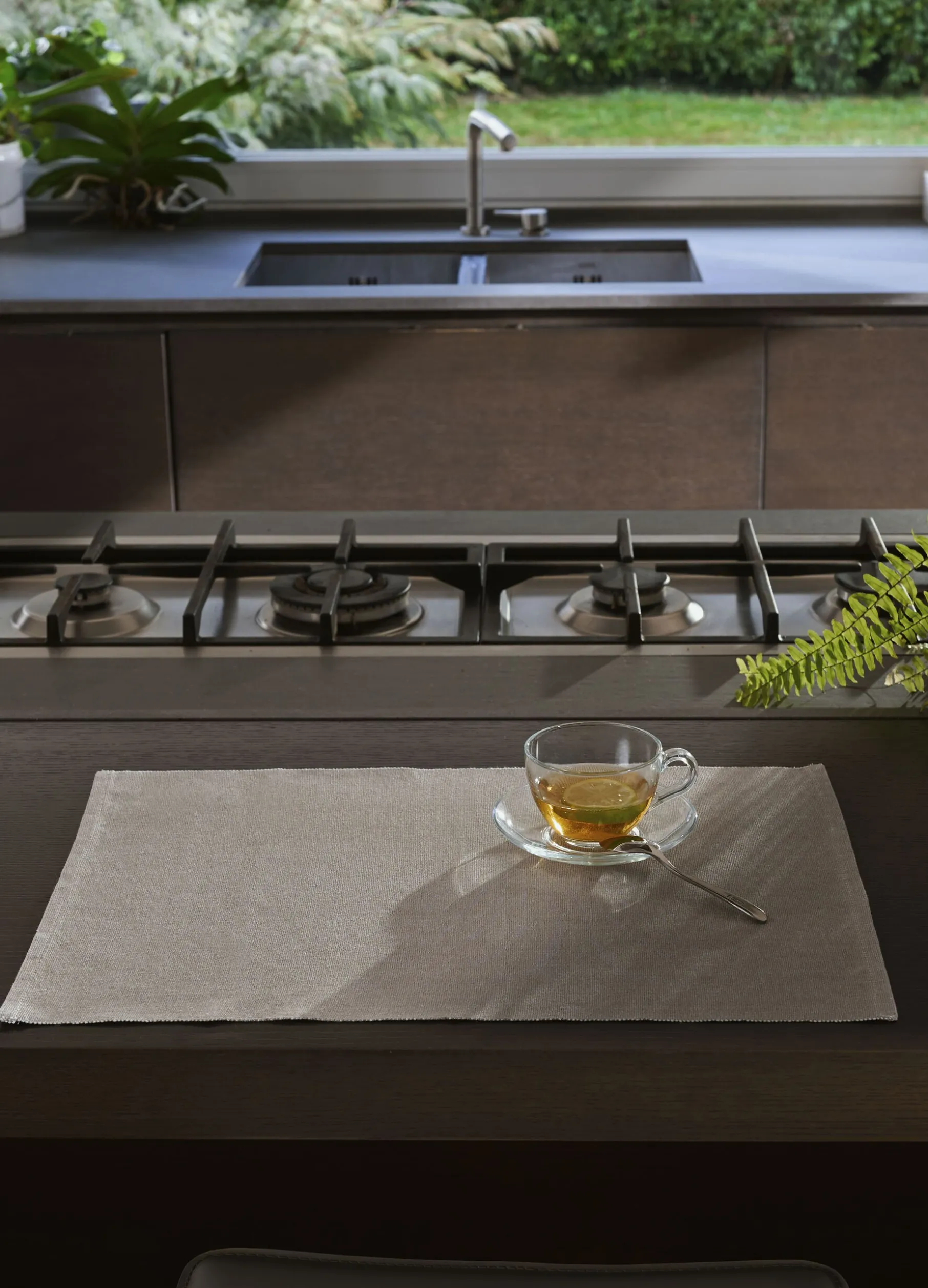 Tovaglietta americana rettangolare in cotone dalla texture leggermente grezza. Il tessuto è resistente e performance e declinato in una delicata tonalità di beige mélange.