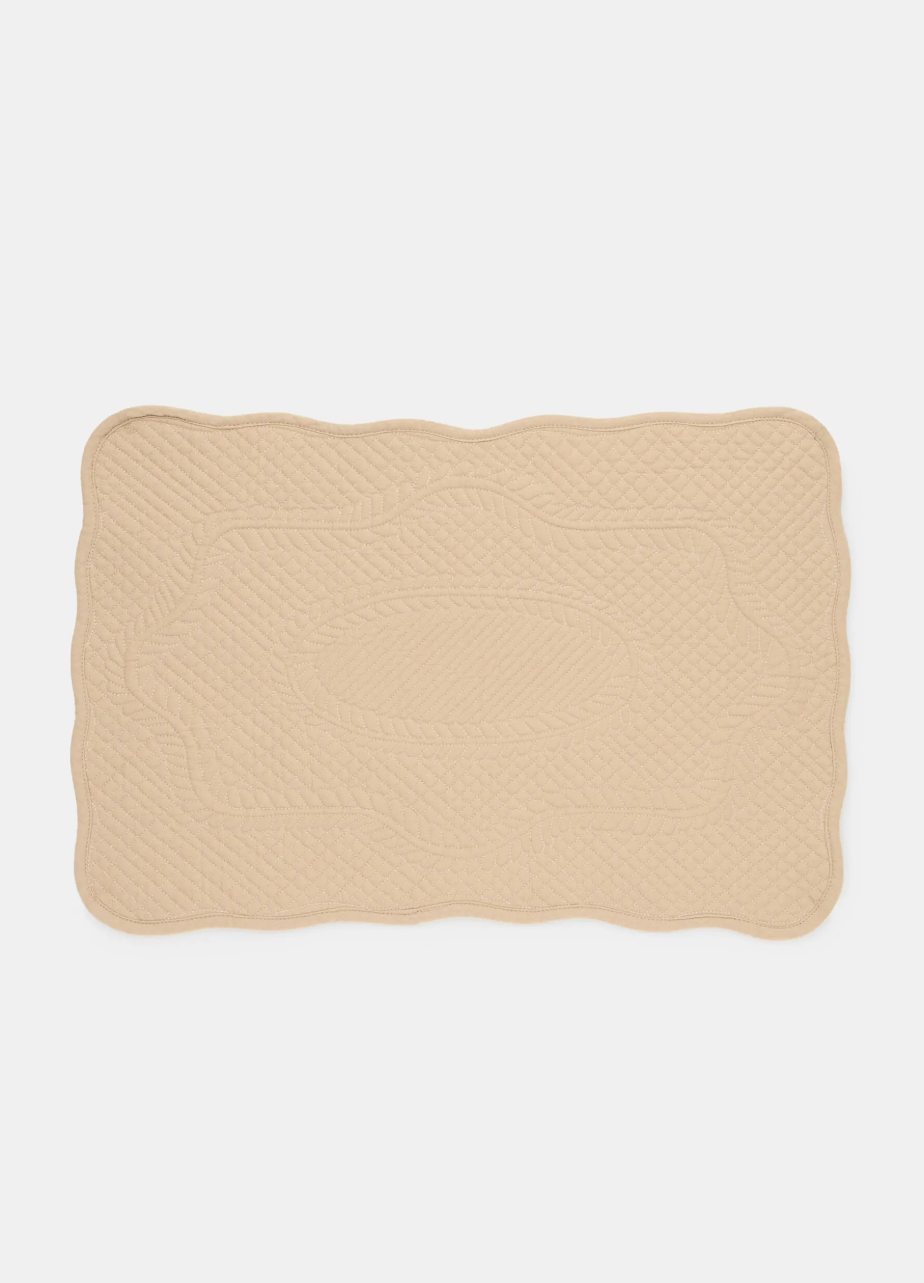 Tovaglietta americana rettangolare di ispirazione classica: declinata in puro cotone lavato grigio tortora, si distingue per una lavorazione trapuntata del tessuto, per l’orlo ondulato e per il motivo botanico in rilievo tono su tono. Dimensioni: 50 x 35 cm.