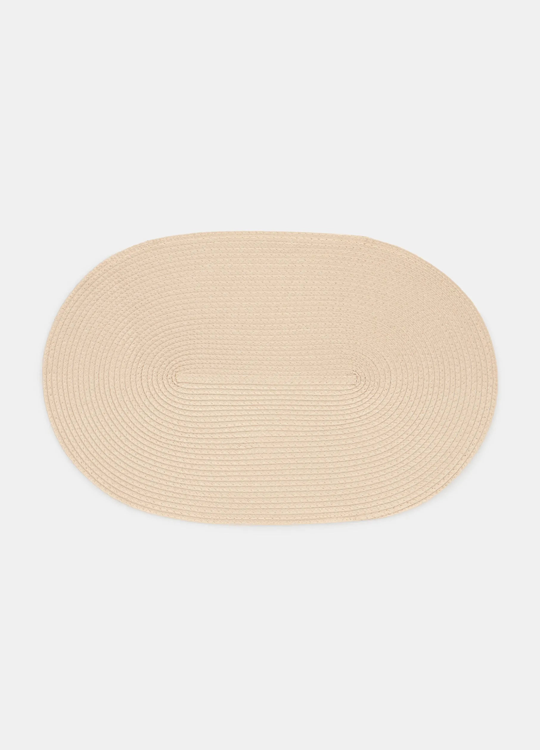 Tovaglietta americana di forma ovale in tessuto color crema intrecciato. La particolare lavorazione crea un effetto a spirale, sottolineato dalle cuciture a vista. Dimensioni: 45 x 30 cm.