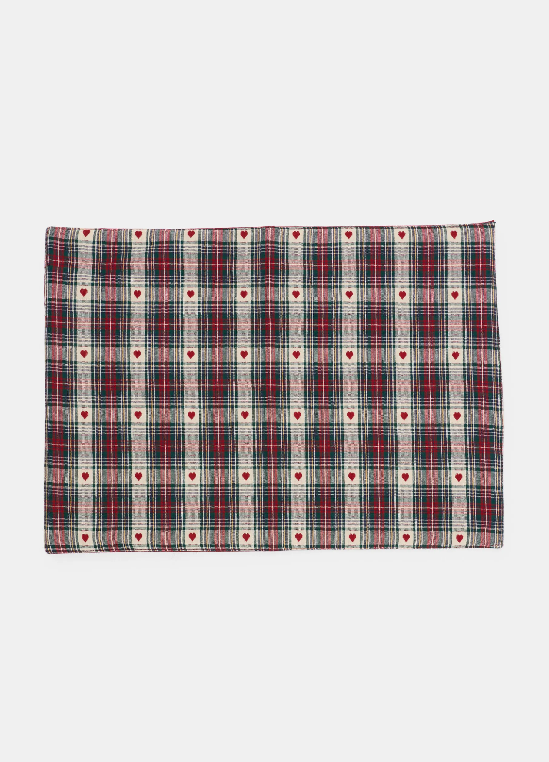 Tovaglietta americana in puro cotone, di forma rettangolare, arricchita dalla colorazione a scacchi nei toni del bianco sporco, verde intenso e bordeaux. Il tessuto versatile e resistente è completato da un dettaglio romantico. Dimensioni: 50 x 35 cm.