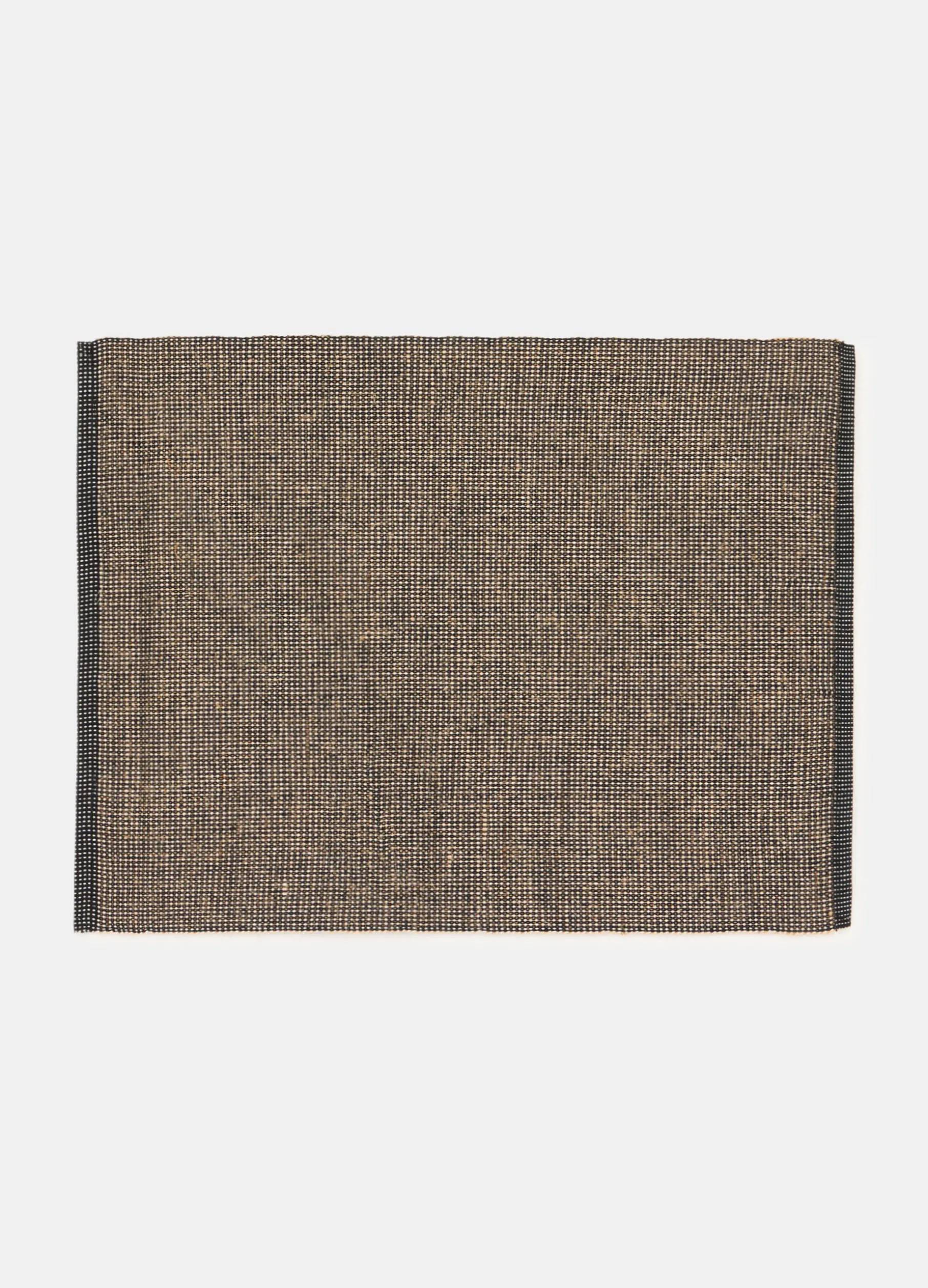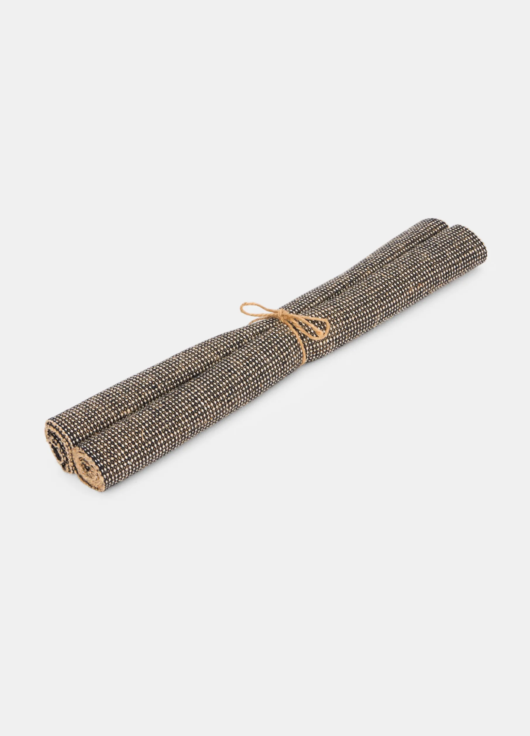 Tovaglietta americana di forma rettangolare realizzata intrecciando fibre di iuta e cotone fino a creare una rete resistente e facile da pulire, nei toni del nero, bianco e marrone chiaro. Dimensioni: 45 x 35 cm.