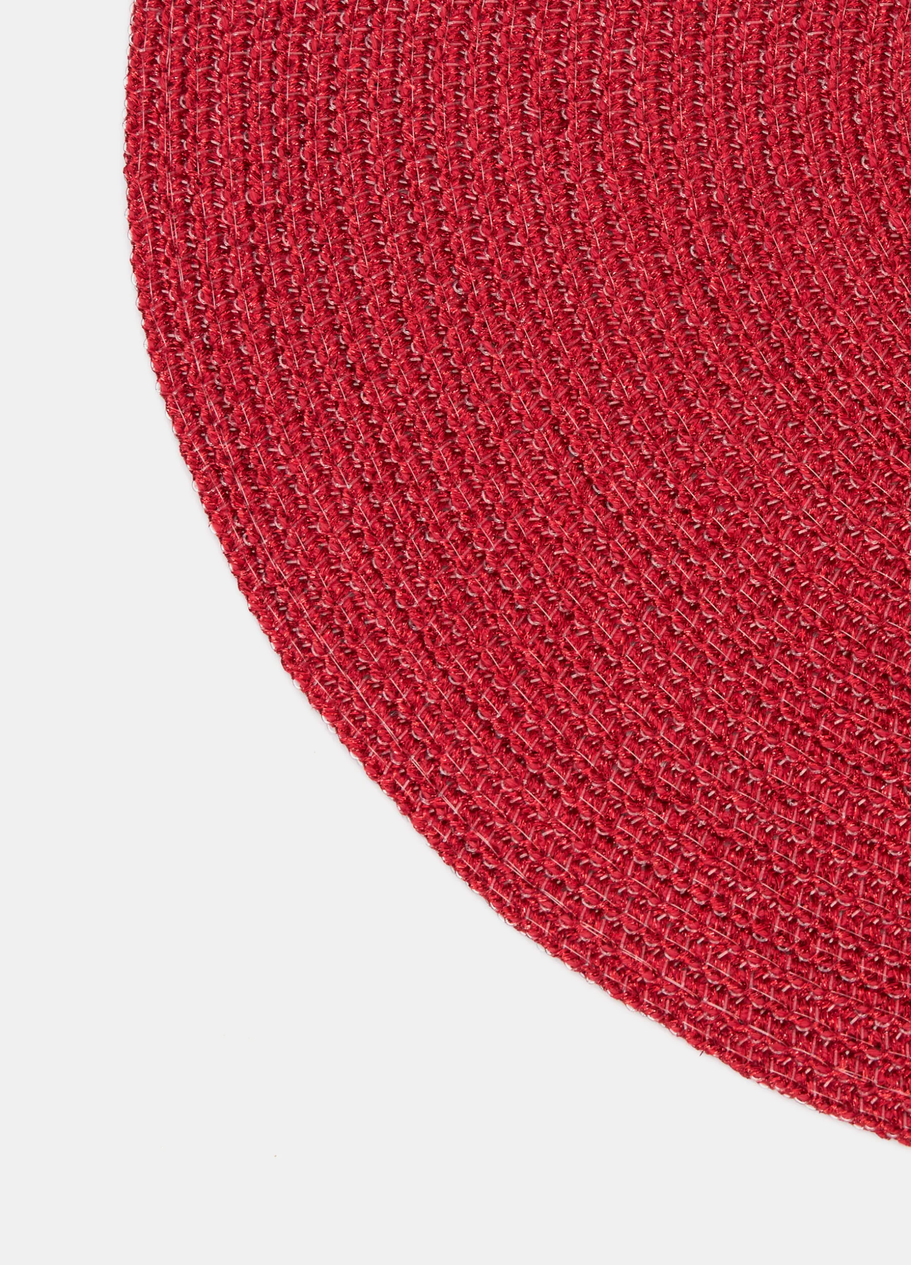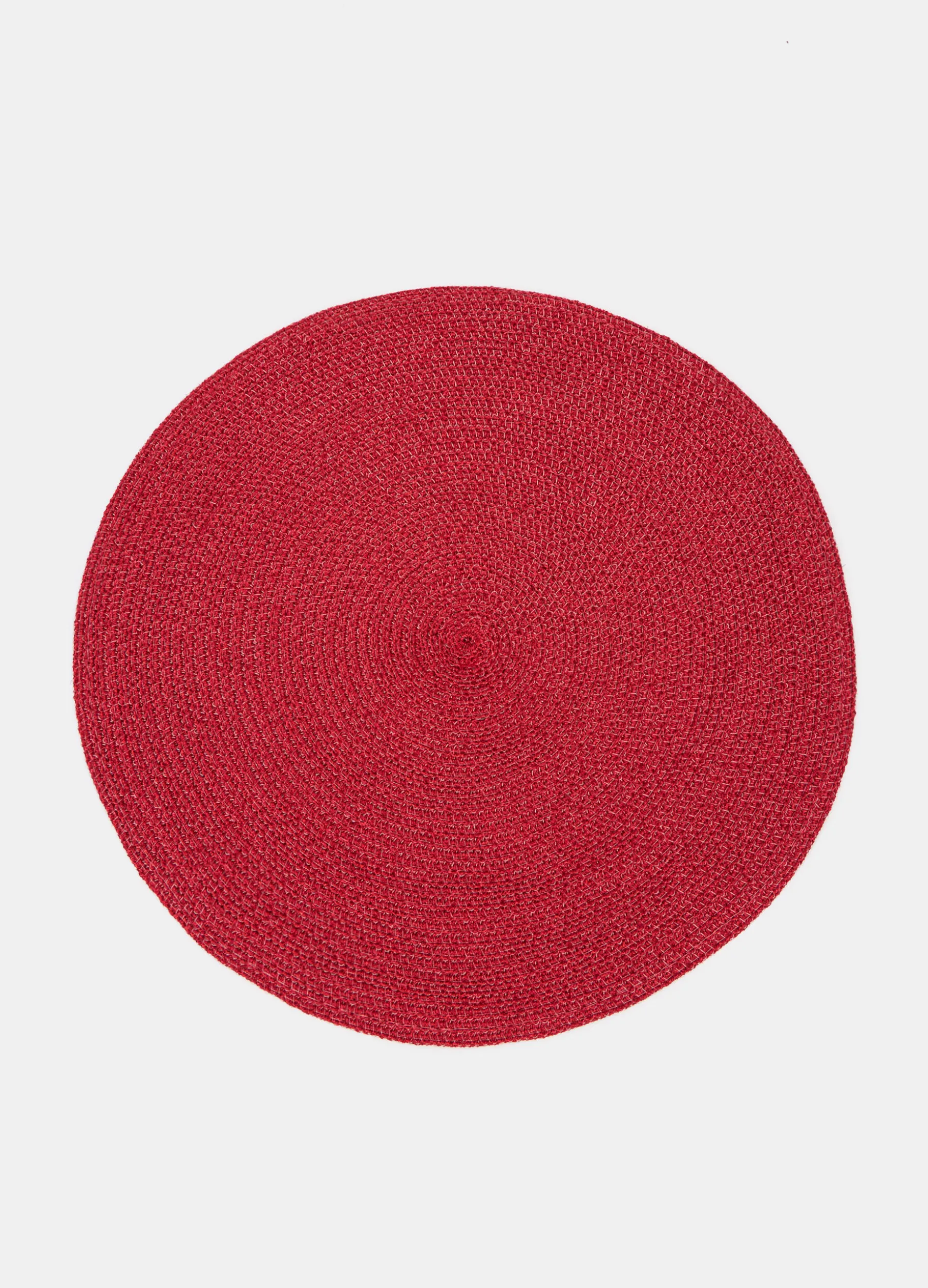 Tovaglietta da colazione rotonda in tonalità rosso acceso, realizzata intrecciando a spirale corde un materiale duraturo e resistente con fili metallizzati che riflettono la luce, richiamando l’atmosfera allegra delle feste. Diametro: 38 cm.