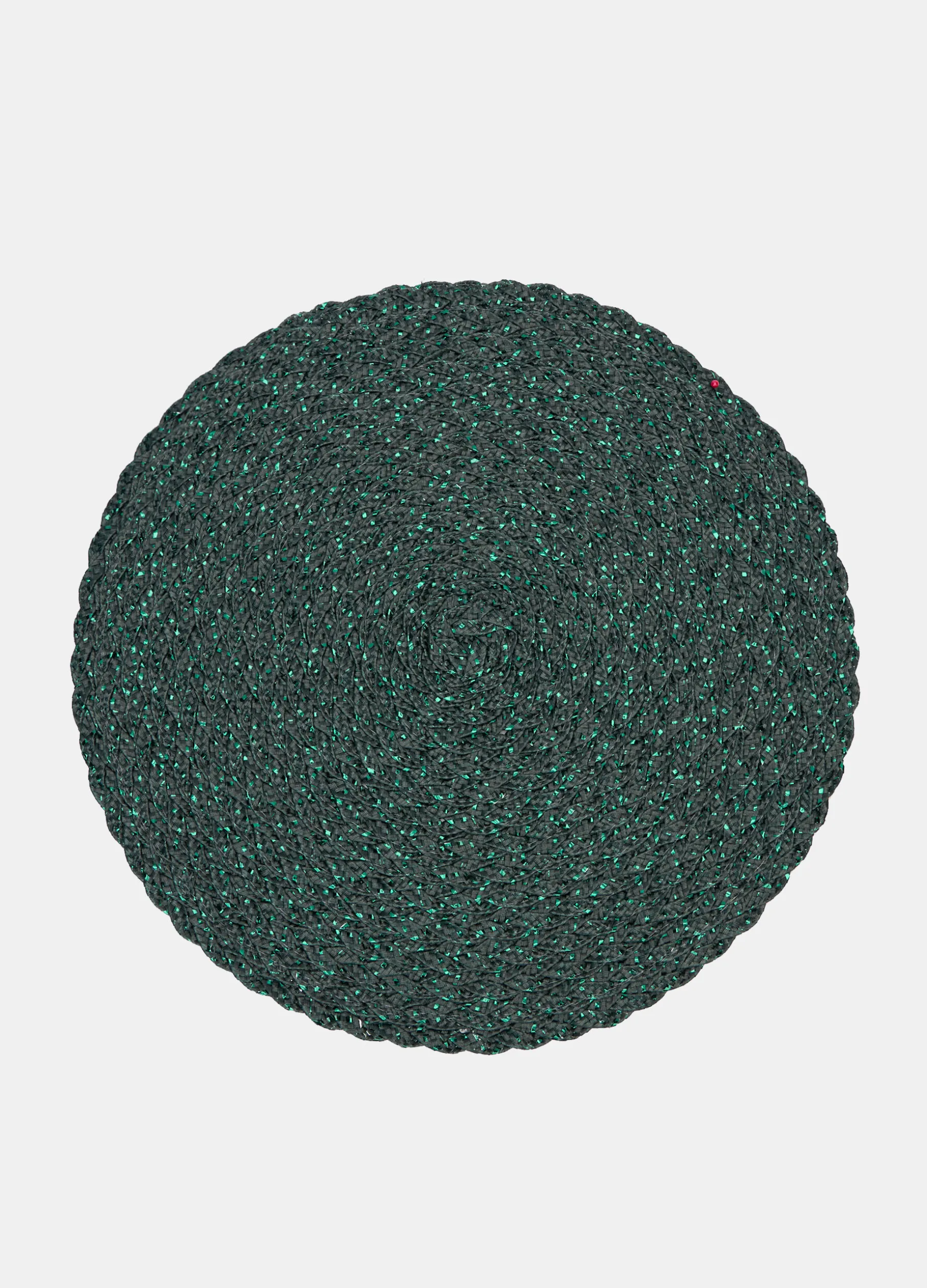 Tovaglietta rotonda verde intenso, ideale per la colazione o per un pasto veloce, realizzata intrecciando in una spirale crescente fibre resistenti e versatili, unite all’inserto di fili metallizzati che riflettono la luce creando un’atmosfera allegra e festosa. Diametro: 38 cm.