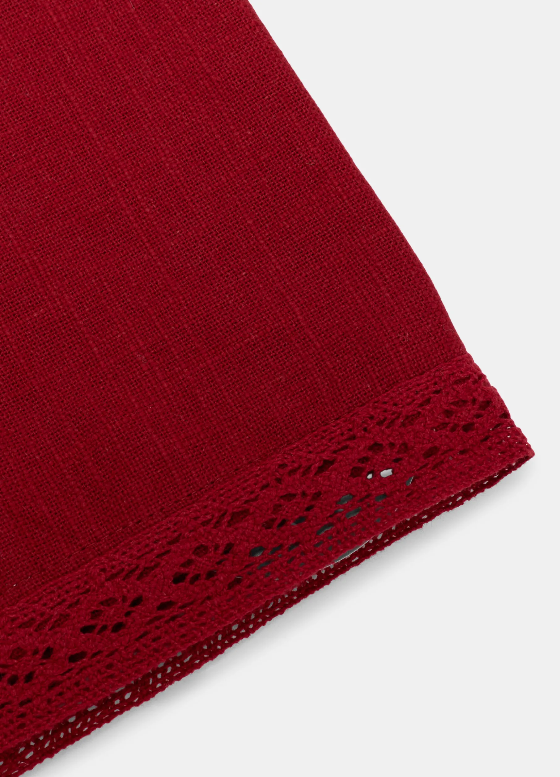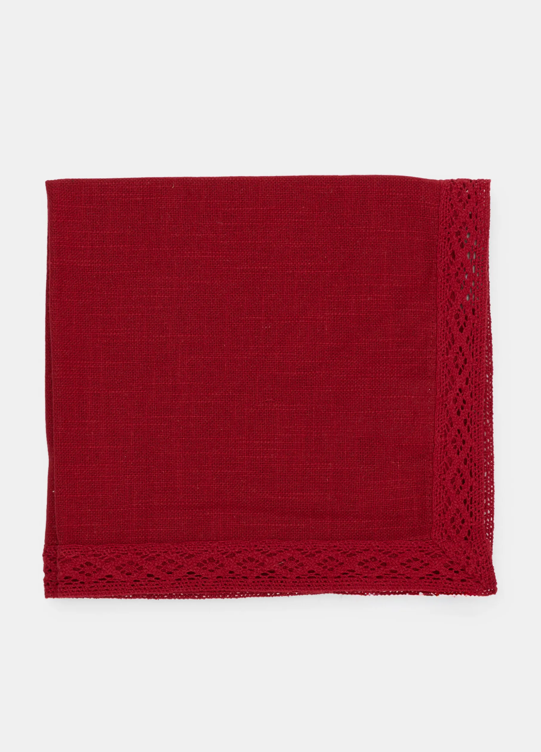 Tovagliolo quadrato, abbinato alla tovaglia, realizzato in puro cotone rosso bordeaux, caratterizzato da una texture irregolare e leggermente in rilievo. Completato lungo tutto il bordo da un orlo all’uncinetto tono su tono. Dimensioni: 42 x 42 cm.