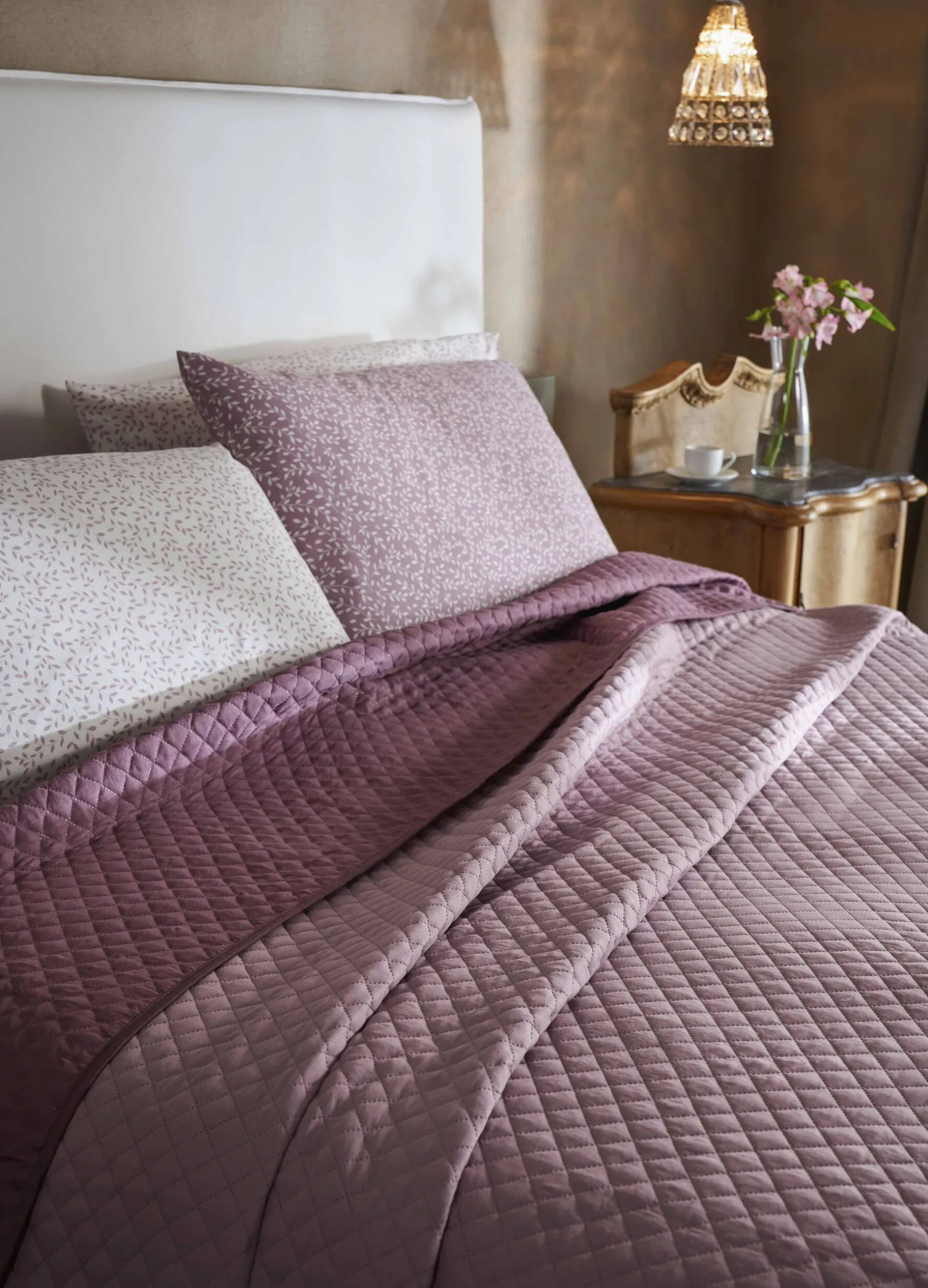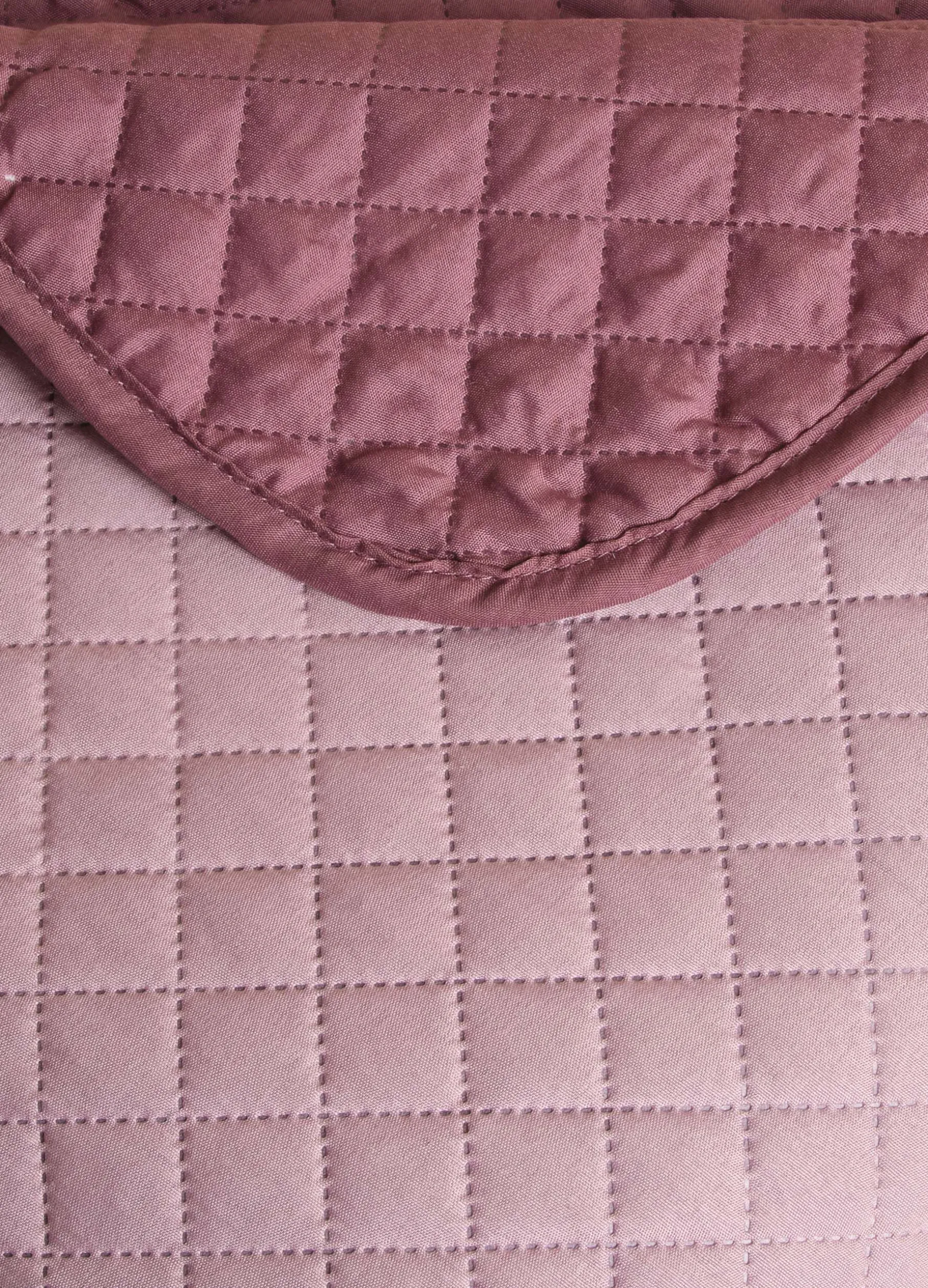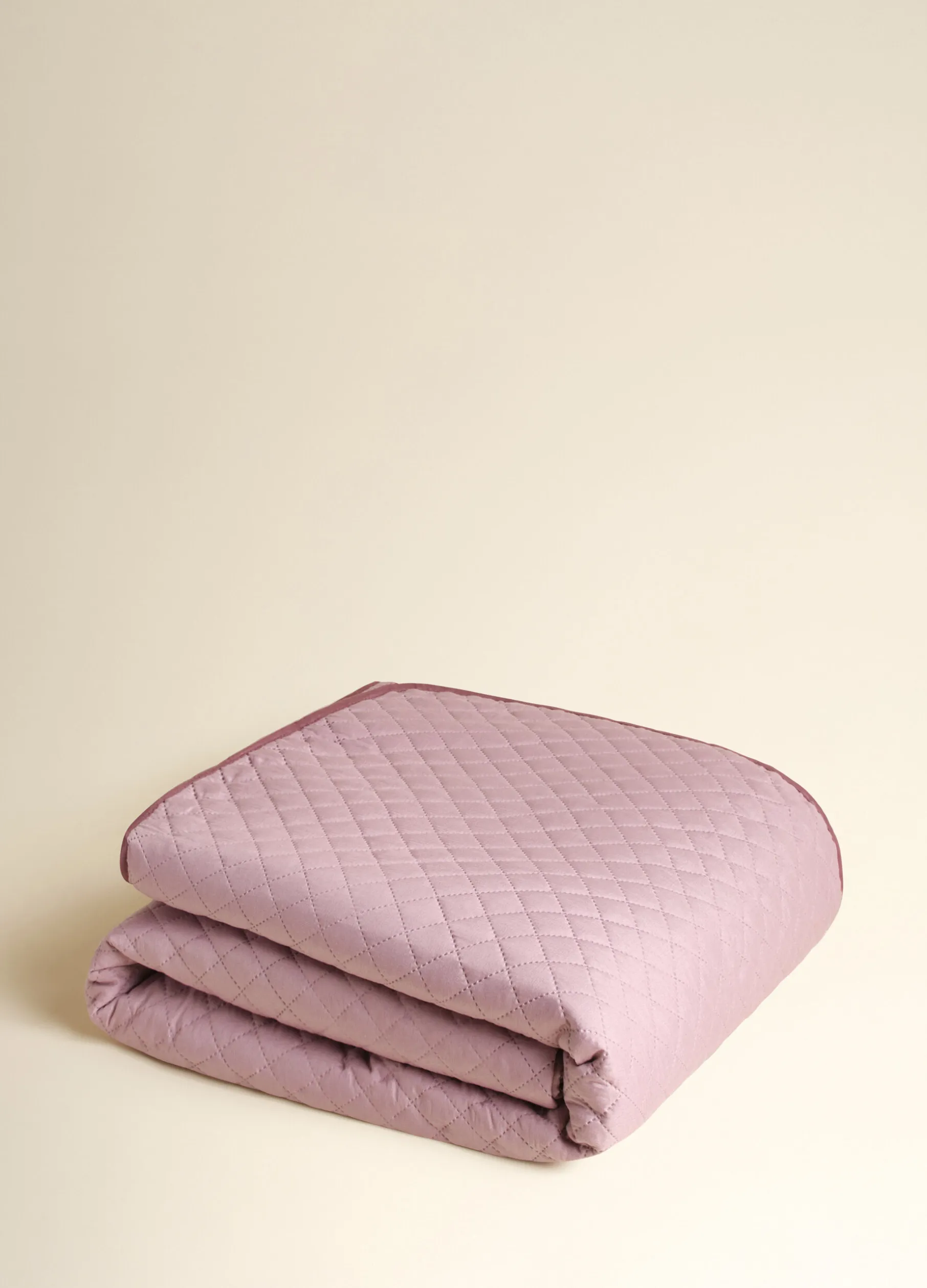 Coperta trapuntata per letto matrimoniale in tessuto viola chiaro e delicato, con le classiche cuciture a rombi. Completata dal profilo a contrasto viola scuro.
