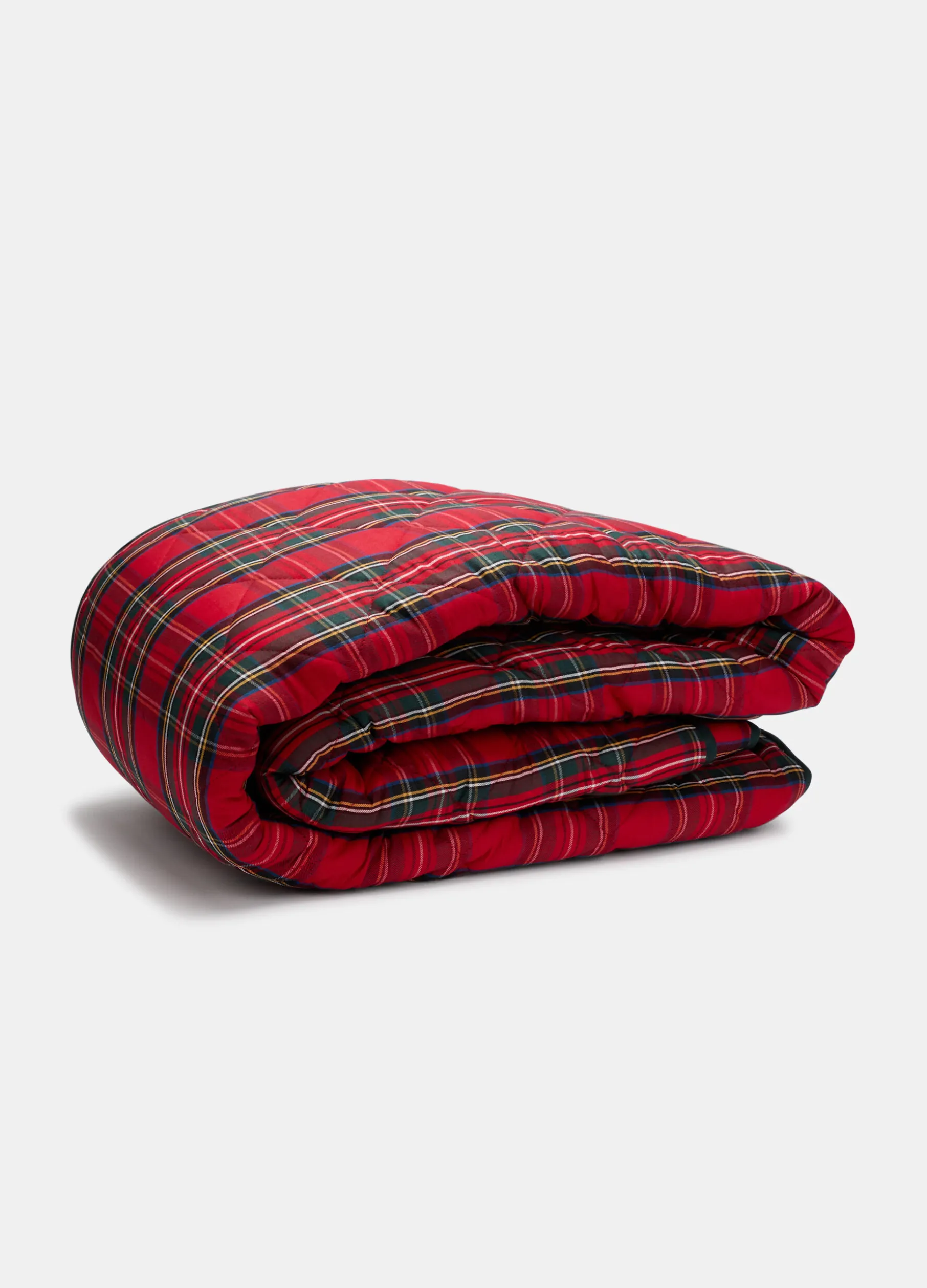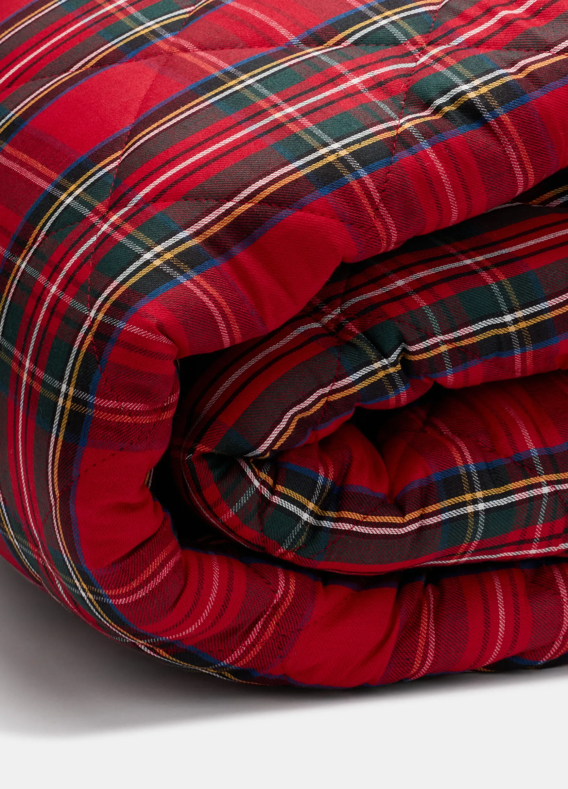 Trapunta matrimoniale, ideale per letti a due piazze, rivestita in puro cotone tinto filo: la particolare tecnica di colorazione permette di creare il motivo a scacchi rossi intrecciando fili di tonalità diverse. Completata da un’imbottitura leggera e dalla classica trapuntatura a rombi. Dimensioni: 250 x 250 cm.