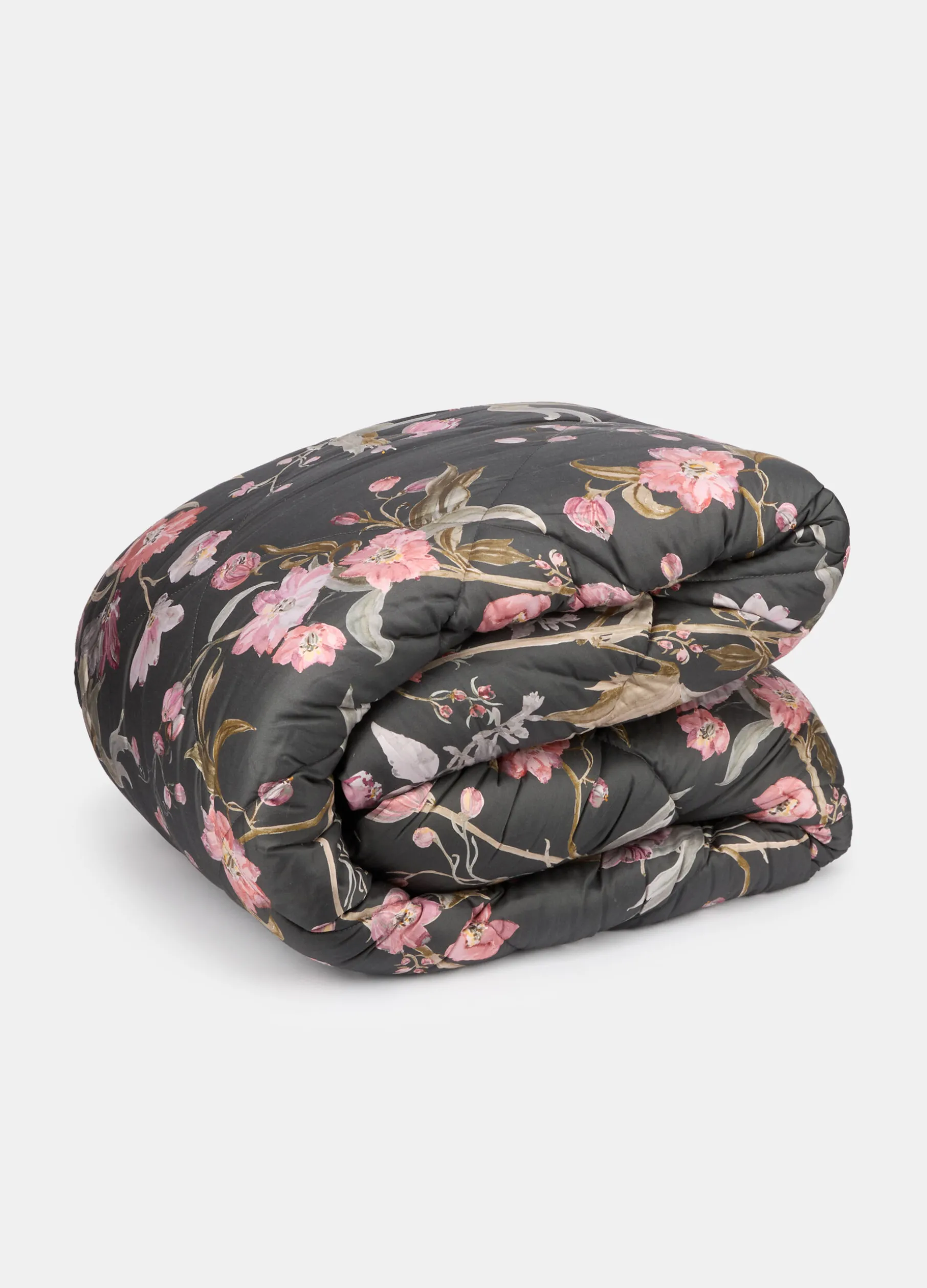 Trapunta imbottita a due piazze per letto matrimoniale, caratterizzata dal motivo a fiori chiari sullo sfondo nero in raso di cotone. La particolare tessitura del filato rende questo tessuto liscio e fresco al tatto, e luminoso, perfetto per garantire comfort e riposo. Dimensioni: 260 x 250 cm.