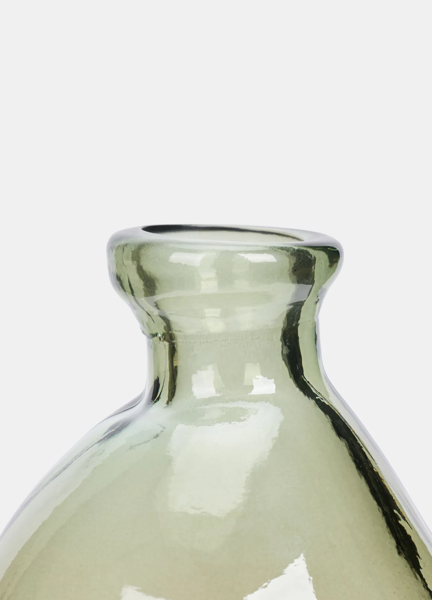 Vaso alto e sottile realizzato in vetro trasparente e arricchito da una leggera tinta verde chiaro. La particolare forma oblunga è irregolare e asimmetrica, con collo stretto simile a una bottiglia. Altezza: 35 cm; diametro: 13 cm; capacità: 1 L.