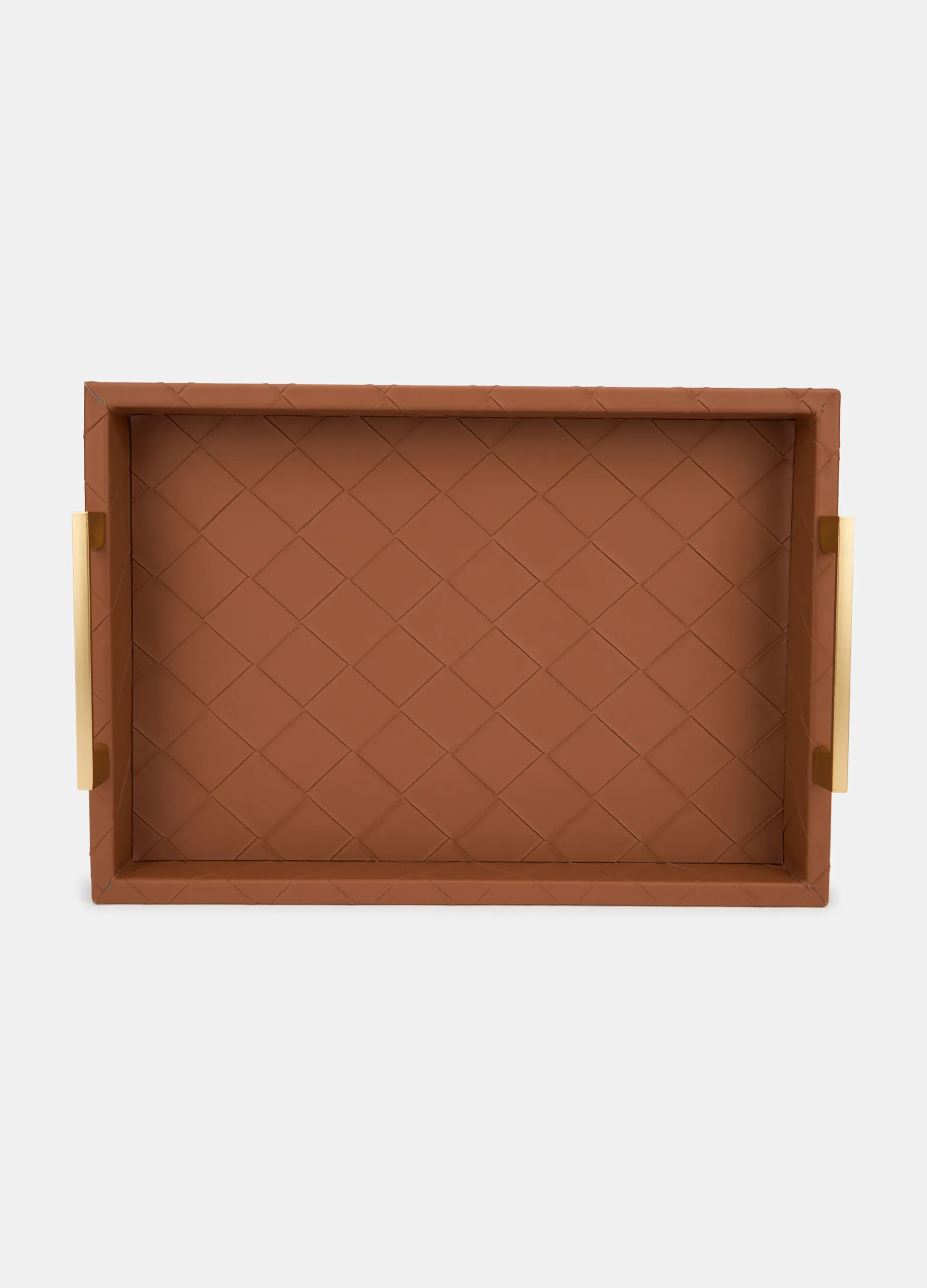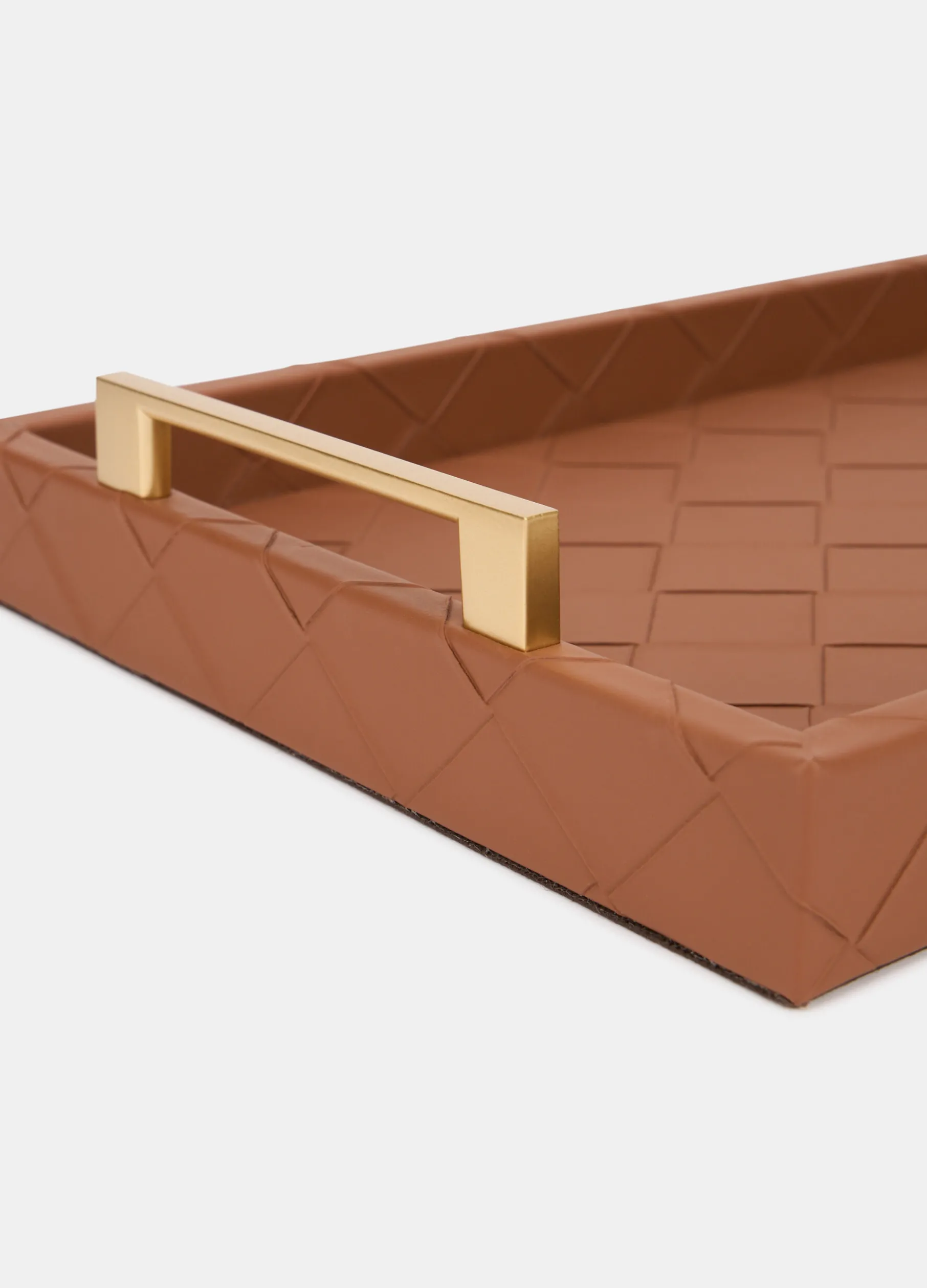 Vassoio rettangolare dal gusto ricercato rivestito in ECOpelle dalla colorazione marrone intenso e caldo. Il materiale è intrecciato per creare una texture unica, in contrasto con la finitura lucida dei manici in metallo. Dimensioni: 30 x 43 x 6,7 cm.