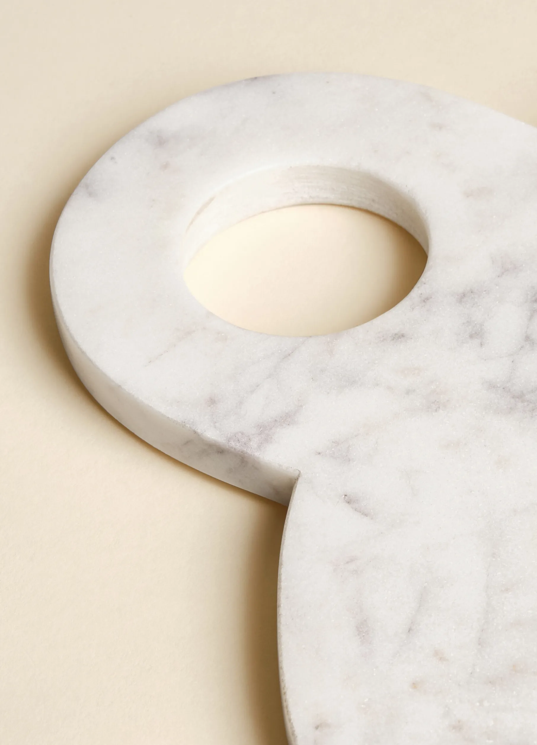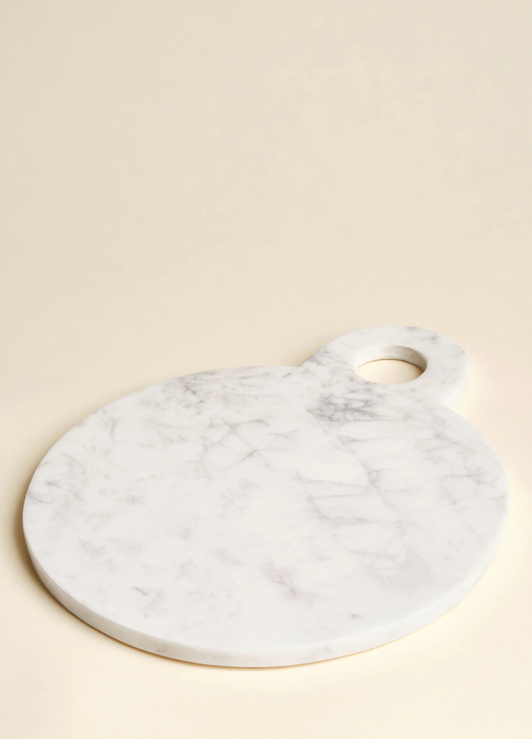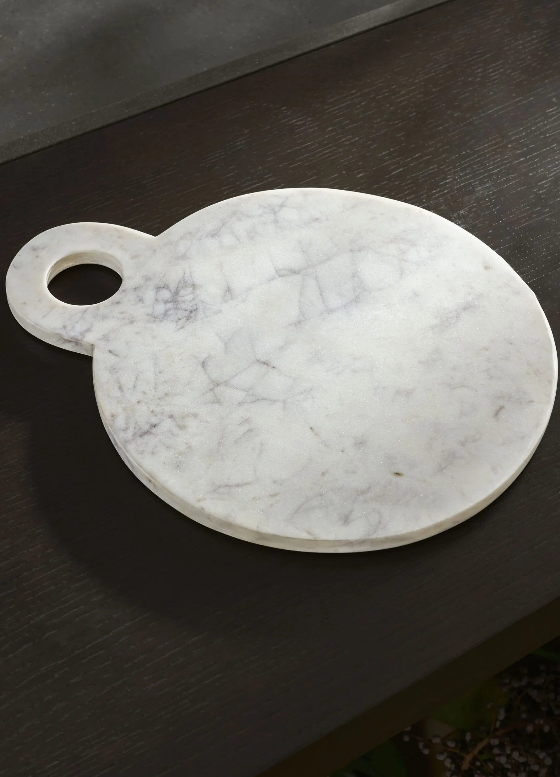 Vassoio rotondo, perfetto per servire antipasti, aperitivi e portate condivise, realizzato in marmo bianco dalle delicate venature grigie. Grazie al suo look elegante e ricercato, completato da piccolo manico con foro, svolge la doppia funzione di utensile e oggetto di arredo.