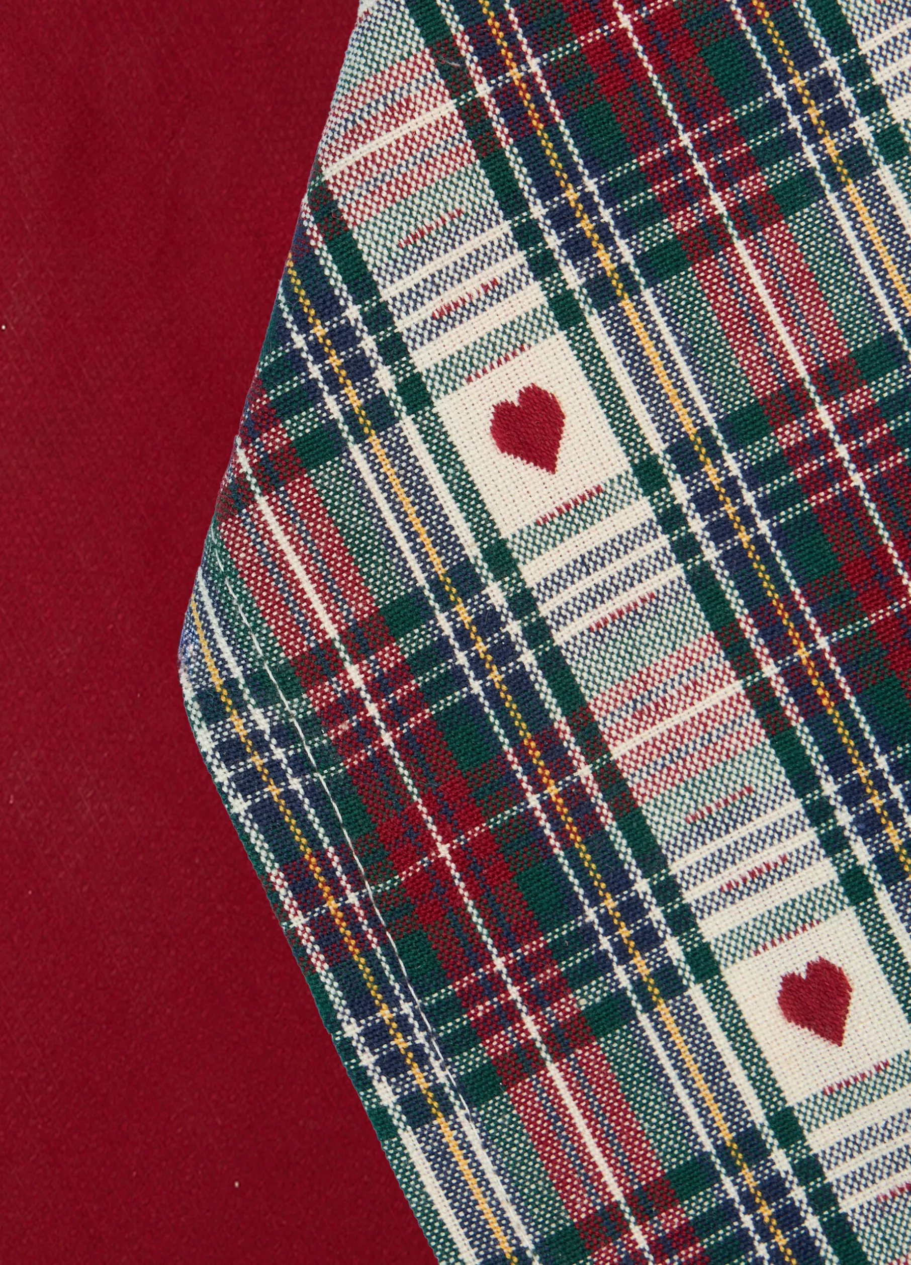 Set da due strofinacci da cucina, abbinati ai tessili tavola, realizzati in pura tela di cotone, un materiale resistente dalla caratteristica texture leggermente rustica. Presentati in due versioni: rosso tinta unita e a scacchi verde, bianco e rosso con cuoricini. Dimensioni: 70 x 50 cm.