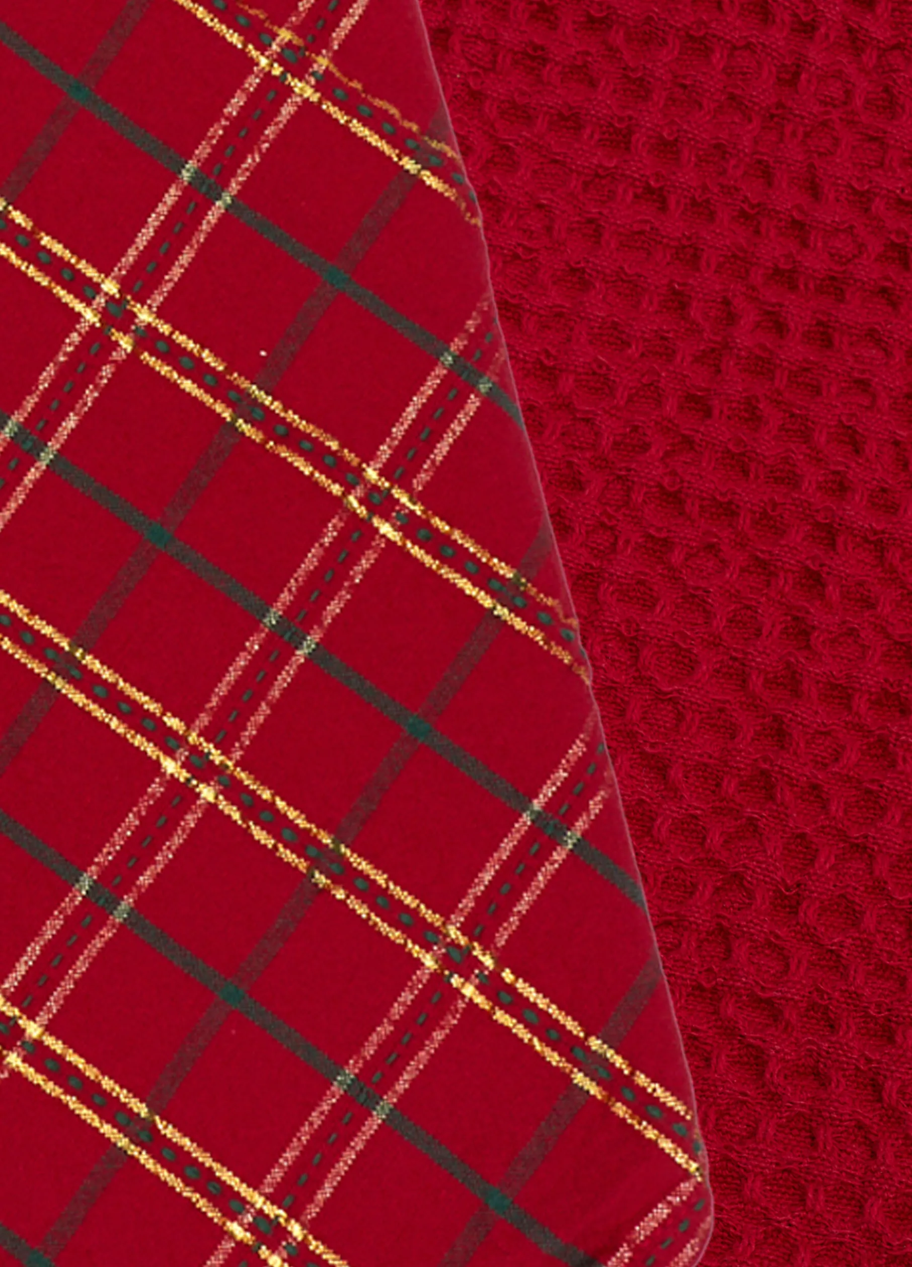 Set con due strofinacci in cotone rosso acceso, perfetti per rallegrare la cucina durante il periodo delle feste, presentati in due varianti: tinta unita con texture a nido d’ape e a quadretti con inserti in filo dorato. Dimensioni: 70 x 50 cm.