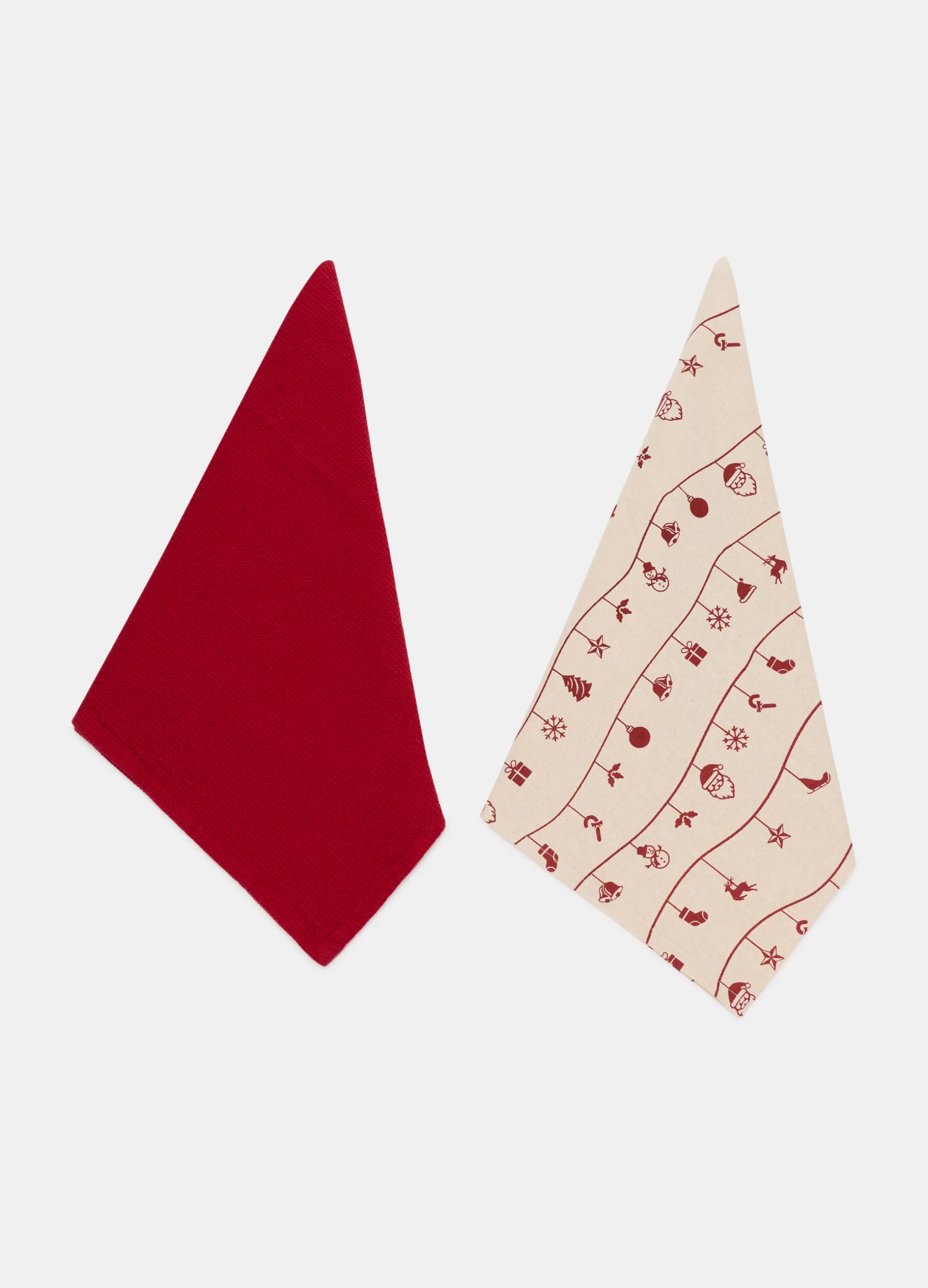 Due strofinacci da cucina in puro cotone, leggero e assorbente, ideali per arricchire l’atmosfera festosa della casa grazie alla colorazione rosso intenso della versione in tessuto a nido d’ape e alla stampa a contrasto con elementi natalizi. Dimensioni: 70 x 50 cm.