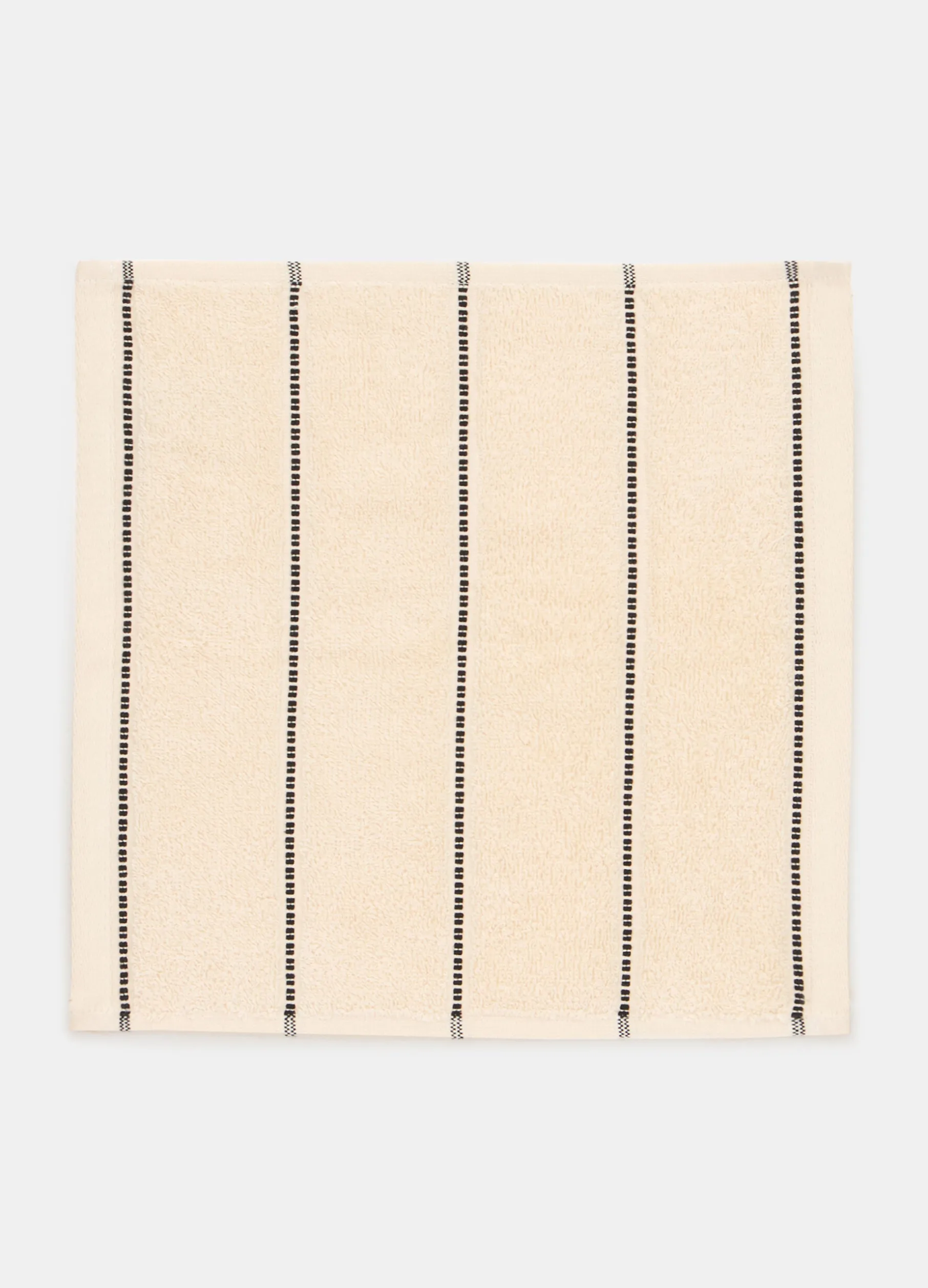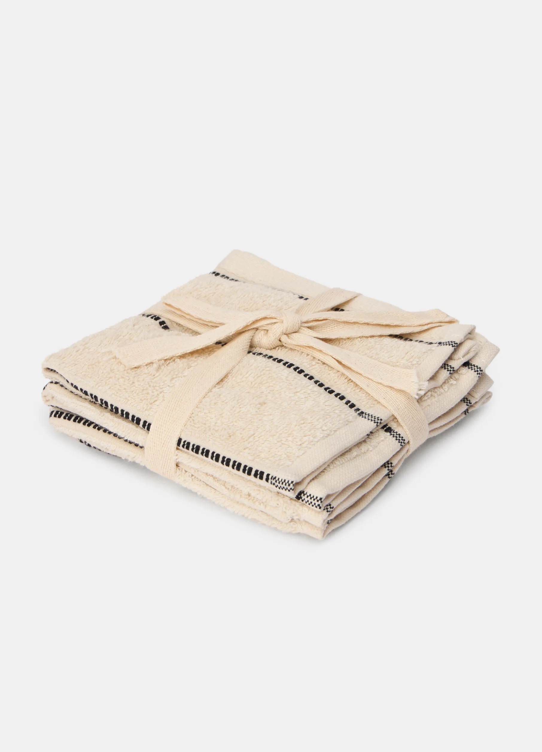 Set da quattro asciugamani piccoli per ospiti in spugna morbida e delicata. La colorazione beige chiaro è arricchita dal motivo a righe sottili più scure a contrasto. Dimensioni: 30 x 30 cm.