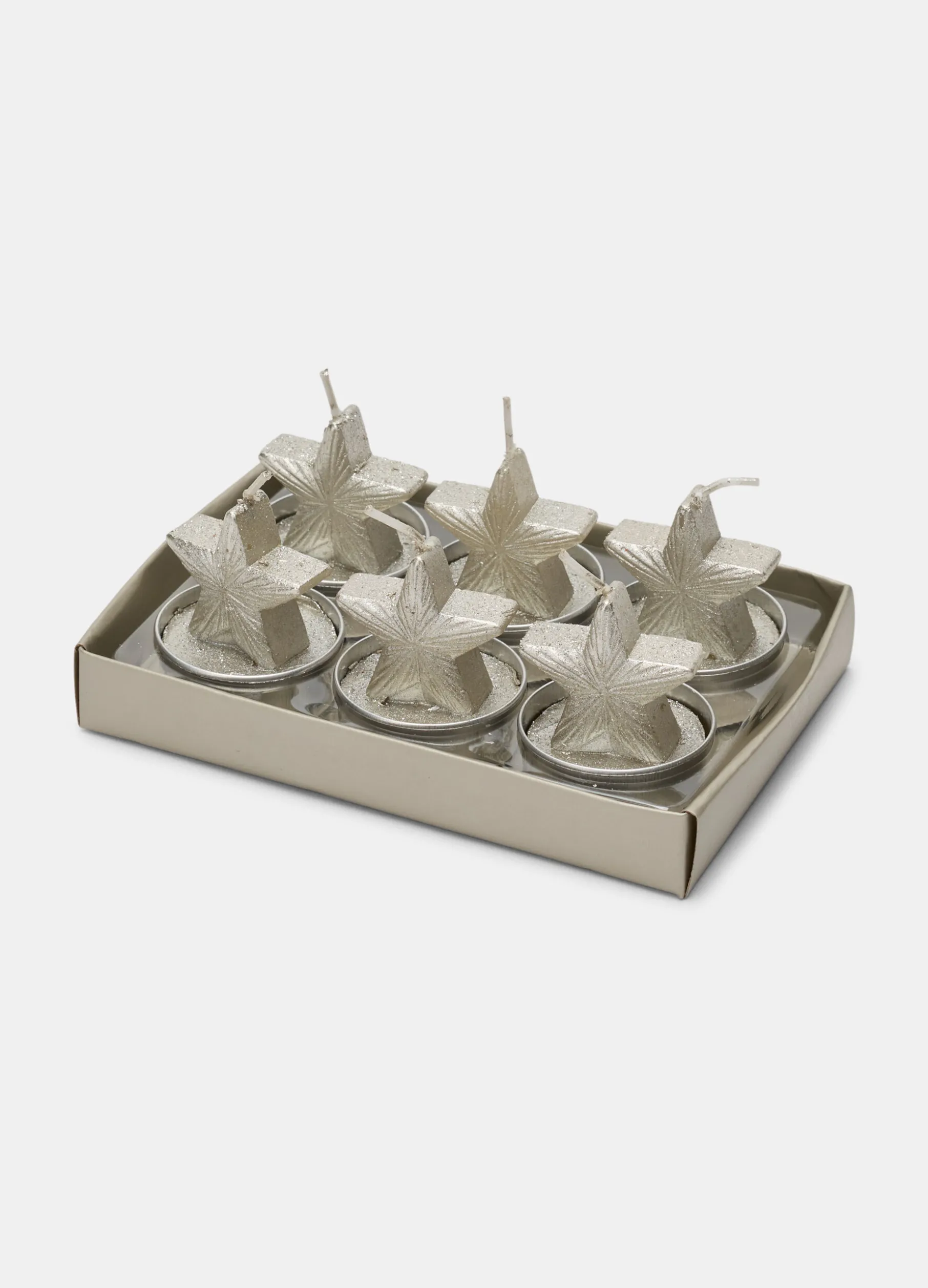 Set da sei candeline decorative a forma di stellina, con base rotonda e contenitore metallico, che accendono di magia e allegria ogni stanza grazie alla finitura argentata. Diametro: 3,8 cm.