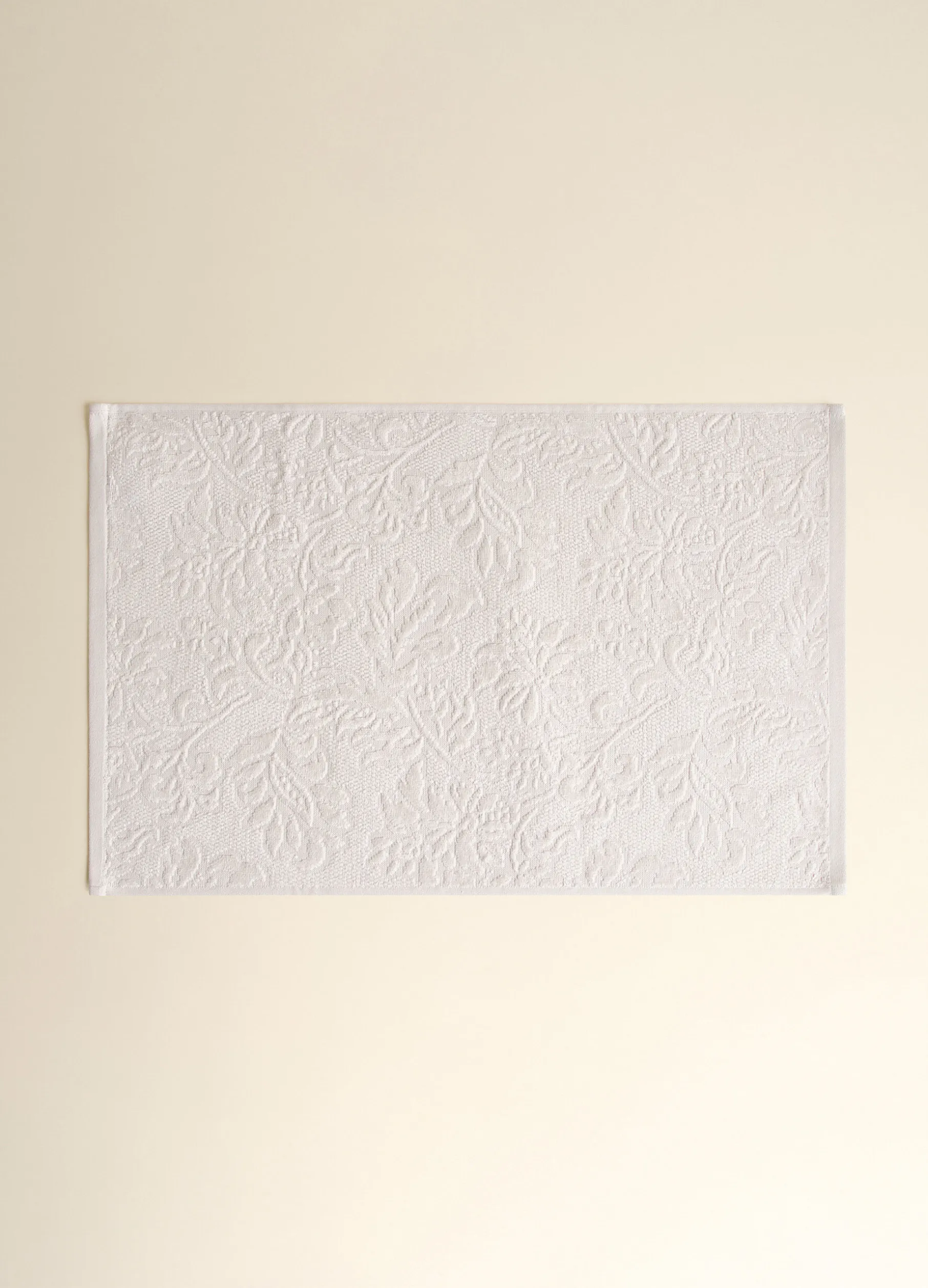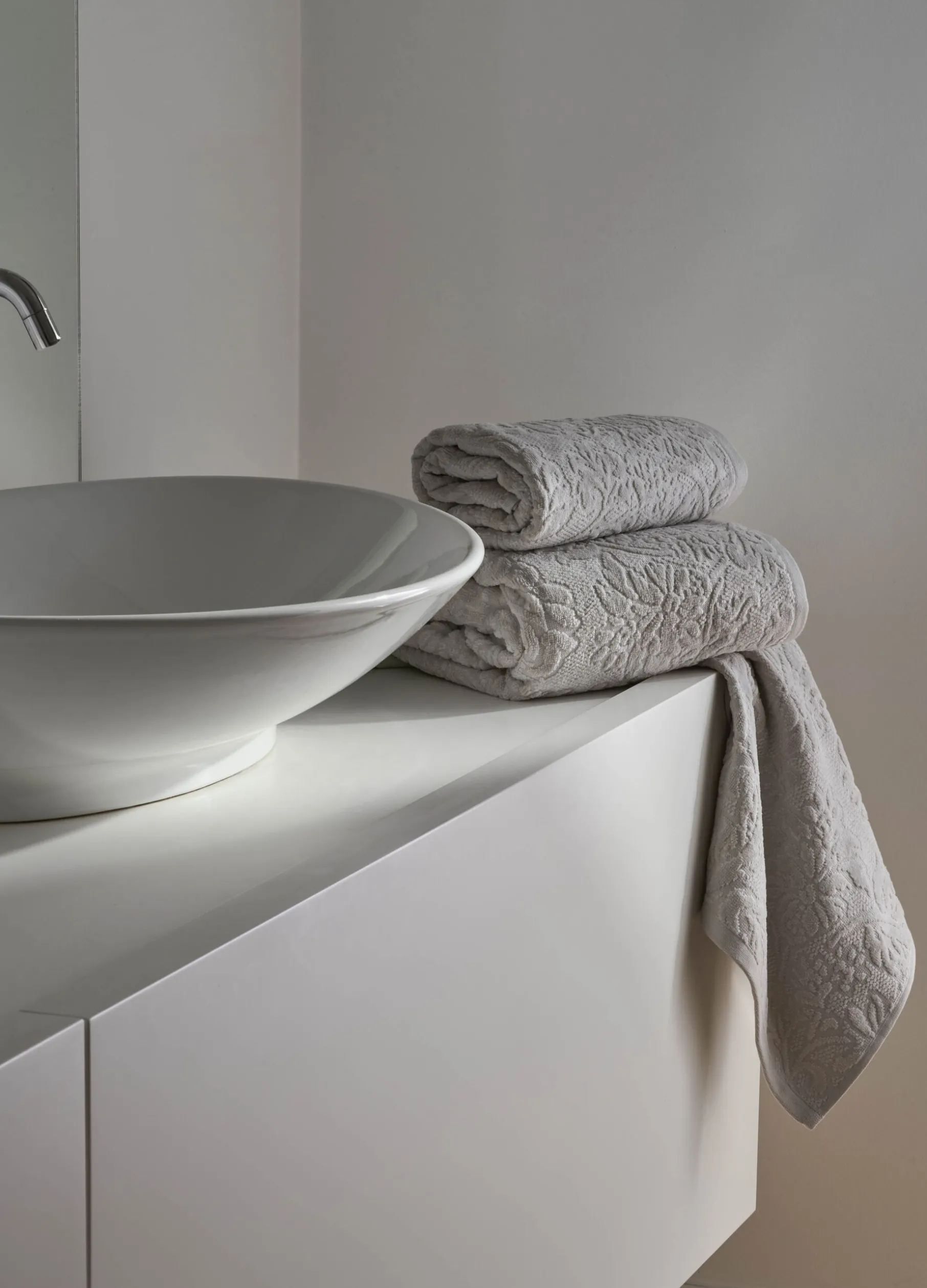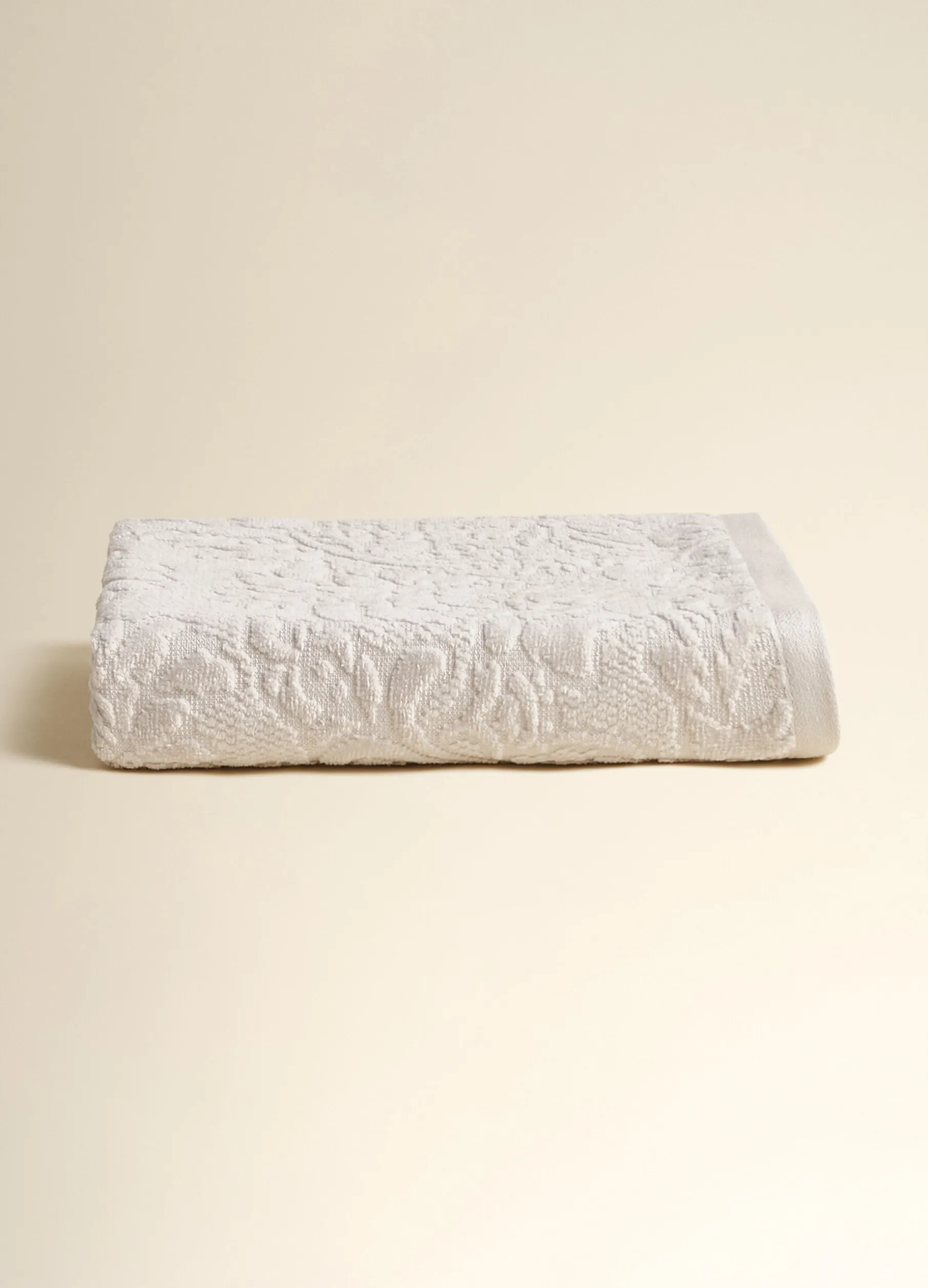 Asciugamano degli ospiti in puro cotone con lavorazione jacquard a motivo floreale. Tinta unita. Dimensioni 60x40cm. Made in Portugal.