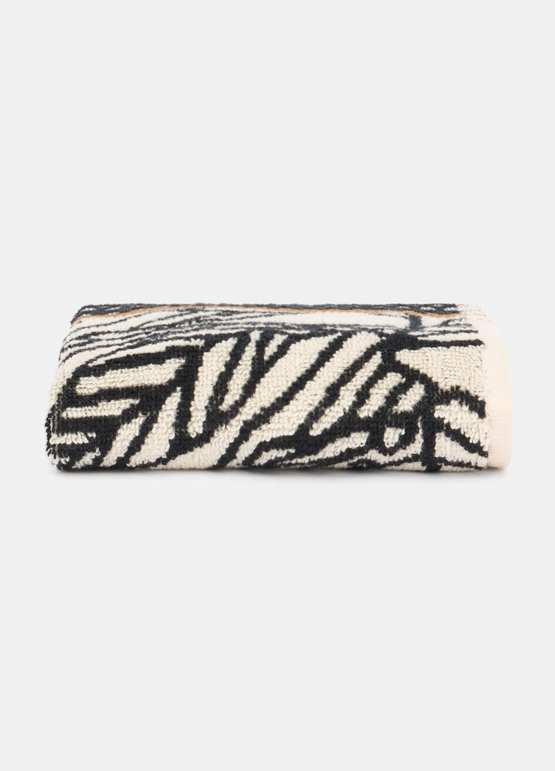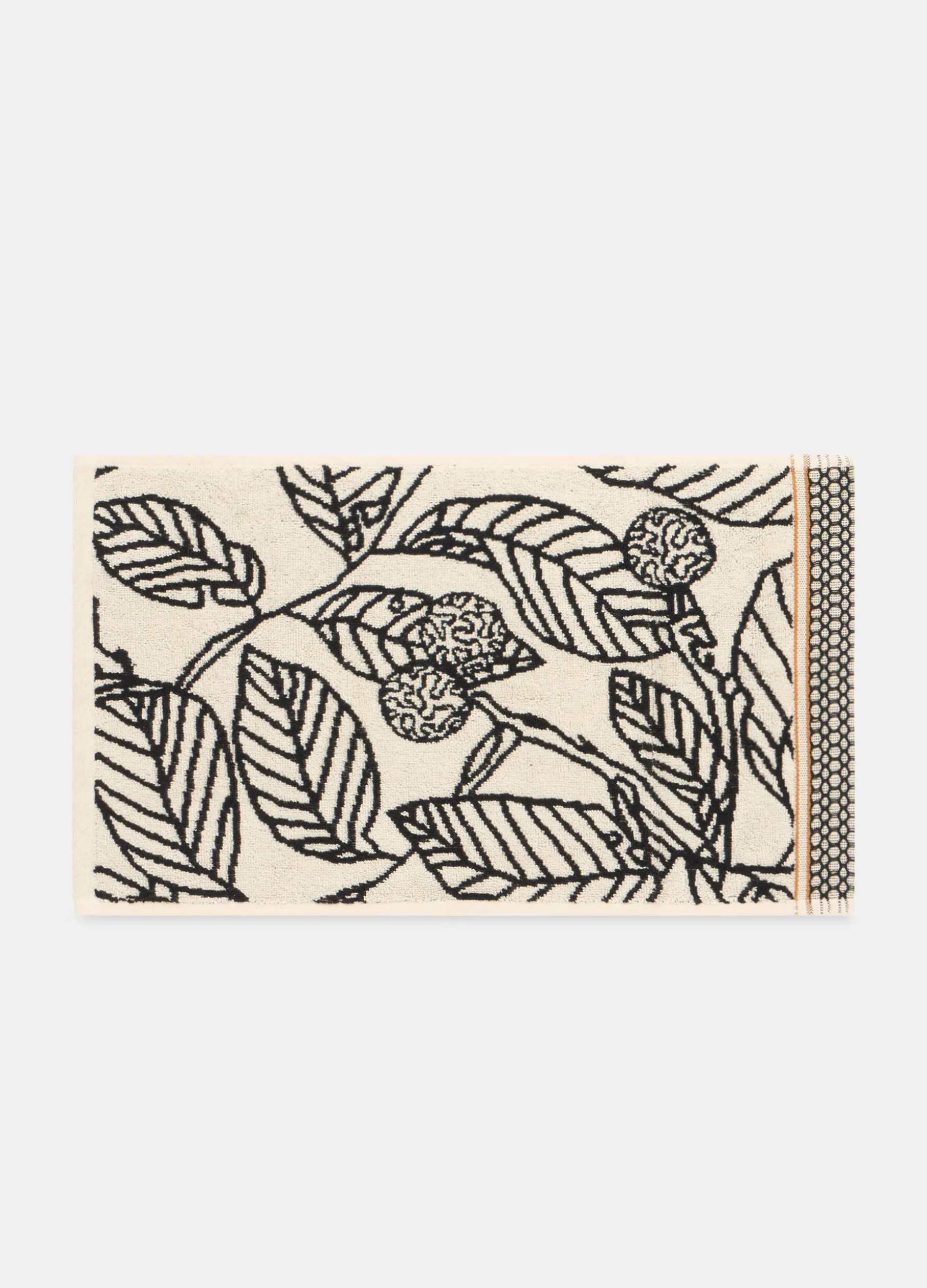 Asciugamano piccolo, dedicato agli ospiti, in morbida spugna beige chiaro. Arricchito da un orlo decorato e dal motivo botanico a contrasto. Dimensioni: 50 x 30 cm.